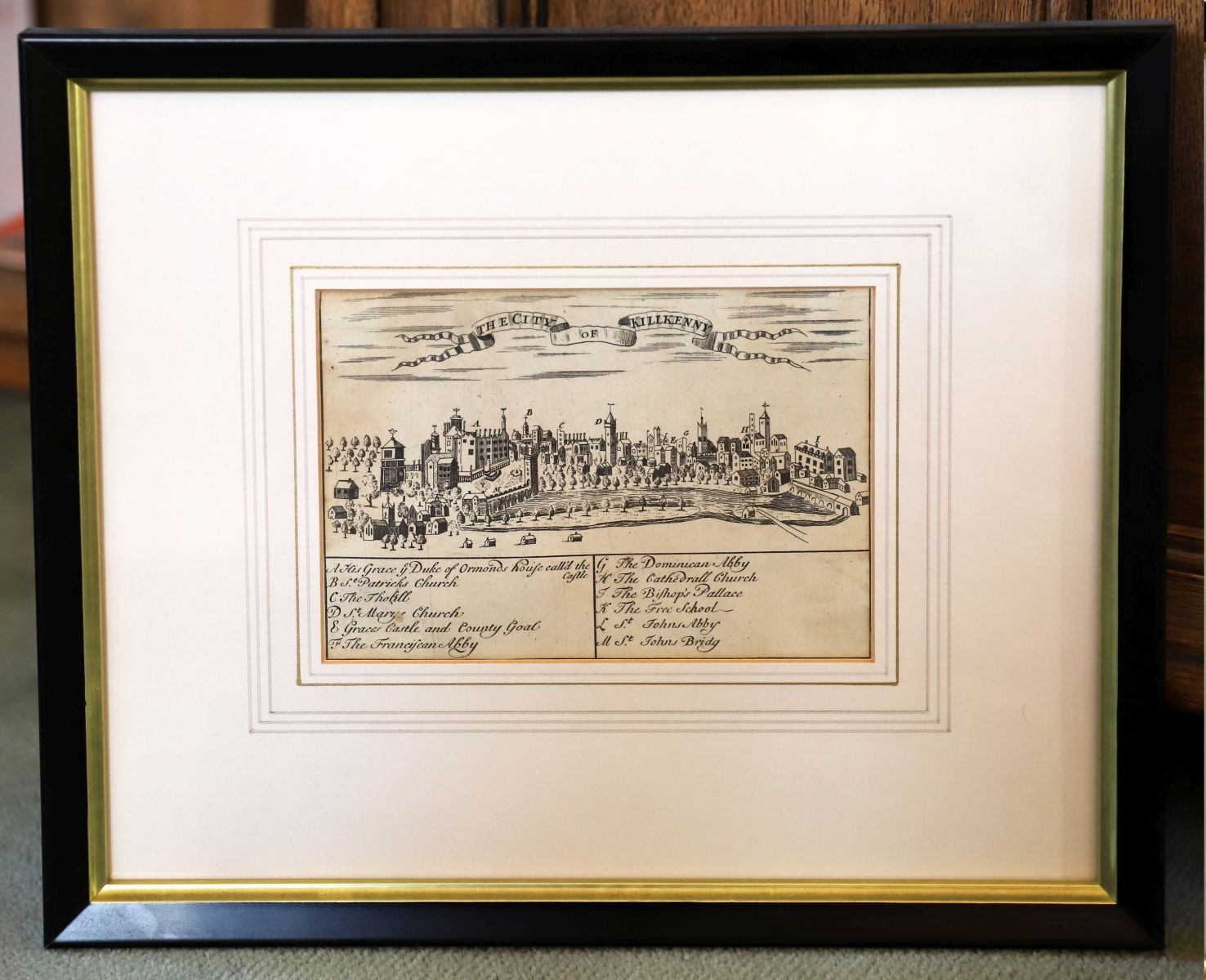 A framed monochrome work depicting a view of Kilkenny City, showing architectural detail along the riverfront, mounted and glazed, in a later frame. Together with a plan and map of Galway, Dublin, Limerick, and Cork. Each created by Georg Braun and Frans Hogenberg.