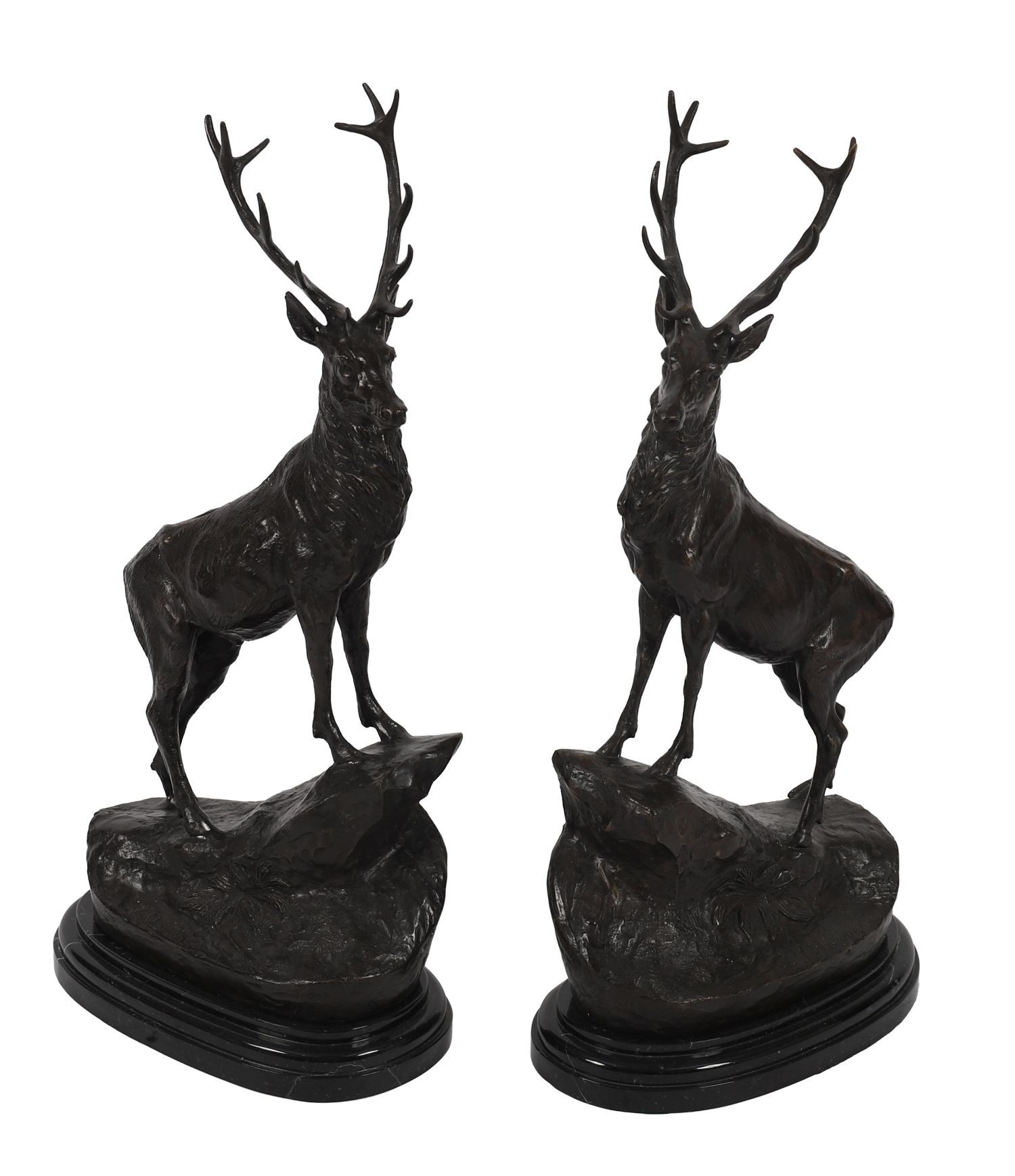 A pair of large patinated bronze sculptures after Jules Moigniez (French, 1835-1894), each depicting a stag in a dynamic pose atop a naturalistic rocky base. One figure is captured in full alert with head raised and antlers extended, the other in a braced stance mid-step. Each is mounted on a shaped black marble plinth. Finely cast with well-articulated musculature and textured coats, typical of Moigniez's romanticised animalier sculptures