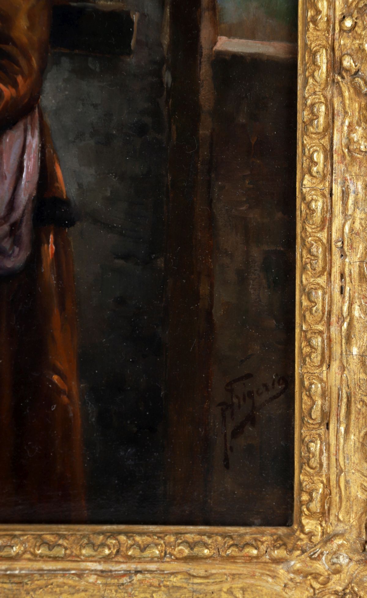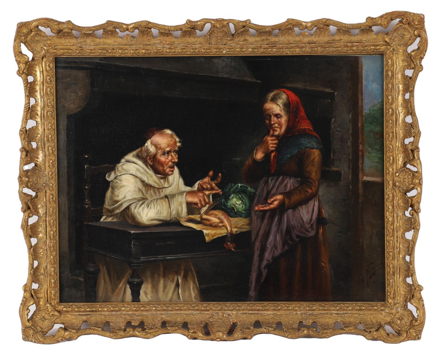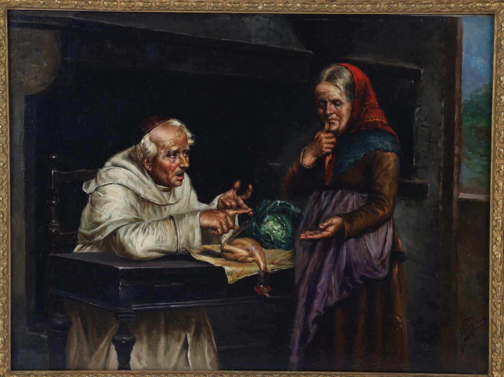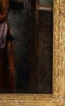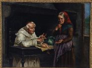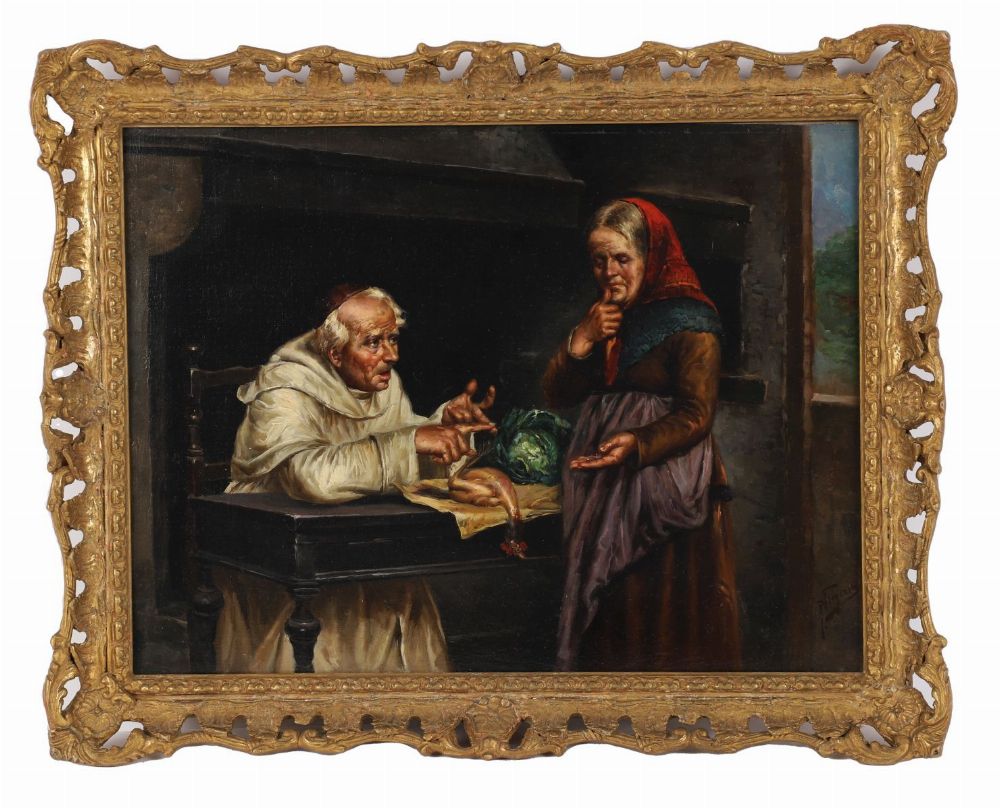 Monk and woman in an interior. Oil on canvas. Enclosed in a gilt frame.