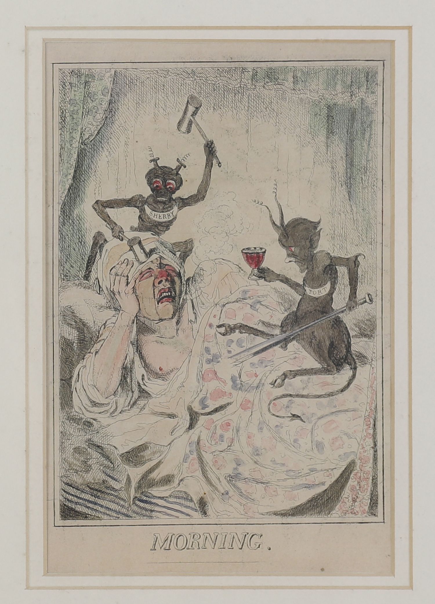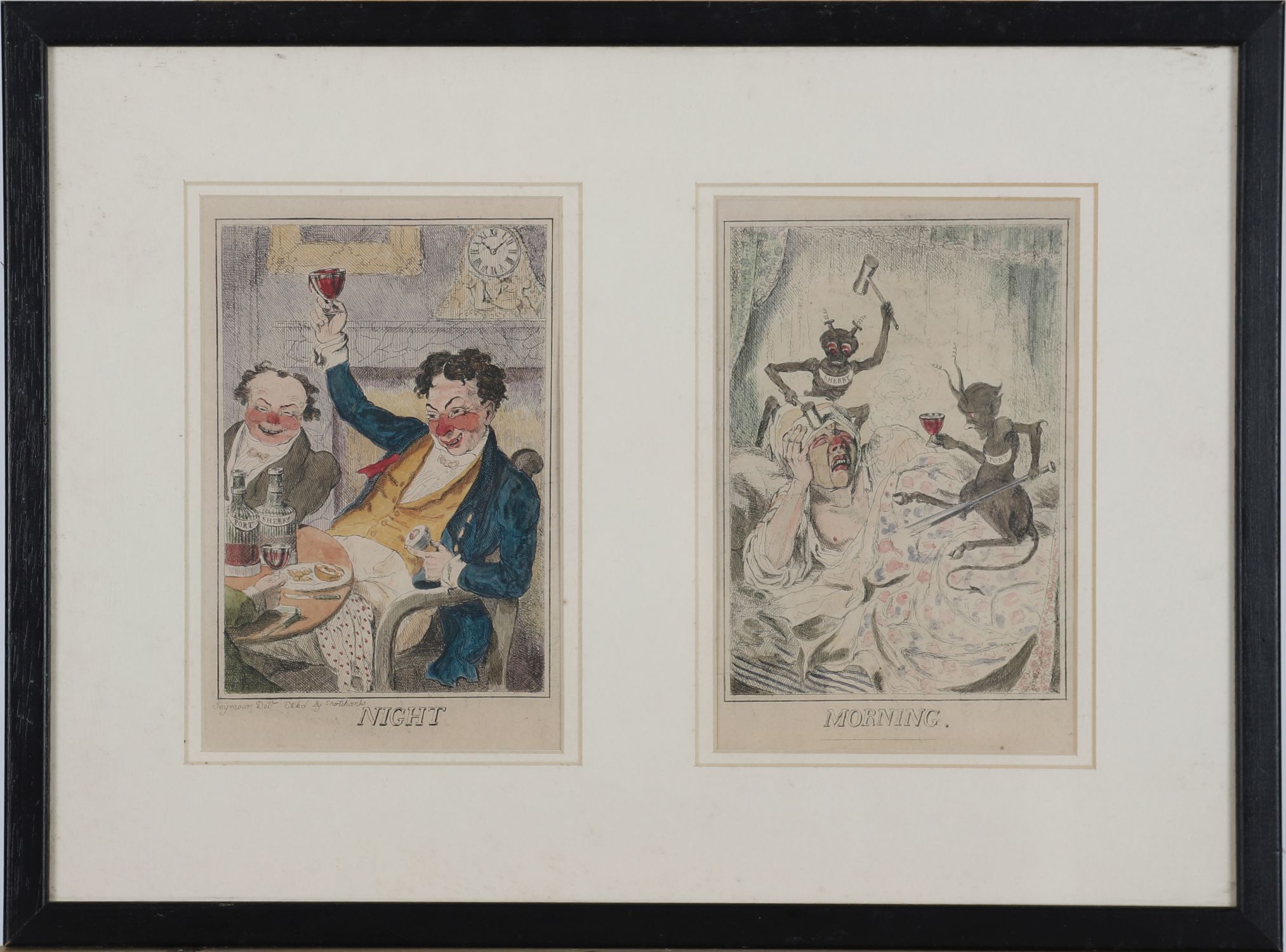 Night & Morning, after Seymour. A humorous pair of 19th-century hand-coloured etchings, titled Night and Morning, depicting a man's condition before and after.