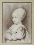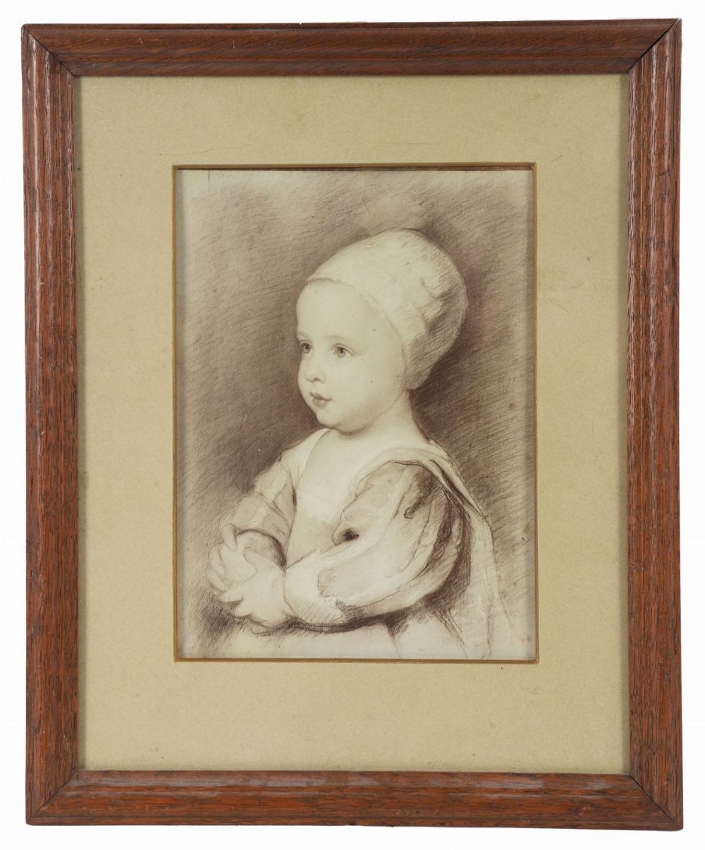 A 19th-century portrait study after Sir Anthony van Dyck, depicting a young woman in three-quarter profile, executed in soft tonal gradation. Mounted and framed.
