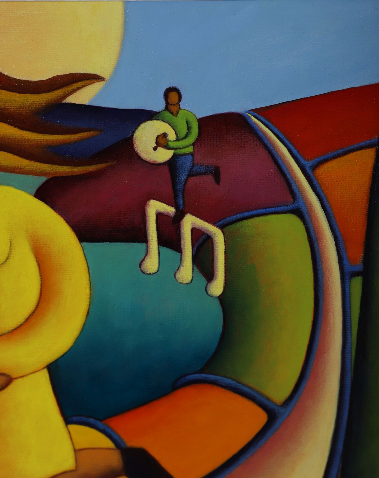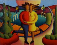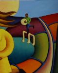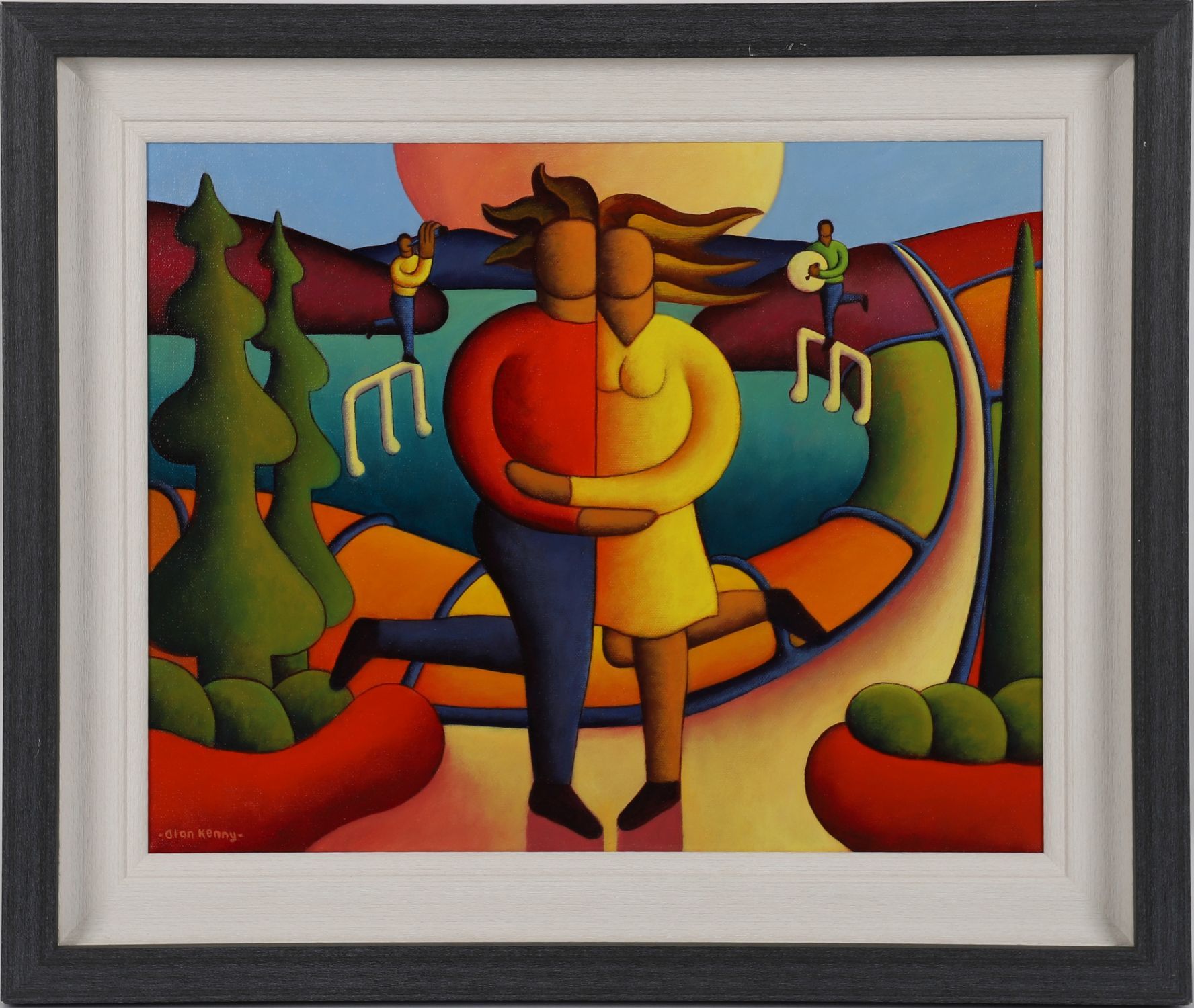A colourful, stylised composition with embracing lovers and musical figures on floating notes. Strong modernist lines and vibrant colour. Signed lower left.