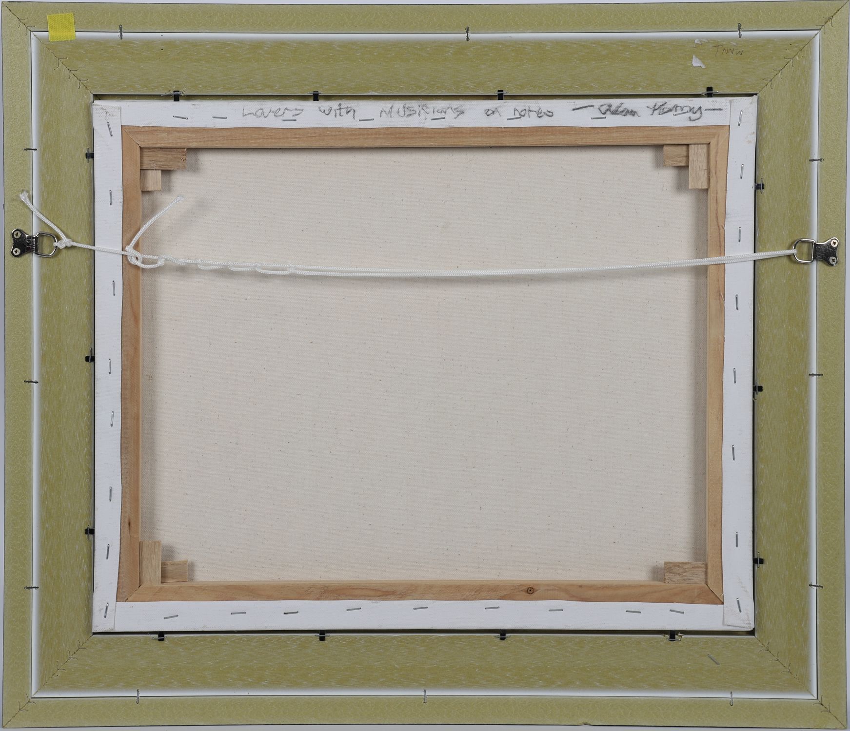 Lovers with Musicians on Notes. Acrylic on Canvas. Signed Lower Left. Framed.