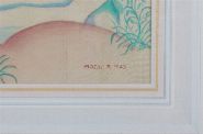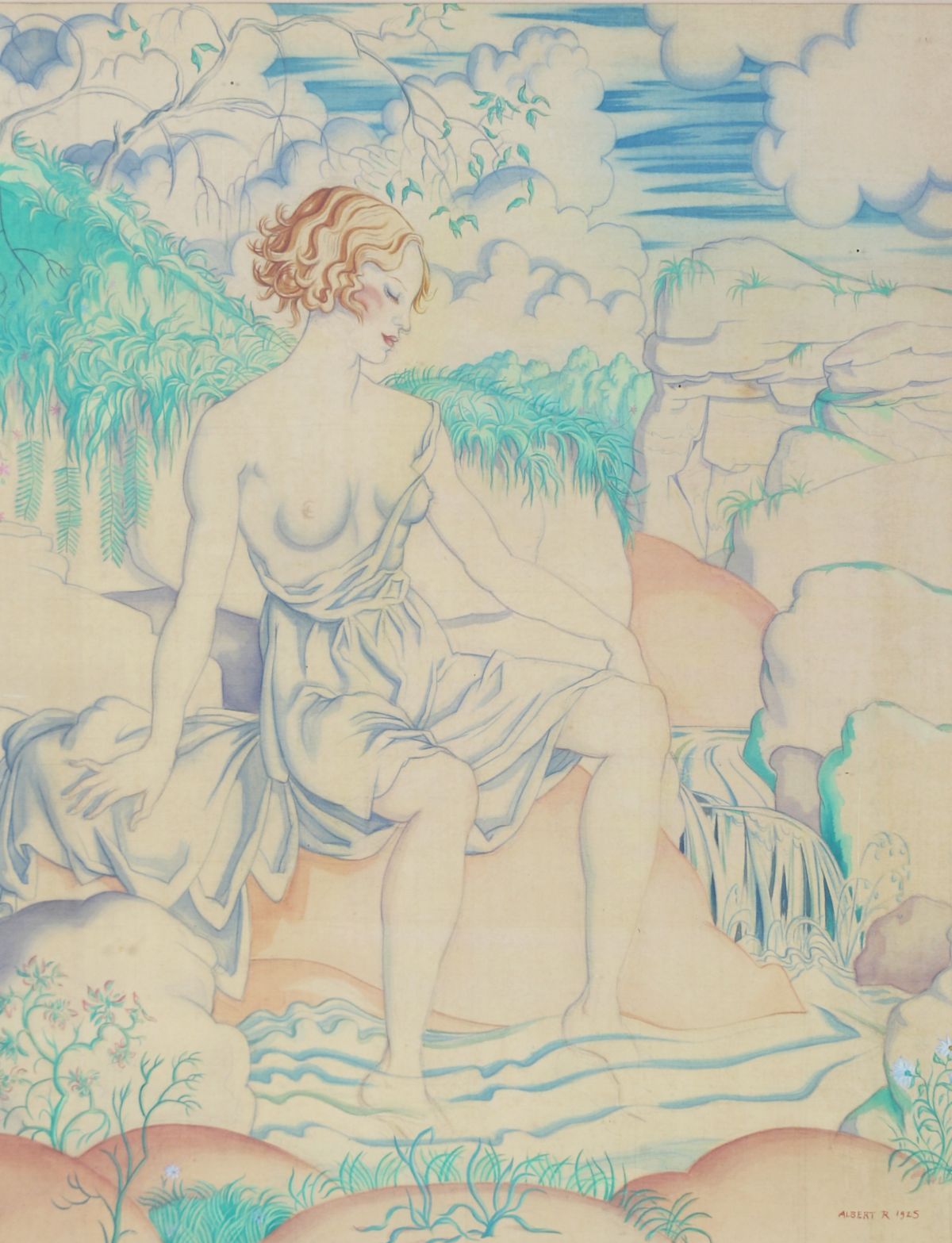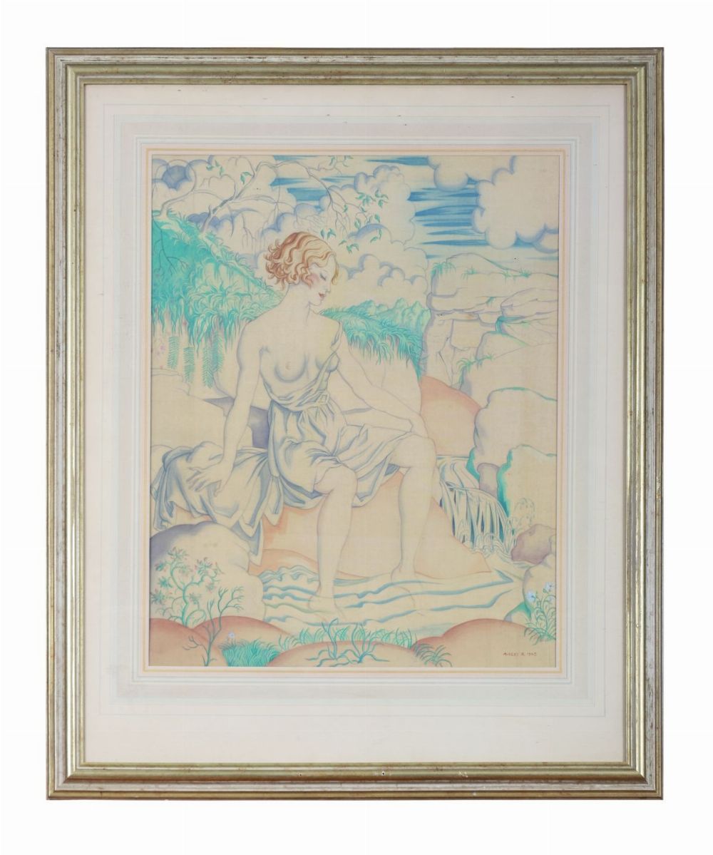 Depicting a seated female figure in a stylised landscape with flowing drapery and soft Art Deco tones. Signed and dated lower right. Presented in a gilt frame with mount.