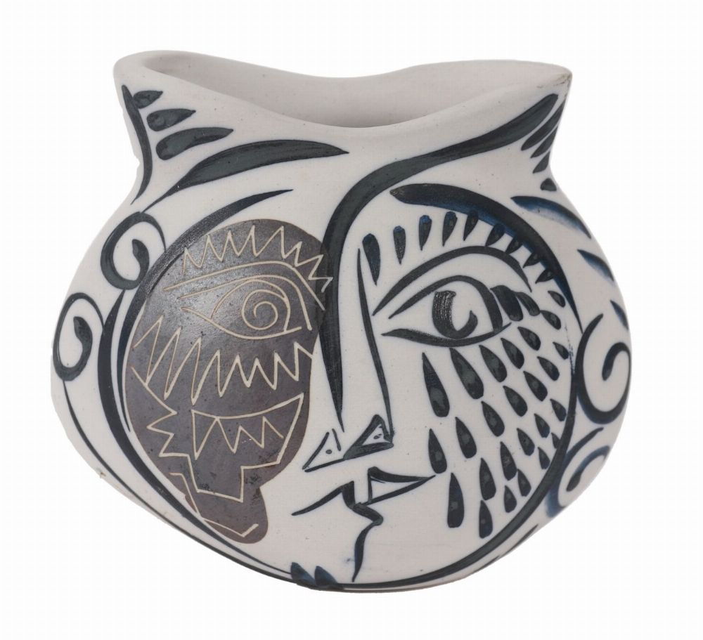 Hand-painted ceramic vase in cubist style, decorated with stylised facial motifs and bold linear design.