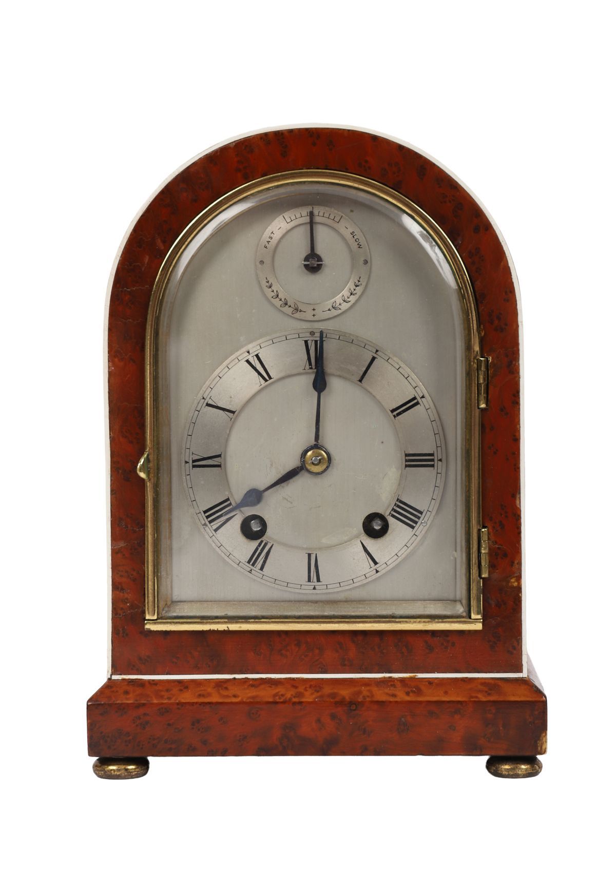 A 19th-century amboyna mantel clock with arched case edged in bone stringing, enclosing a silvered dial with Roman numerals and subsidiary fast/slow dial, raised on bun feet.