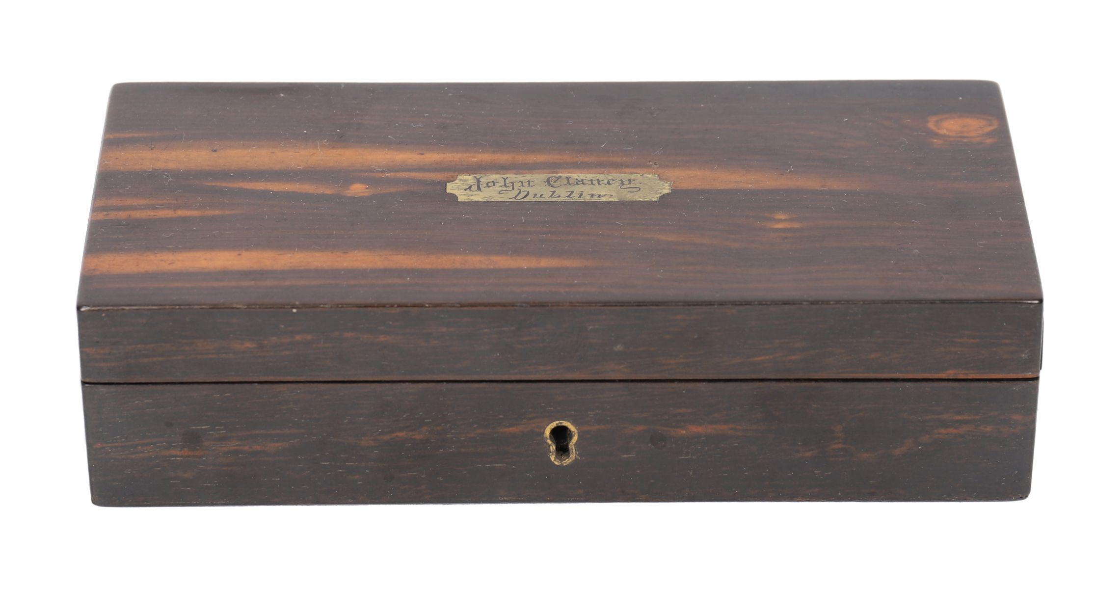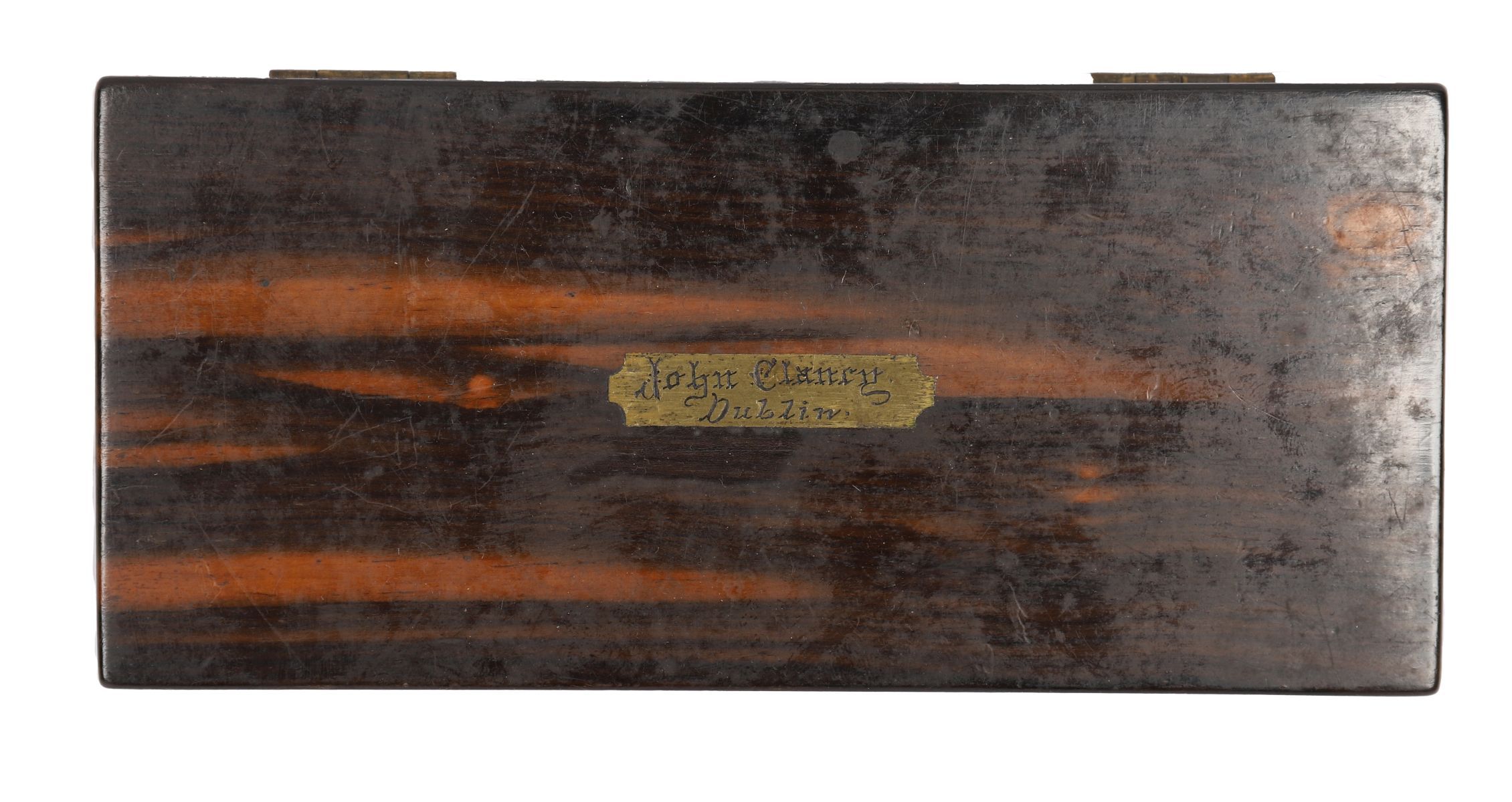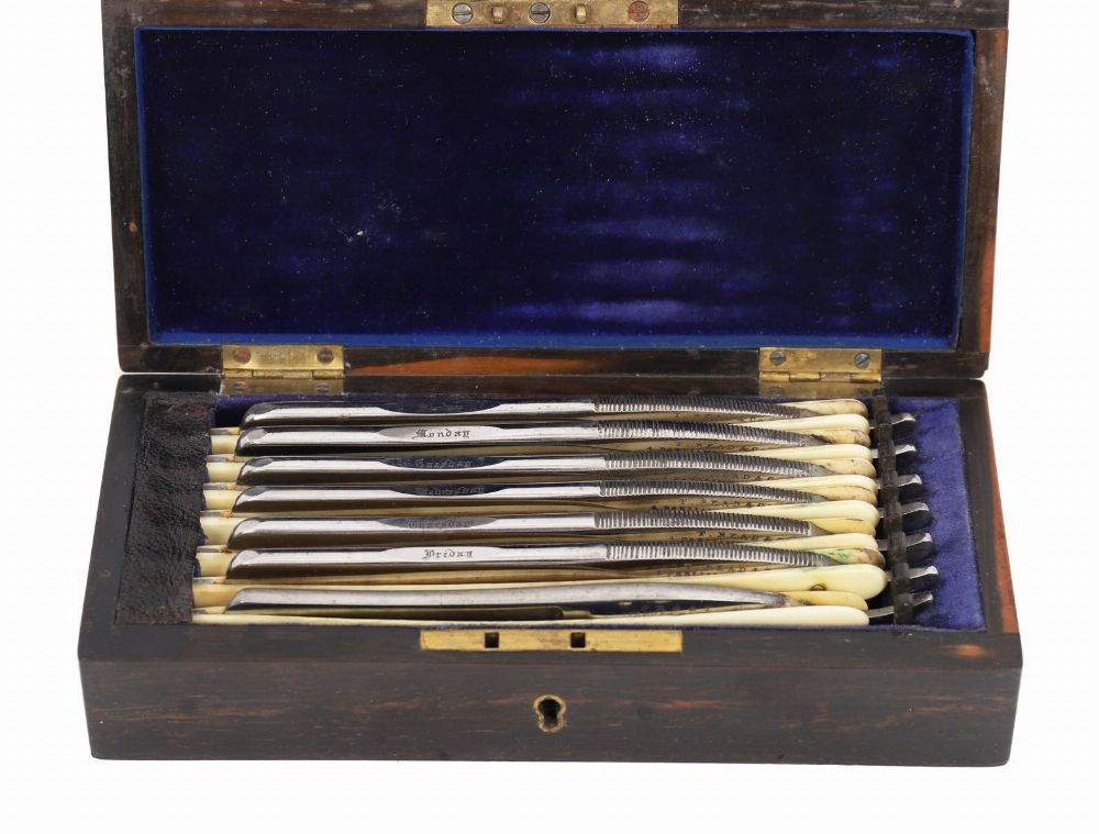 An amboyna-veneered hinged case, the interior lined in blue velvet and fitted with seven straight razors, each blade engraved with a day of the week, the tangs stamped T. Read & Son, 4 Parliament Street, Dublin. The lid interior inscribed John Clancy, Dublin. Early 19th century.