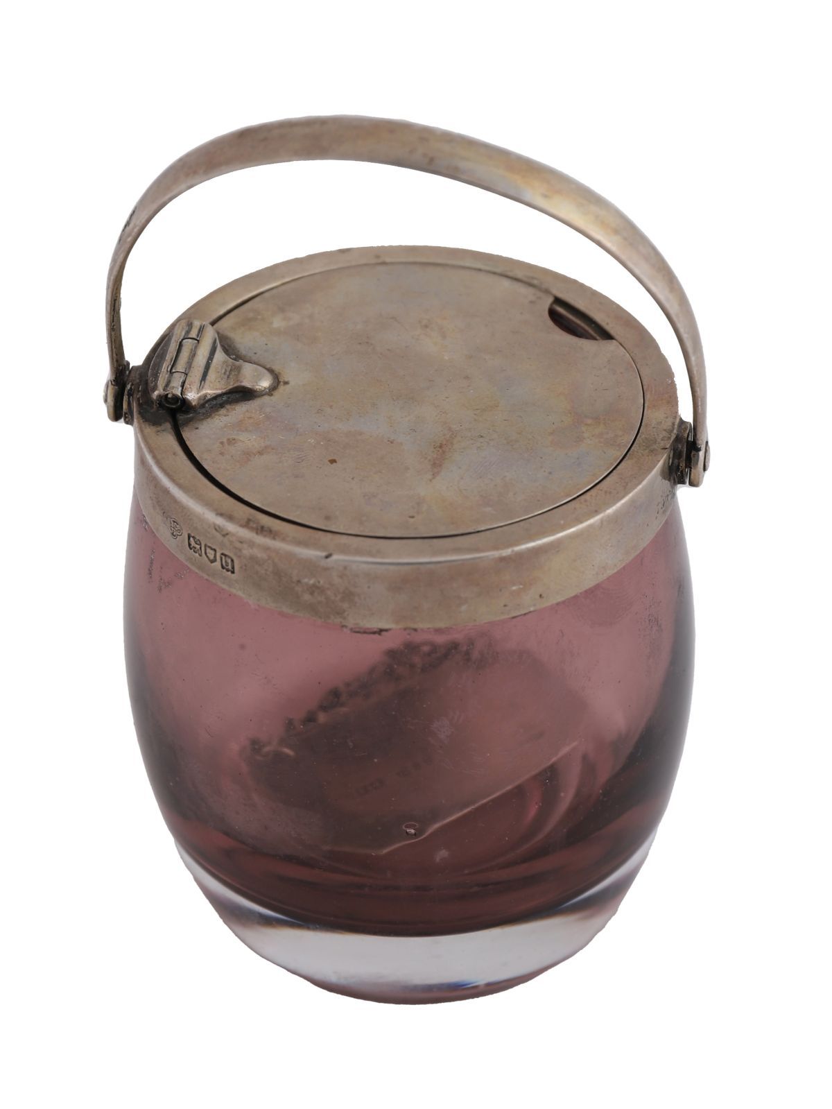 An amethyst-coloured glass honey jar with silver mount and swing handle, London 1915, in the manner of Christopher Dresser.