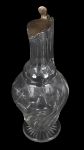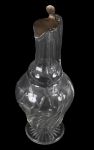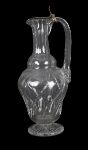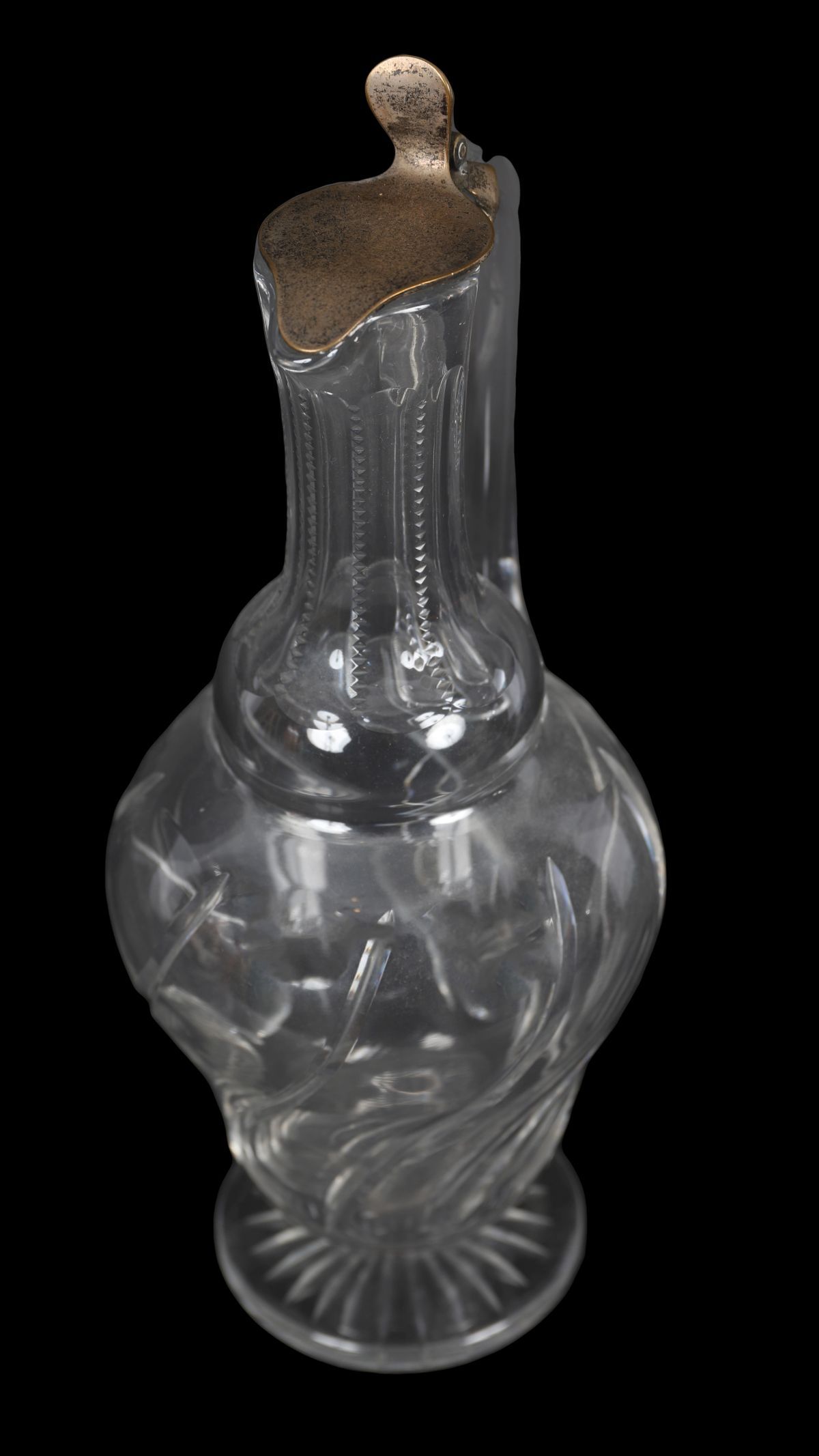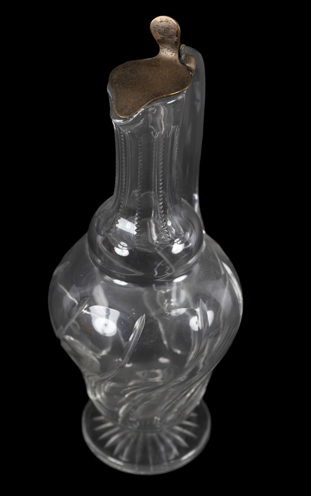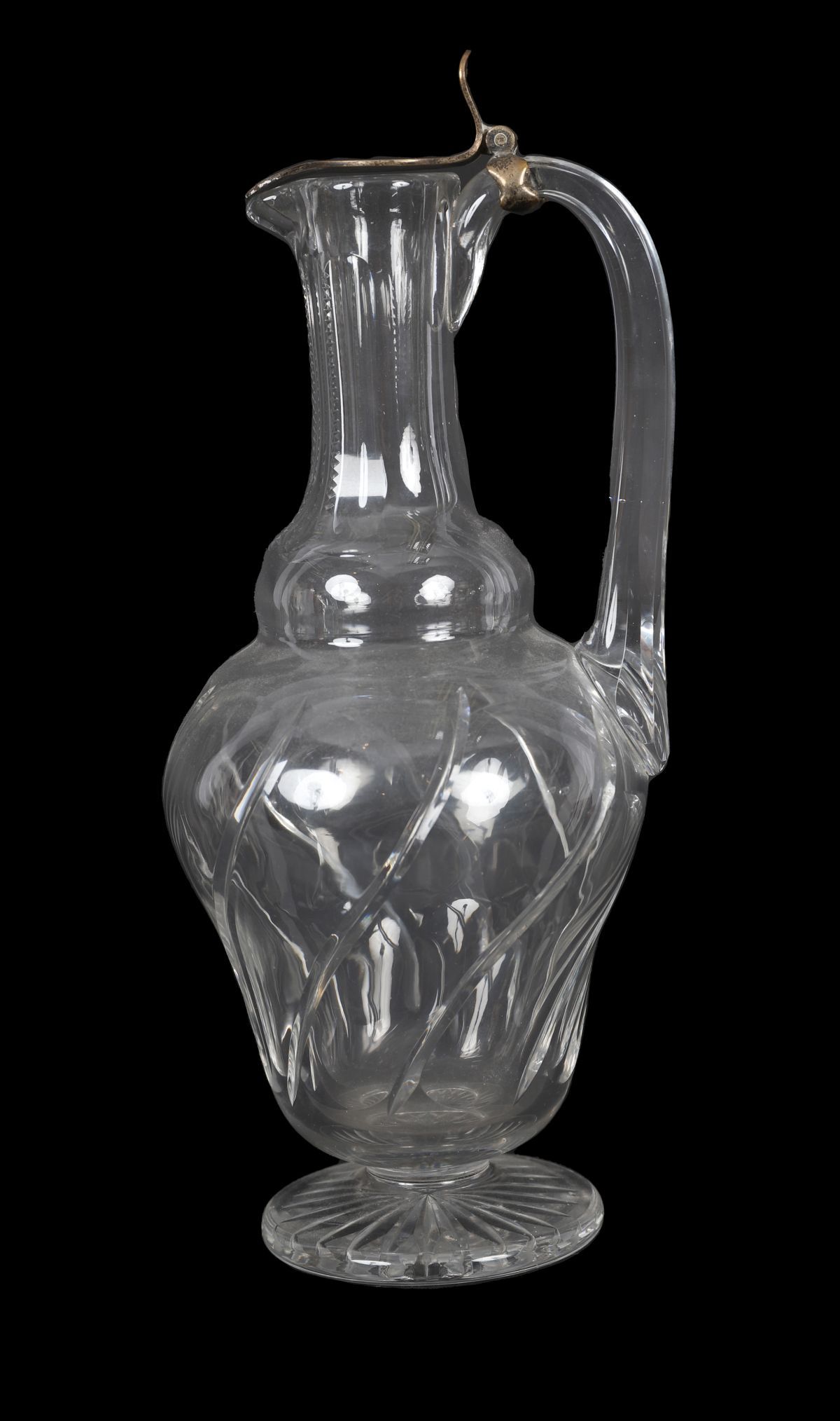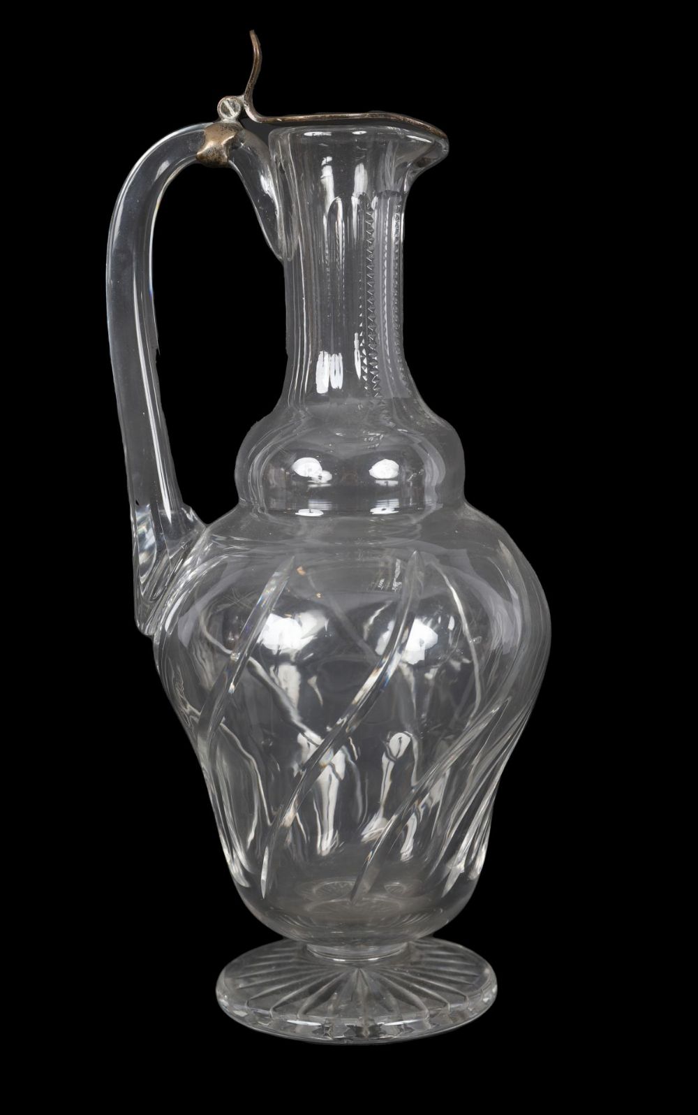 Tall claret jug of baluster form, the body richly cut with fluting and faceting, with applied handle and metal-mounted hinged cover.