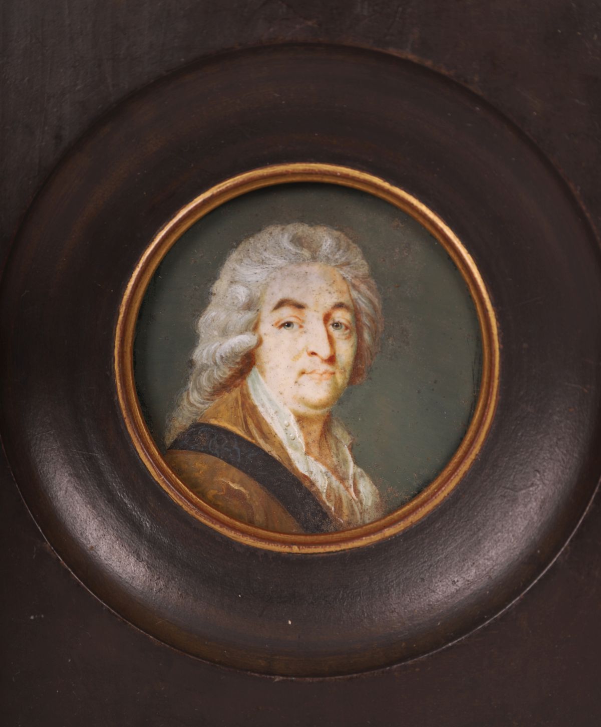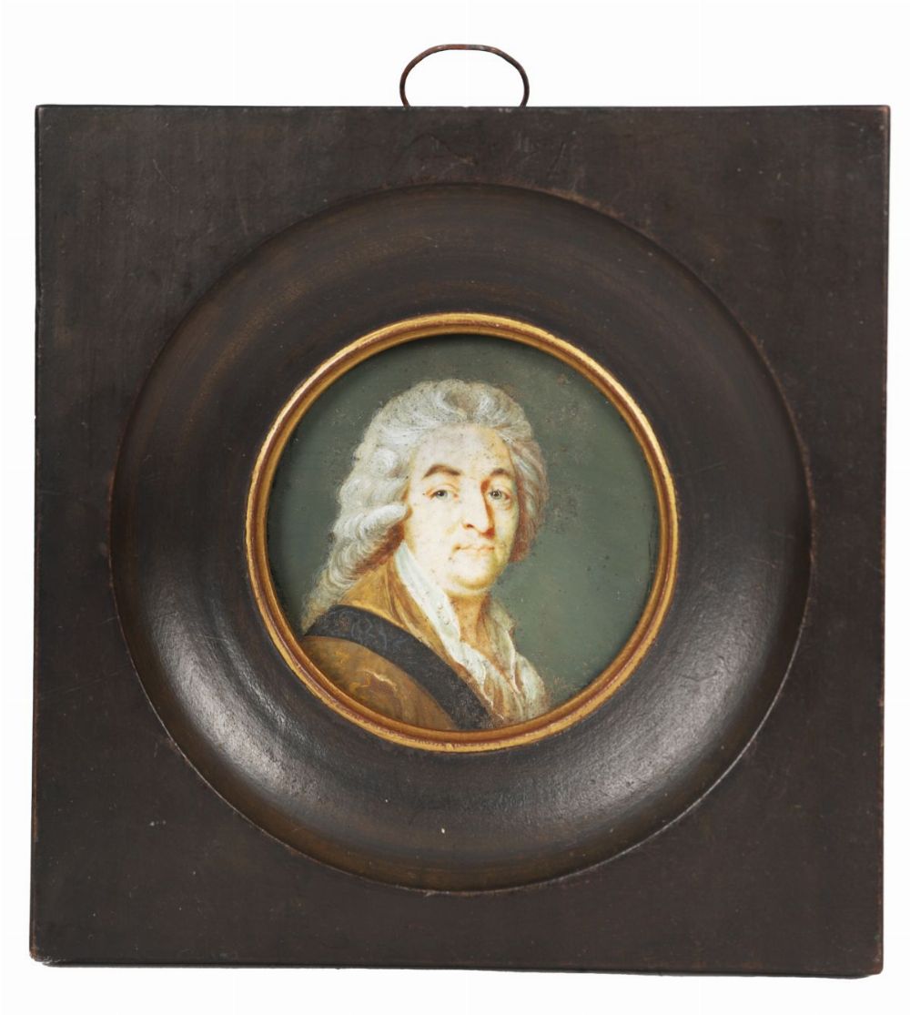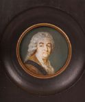 Oval portrait miniature depicting a sitter with powdered hair and formal attire, painted with controlled tonal modelling and a subdued palette.