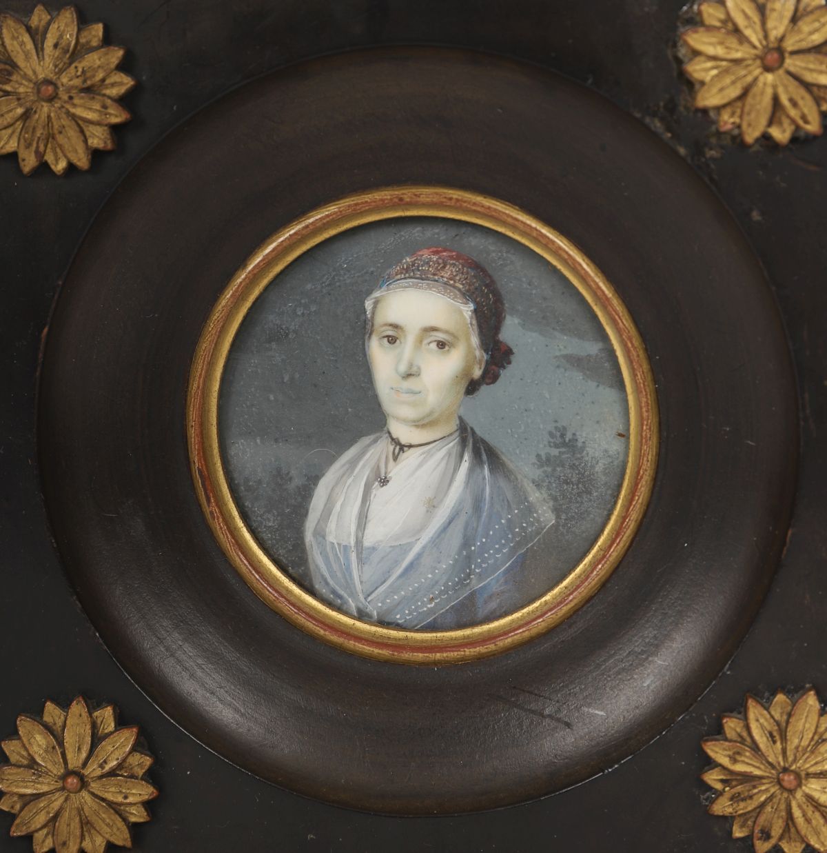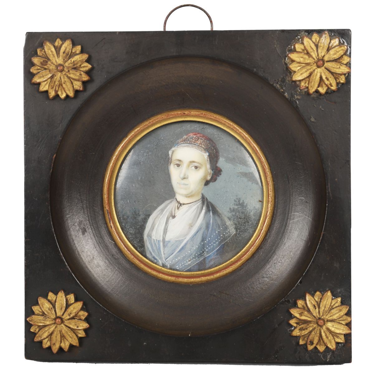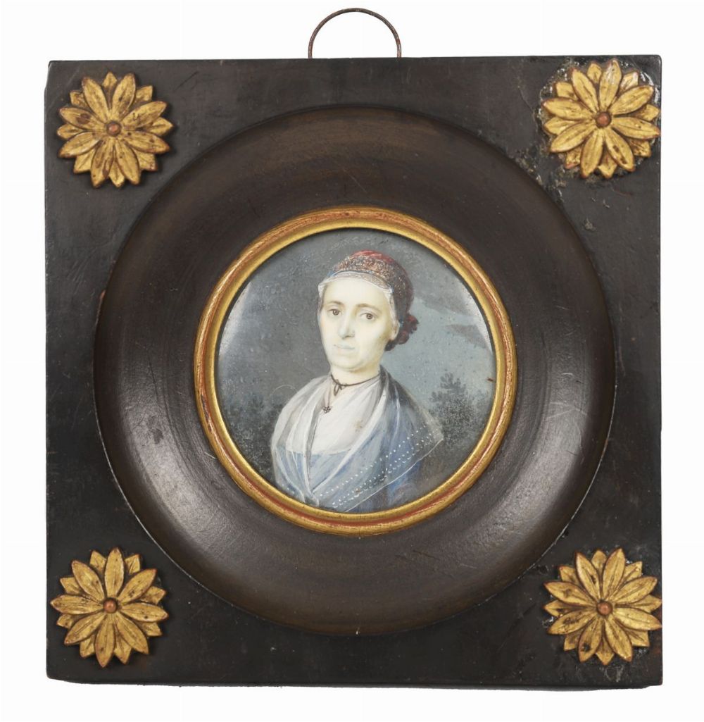 Oval portrait miniature depicting a sitter wearing a light blouse and shawl, with restrained ornament and softly modelled features, characteristic of late 18th-century French taste.