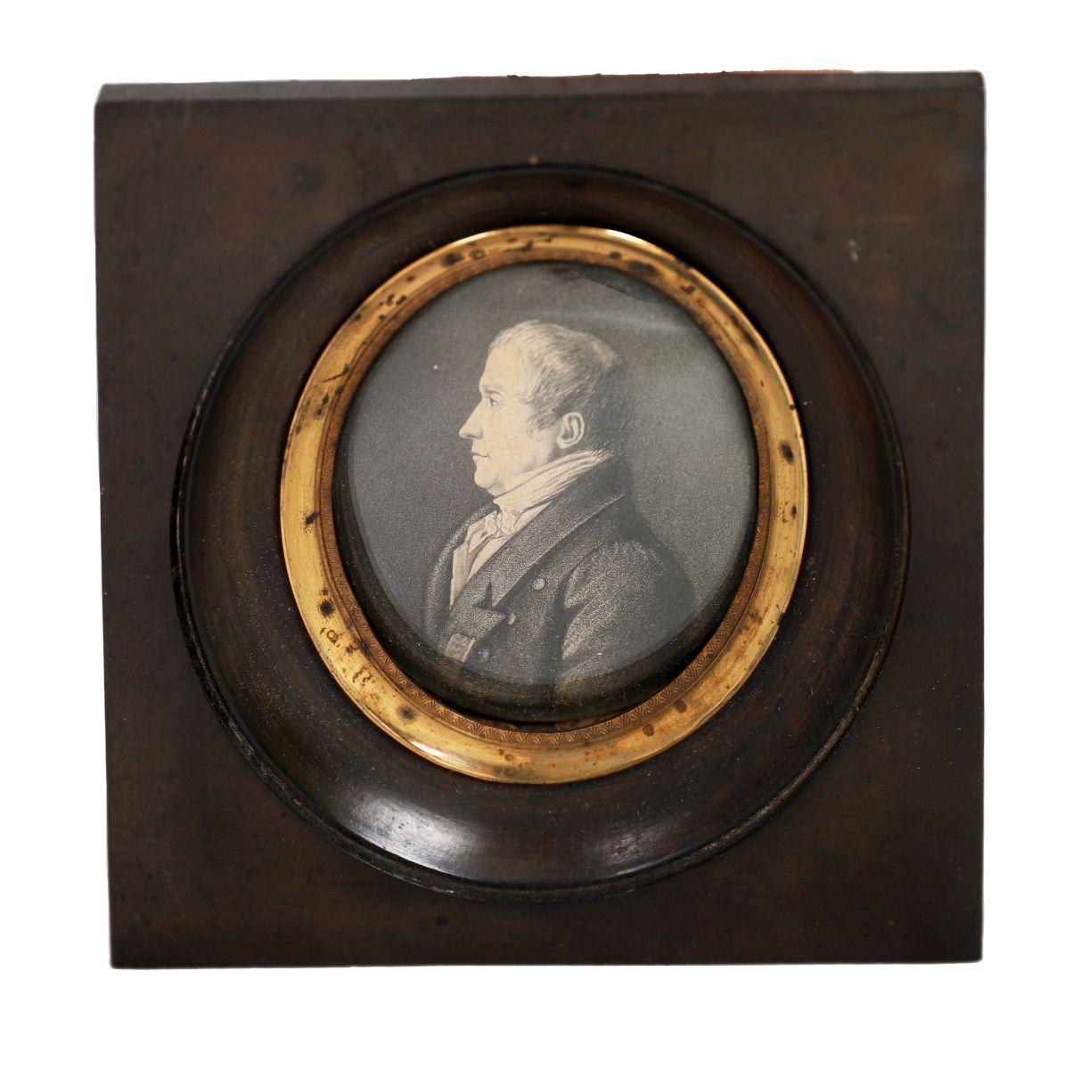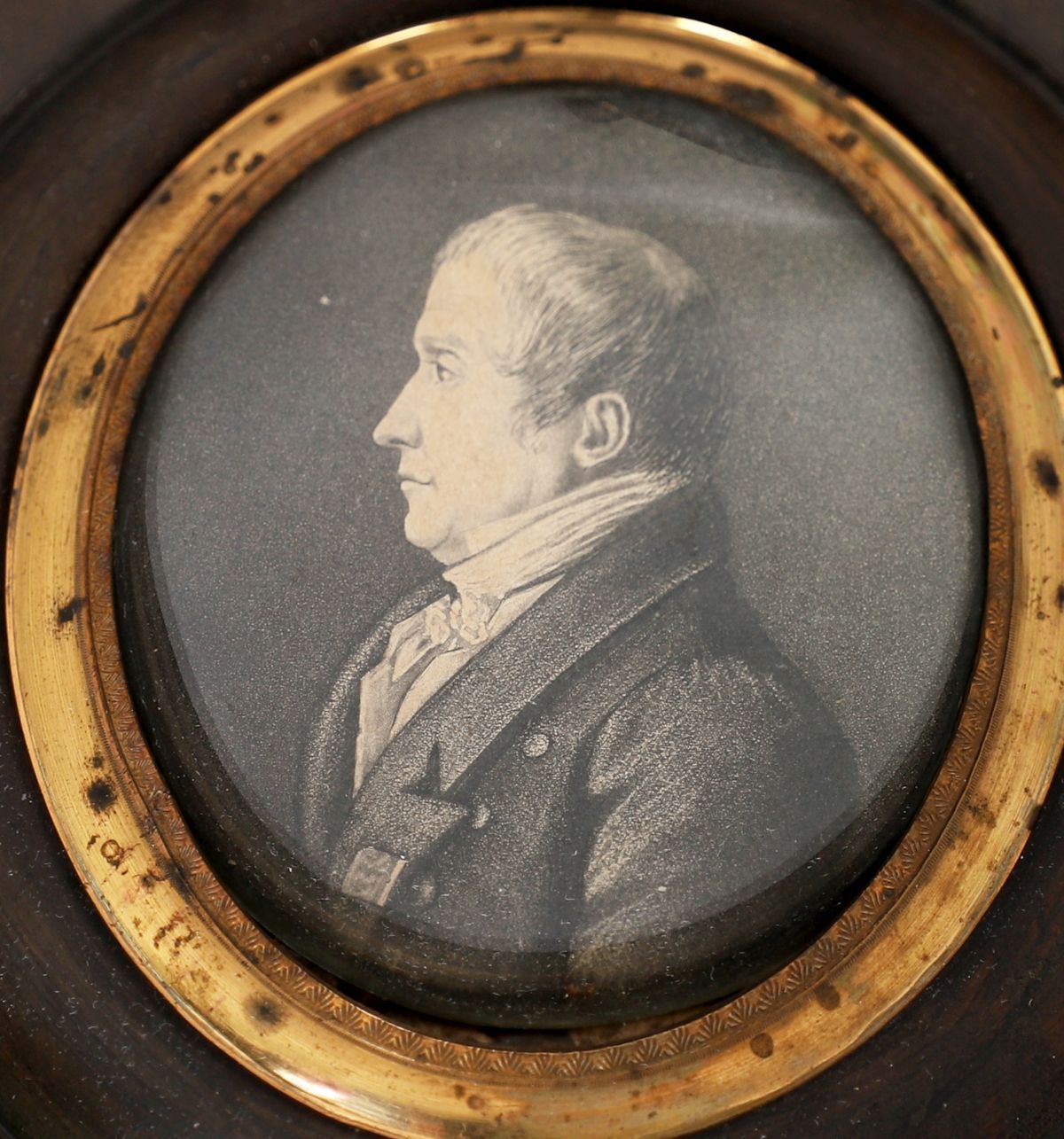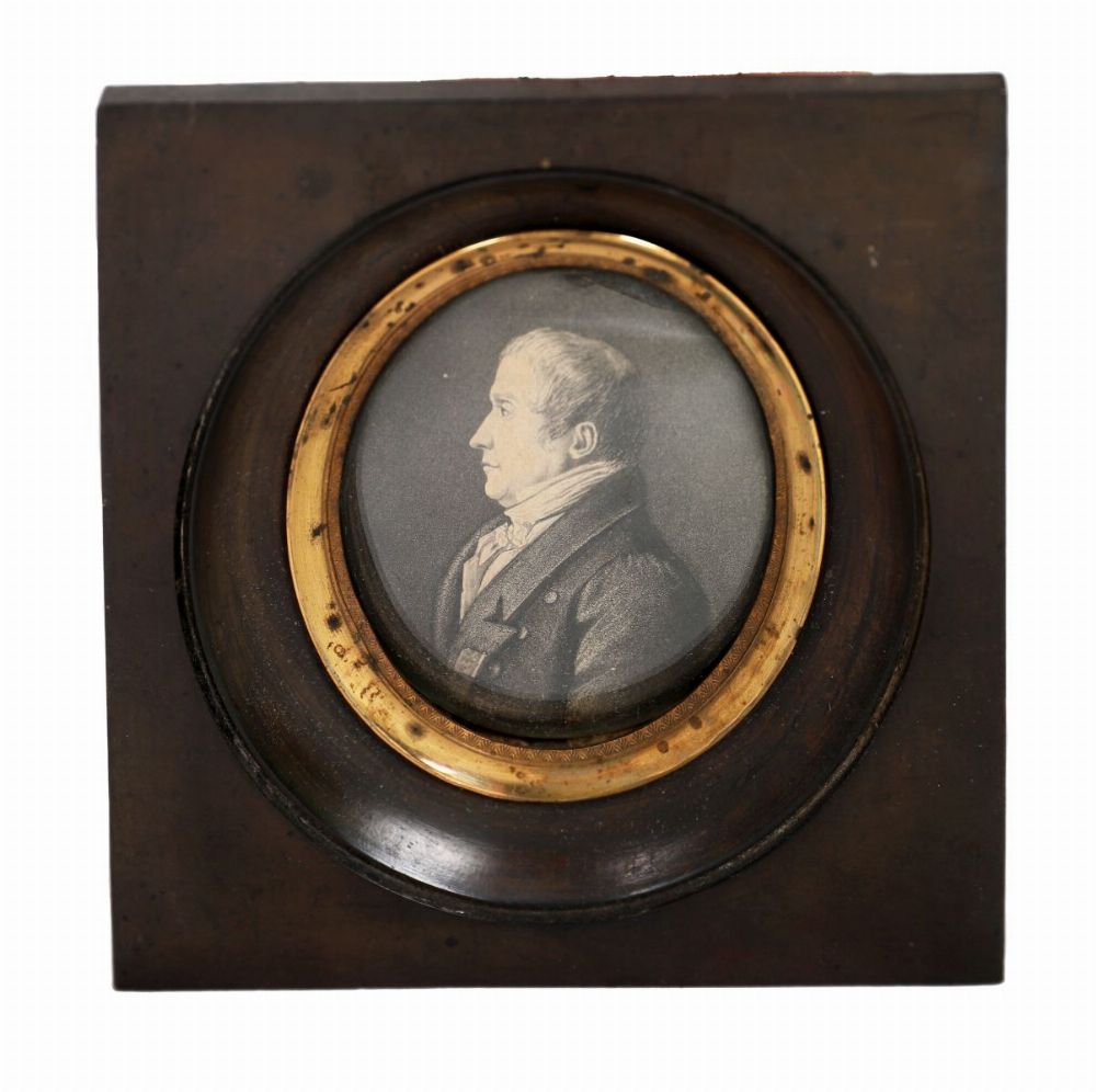 Oval portrait miniature depicting a sitter shown in profile, wearing formal dress with high collar and layered garments, the execution restrained and precise.