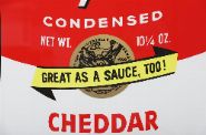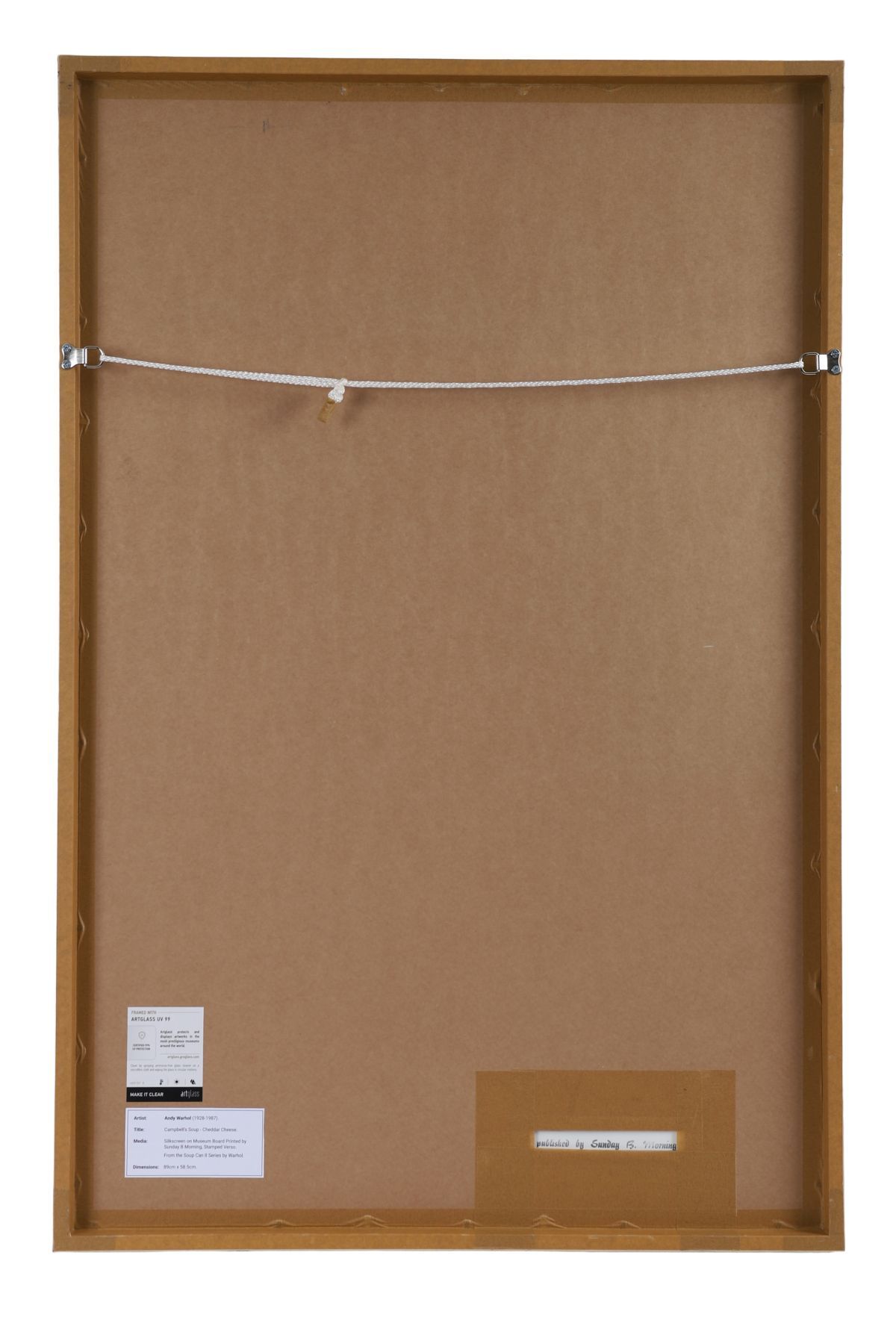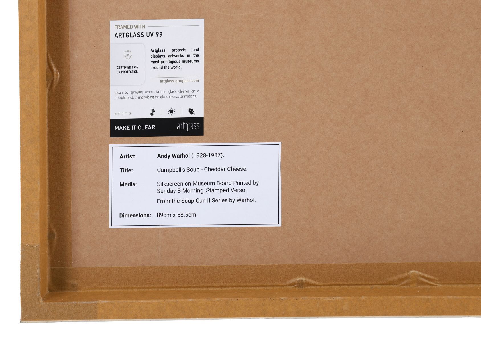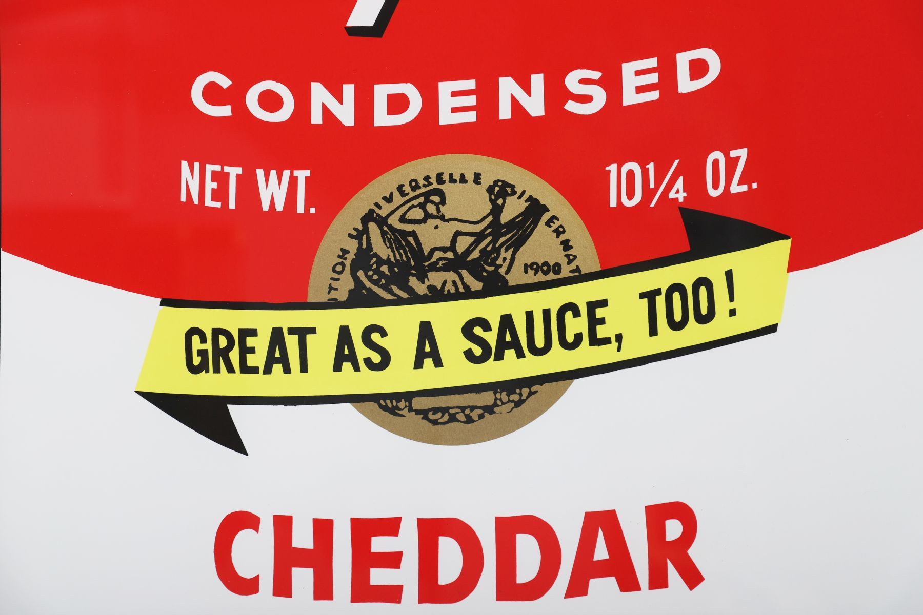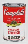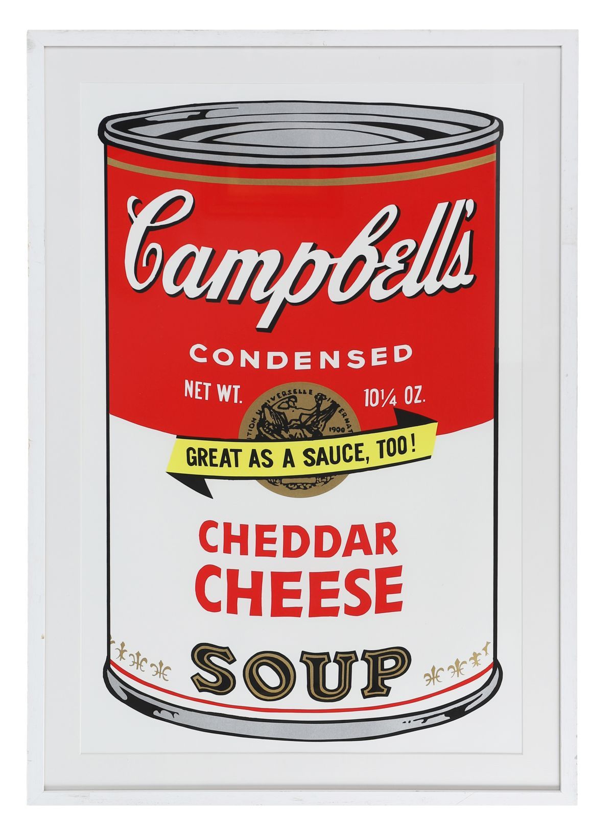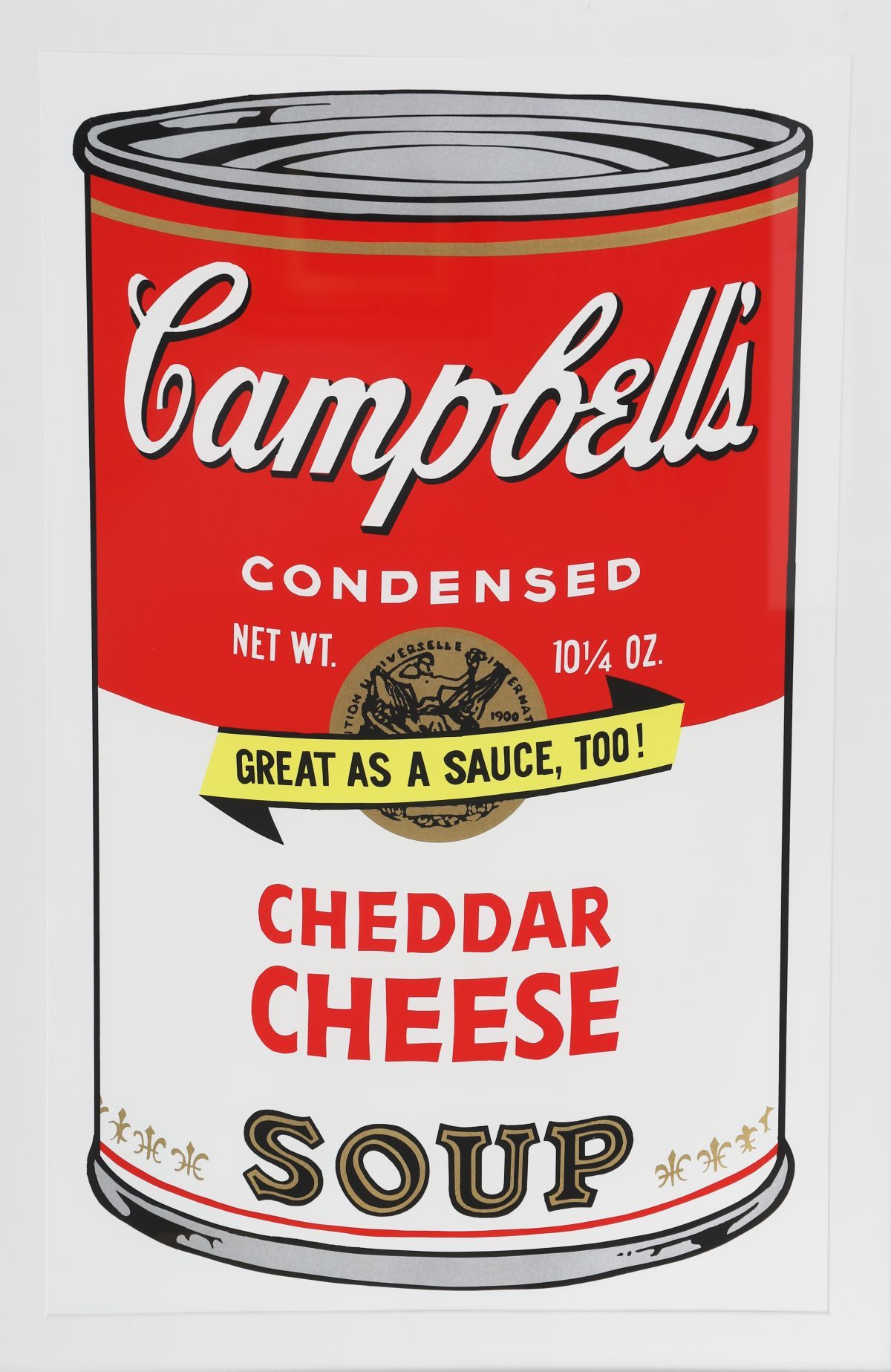 A bold example from Warhol’s iconic Campbell’s Soup series, this silkscreen print depicts the Cheddar Cheese Soup can in striking red and white with yellow and black accents. The work exemplifies Warhol’s Pop Art approach, elevating everyday consumer imagery into a graphic, iconic form.