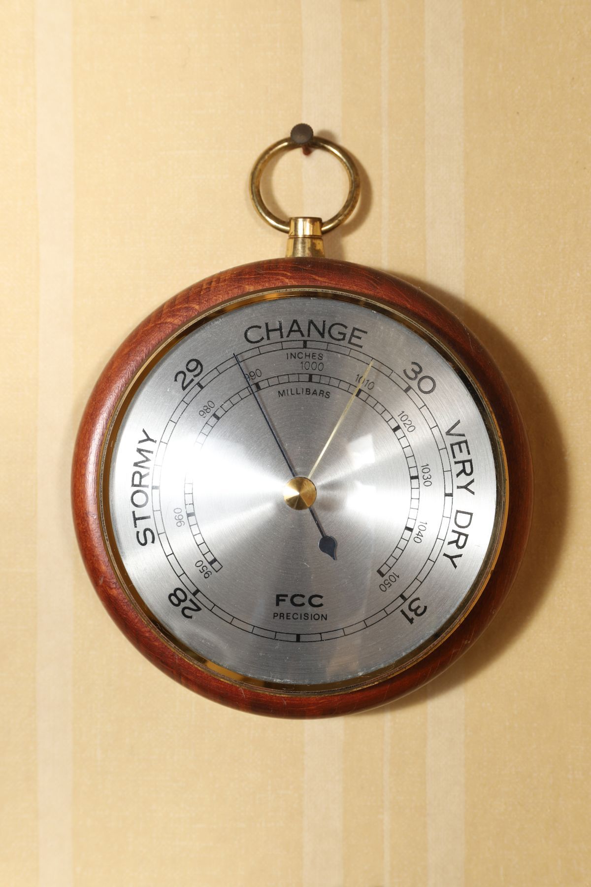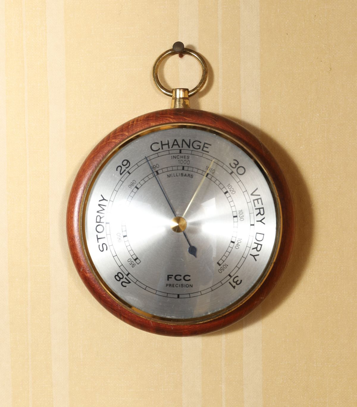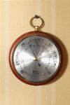 An aneroid barometer of circular form, with silvered dial calibrated in inches and millibars, the chapter marked with weather indications, housed in a mahogany case with brass bezel and suspension ring. 20th century.