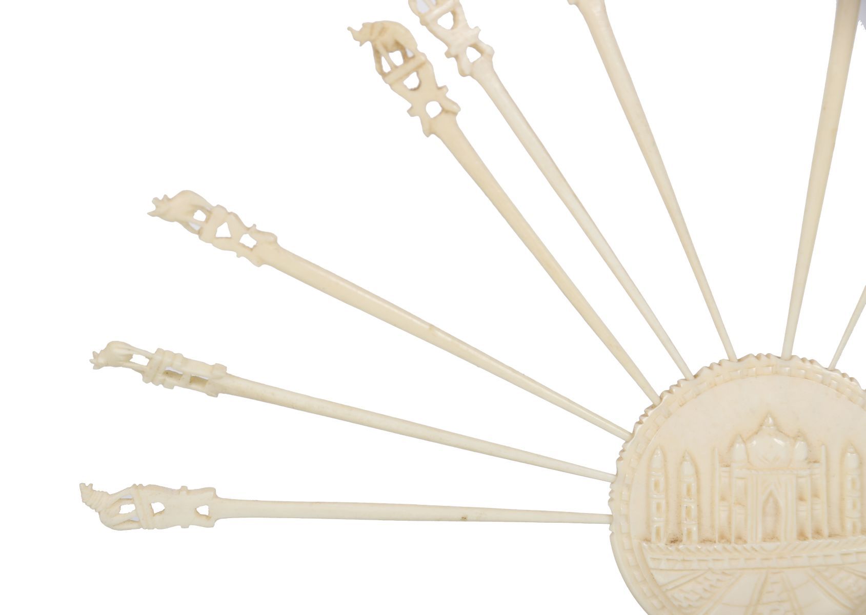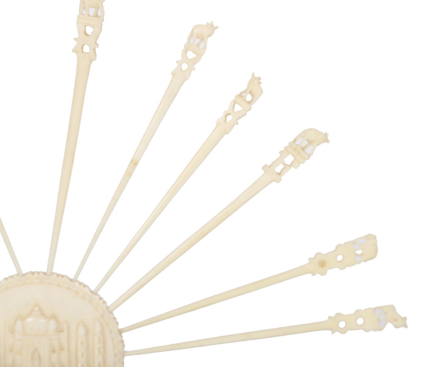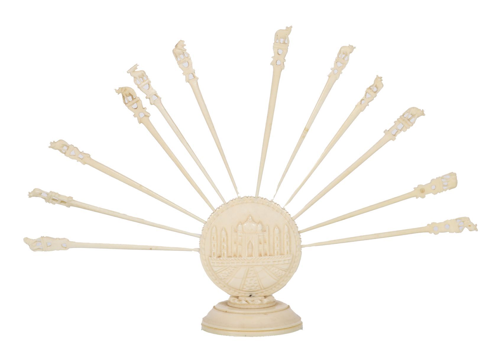 Intricately carved and pierced bone table ornament, the base featuring a relief of the Taj Mahal from which radiate nine decorative picks topped with miniature animal finials.
