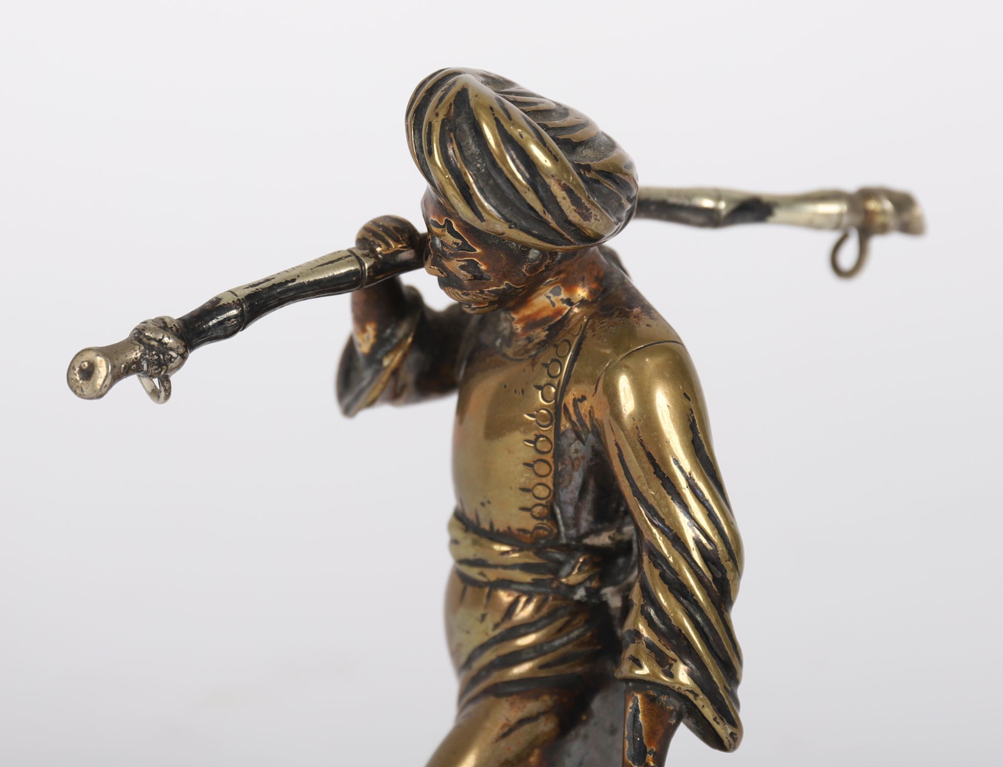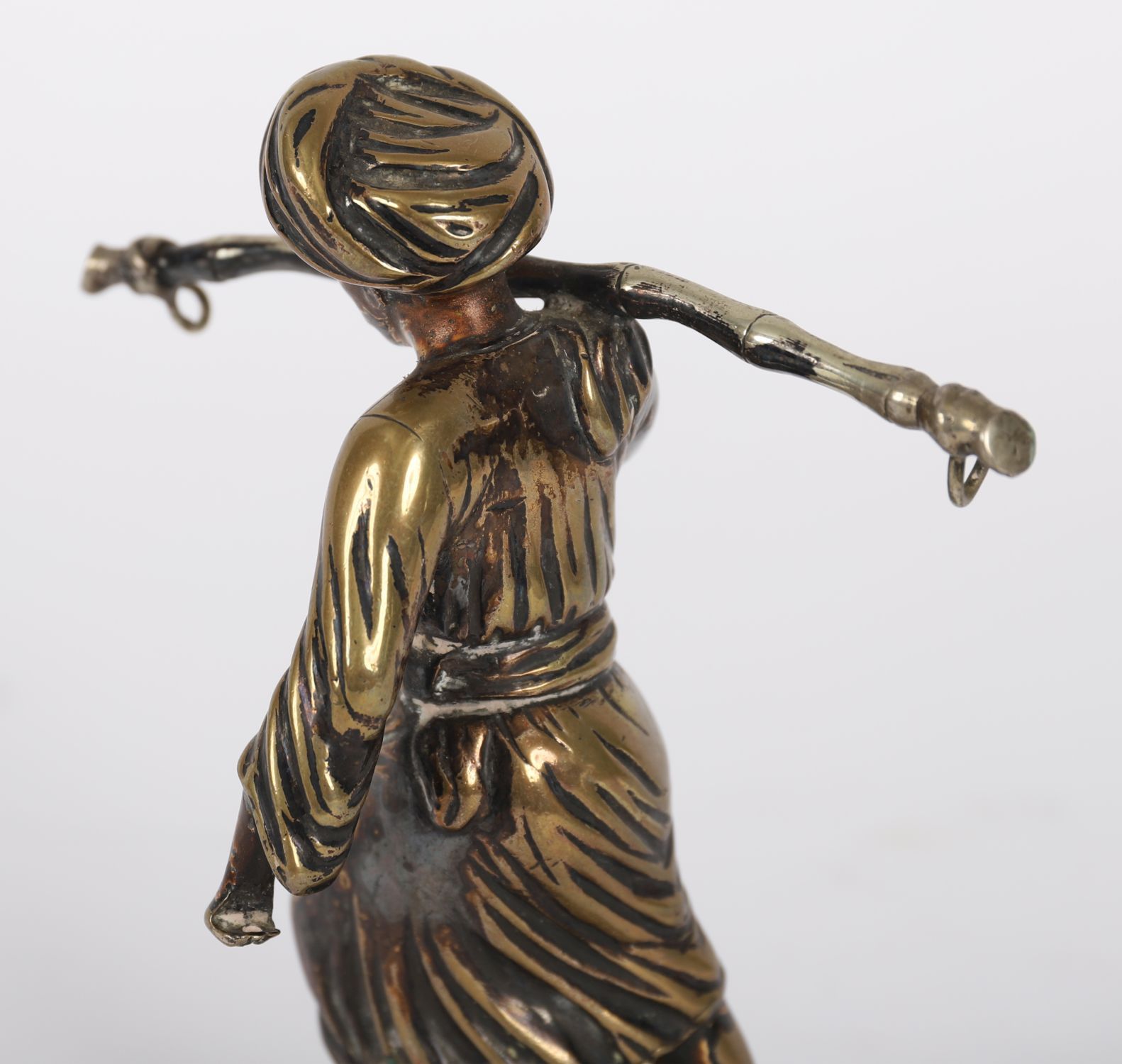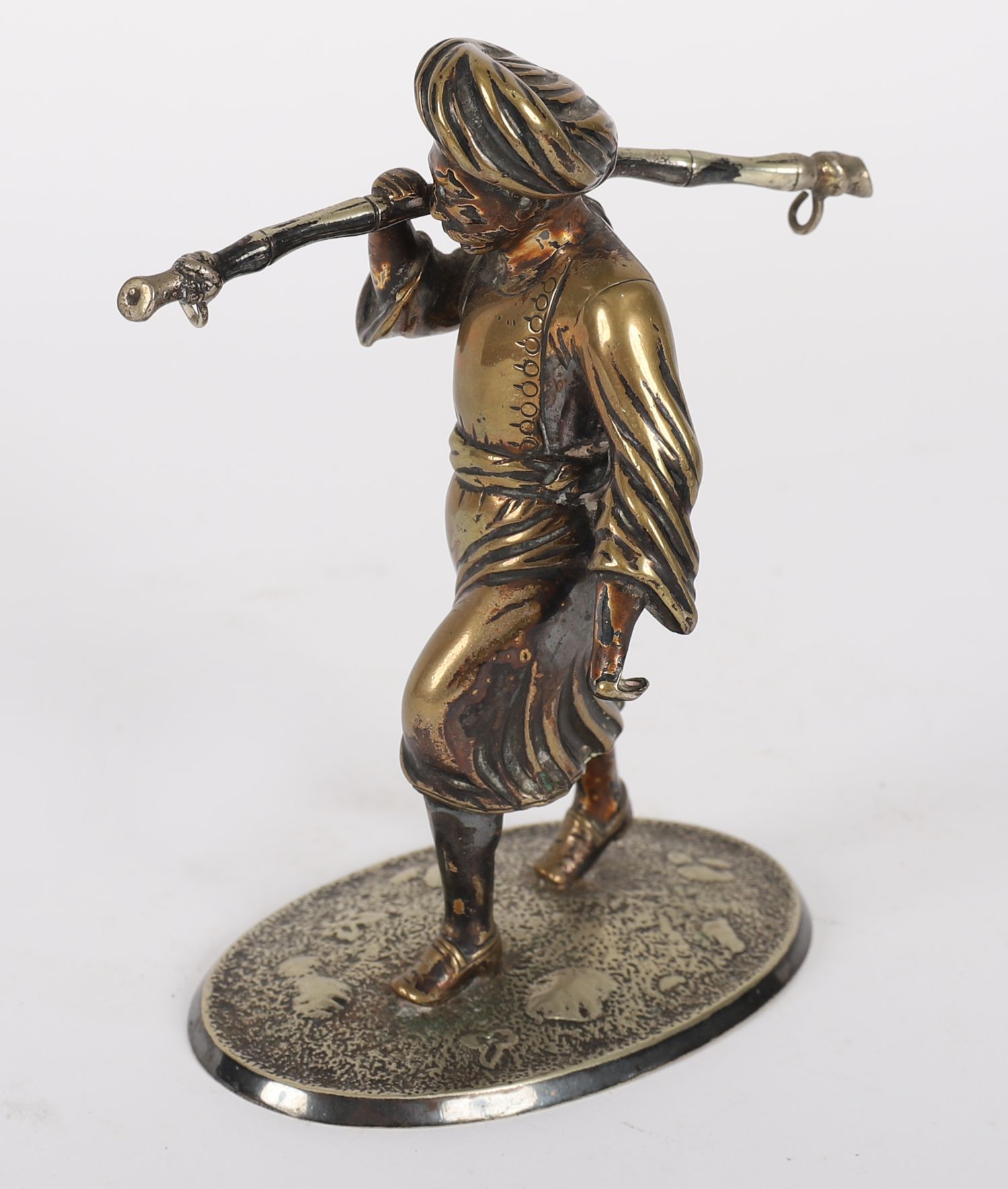 A finely cast and silver-plated bronze figure of an Indian water carrier, modelled walking in traditional turban and robes with a pole across the shoulder. Oval base marked with registration lozenge and impressed numerals.