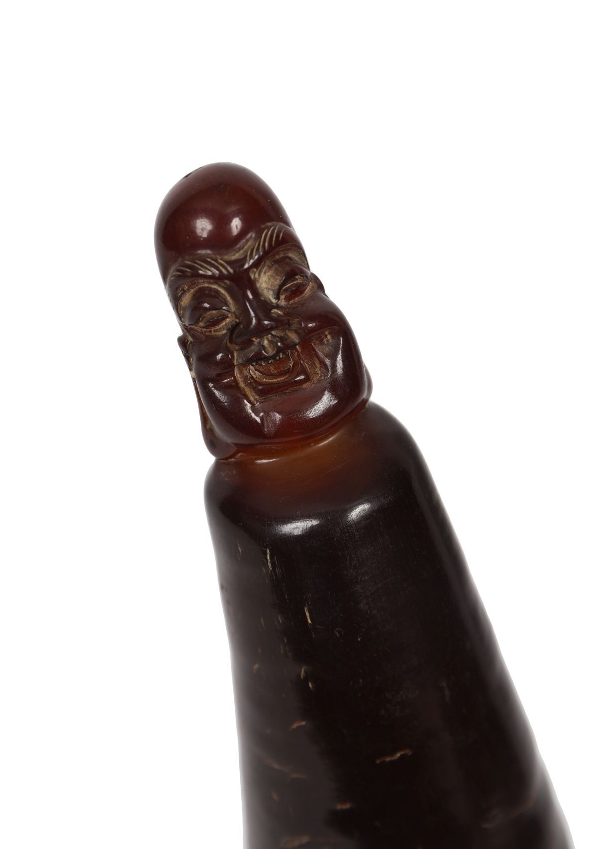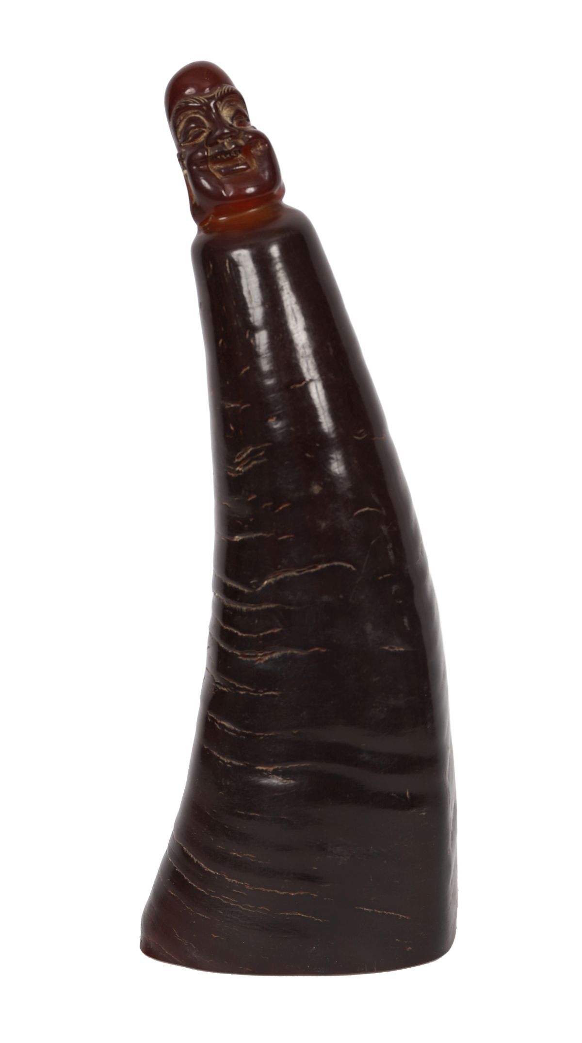 An Animalia horn carving, modelled as a stylised figure with carved head finial and tapering body.