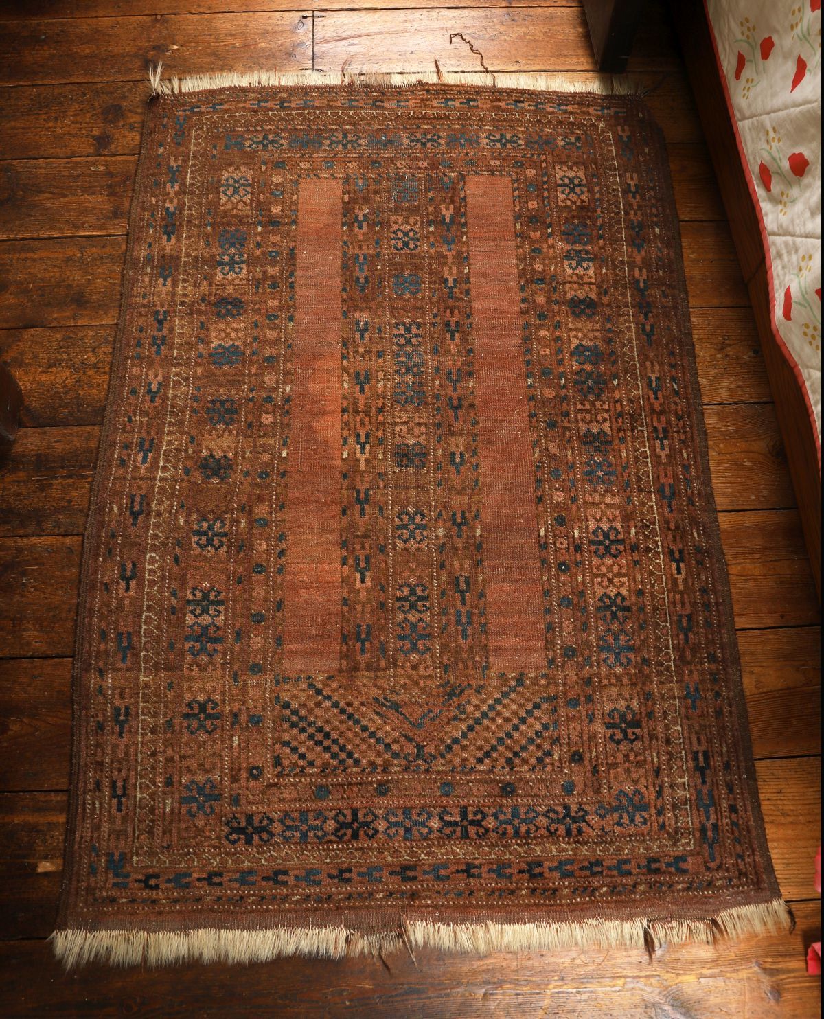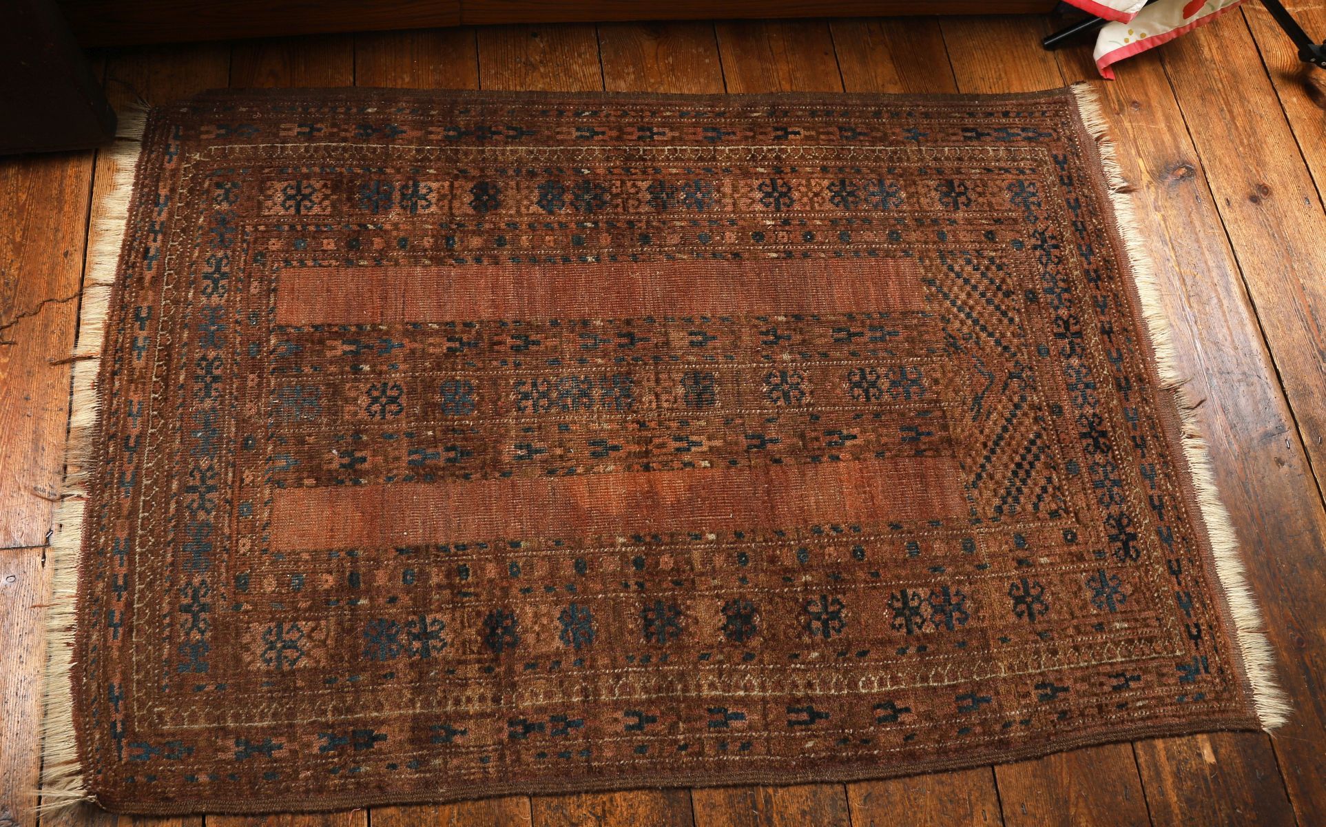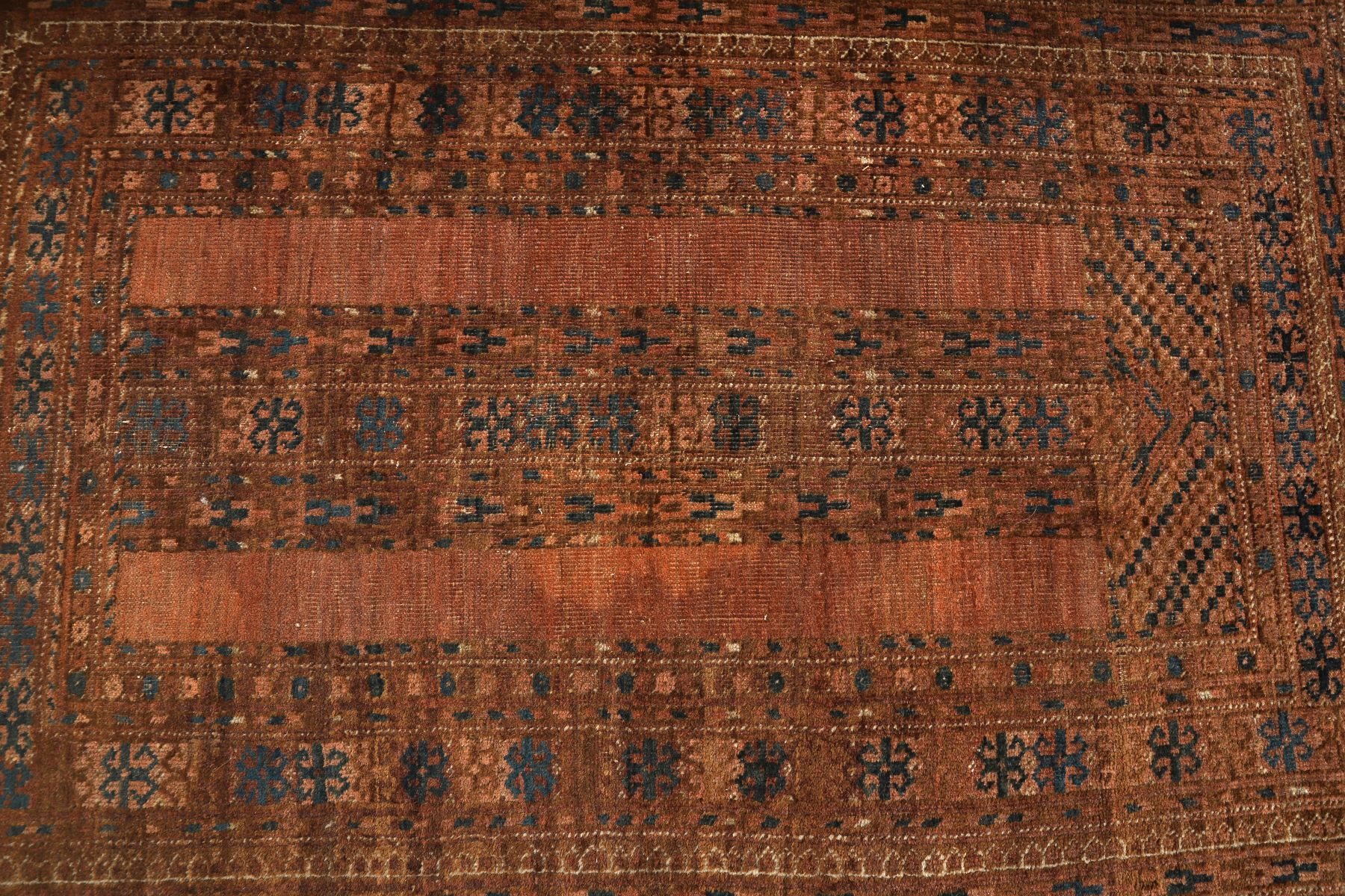 with geometric motifs and stylised borders, woven in muted tones.