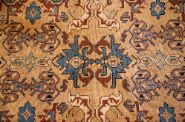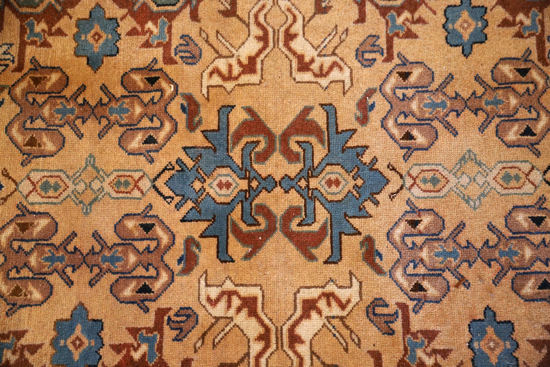 An antique handwoven Persian rug, decorated with repeating geometric medallions within multiple guard borders. Woven in a traditional palette of madder red, indigo, and ivory. Wool pile on a wool foundation.