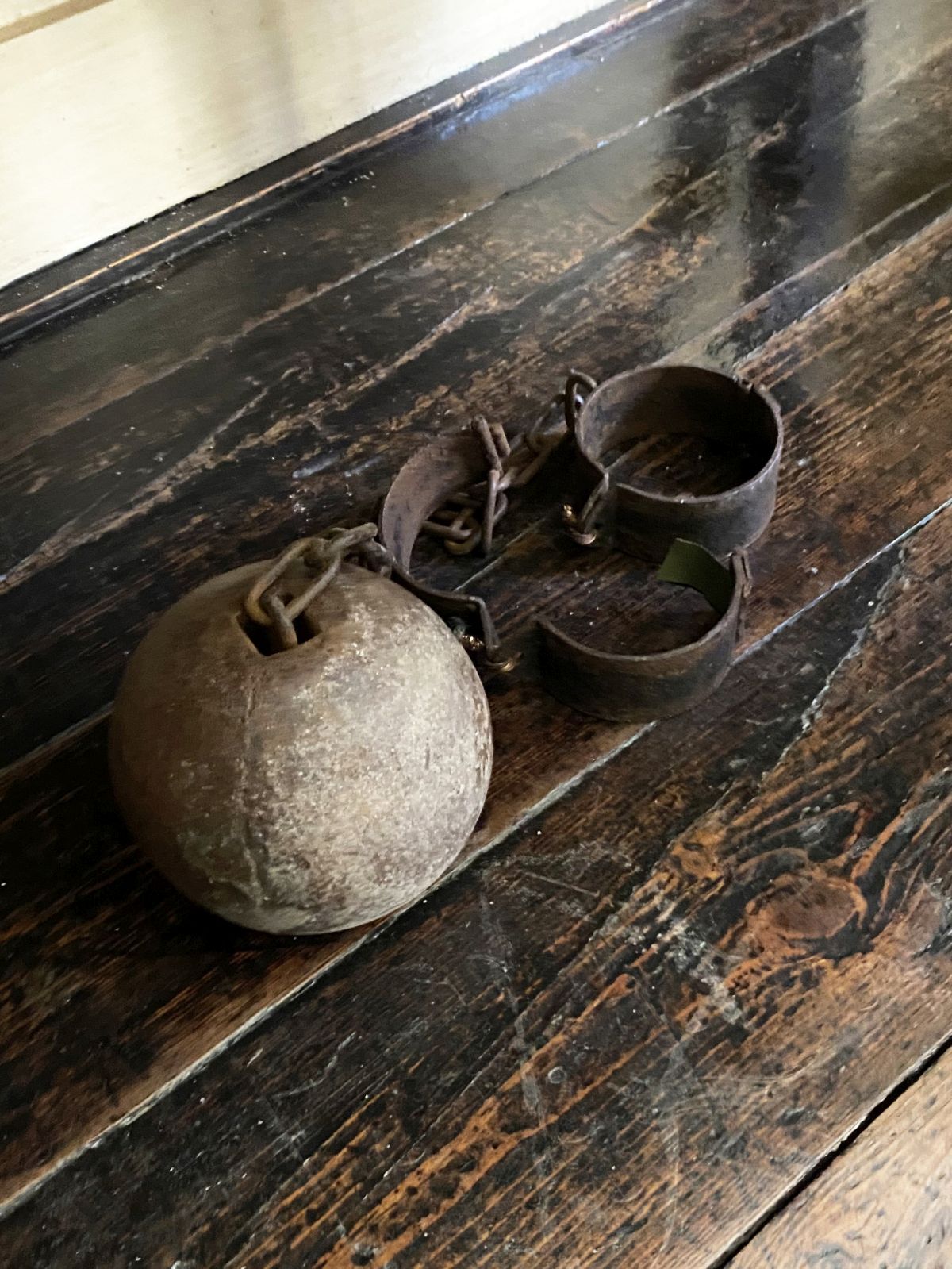 Iron ball and chain, the spherical weight attached to a riveted iron shackle and chain.