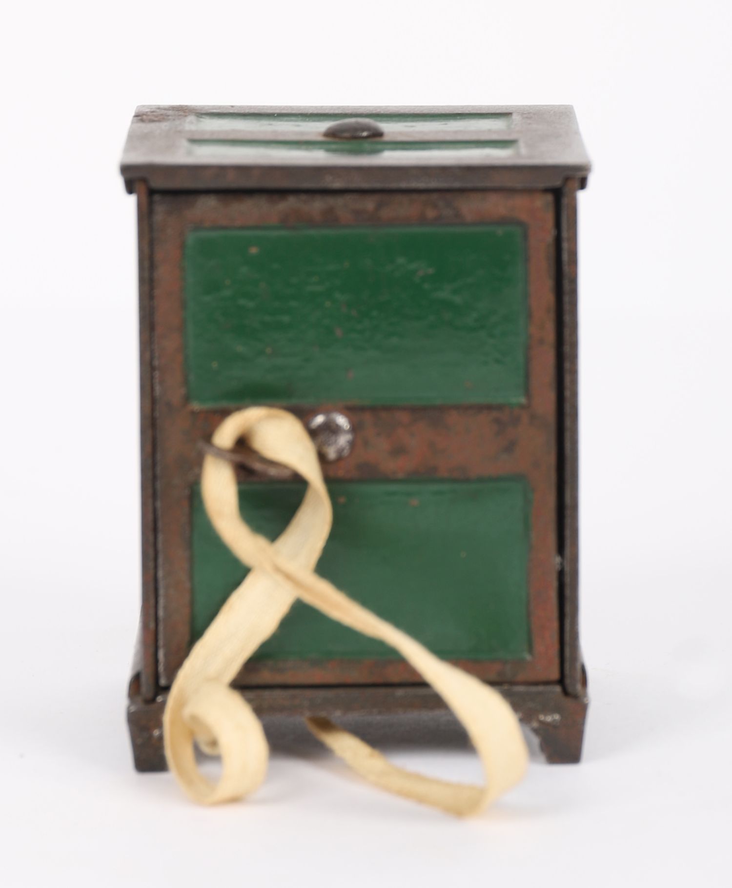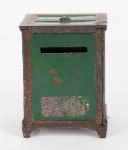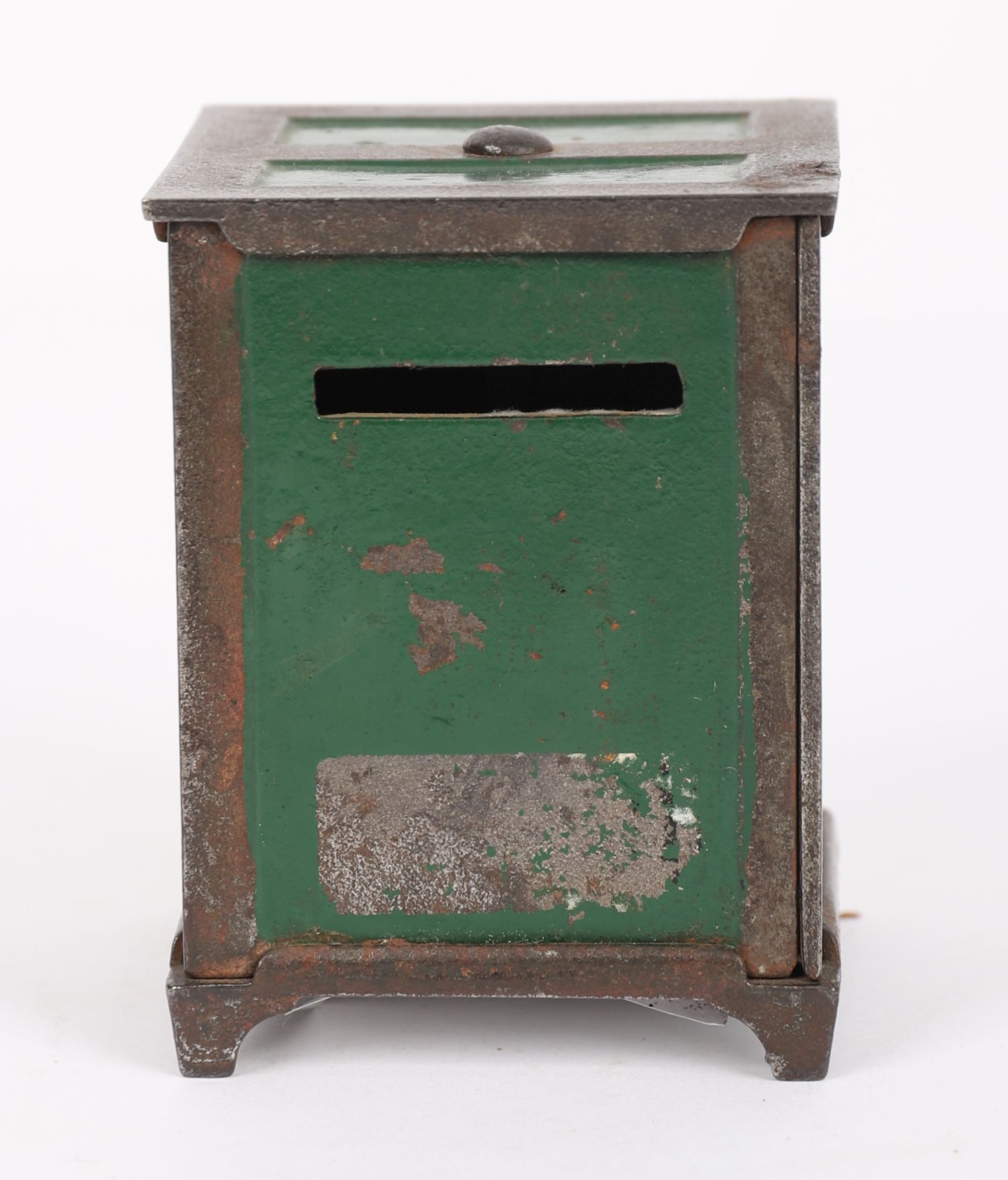A late 19th to early 20th century cast iron and tinplate money box, painted in green with slot to the top and raised on four feet. Of simple yet robust construction.