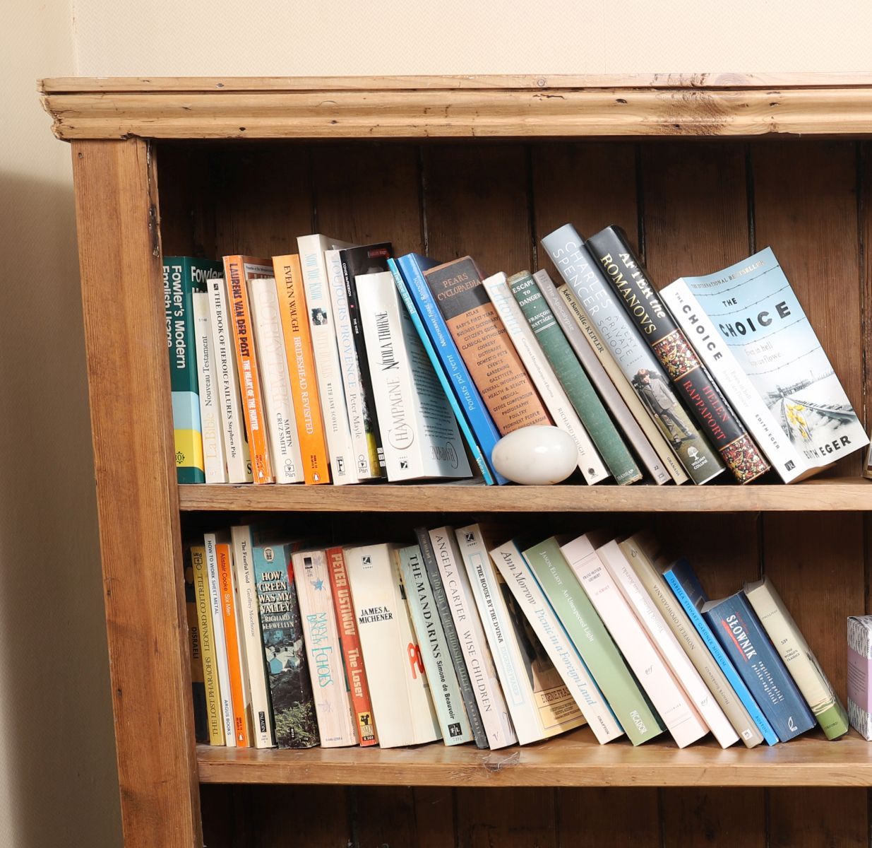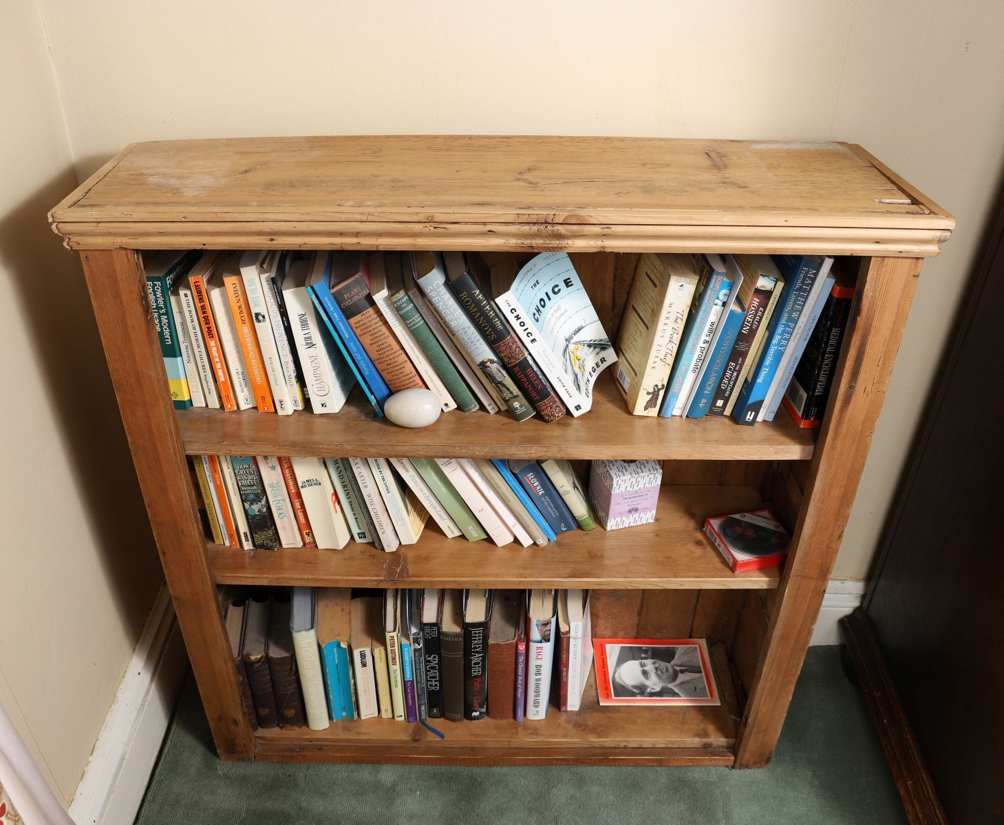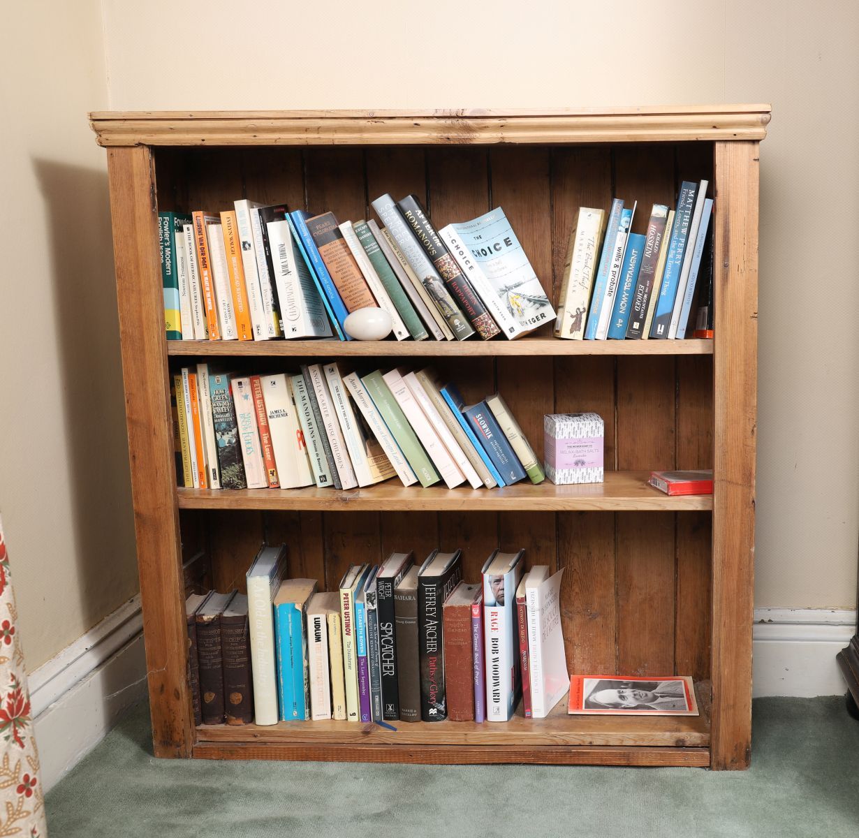 An antique pine open bookcase with moulded top, three open shelves, and plain upright supports.
