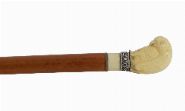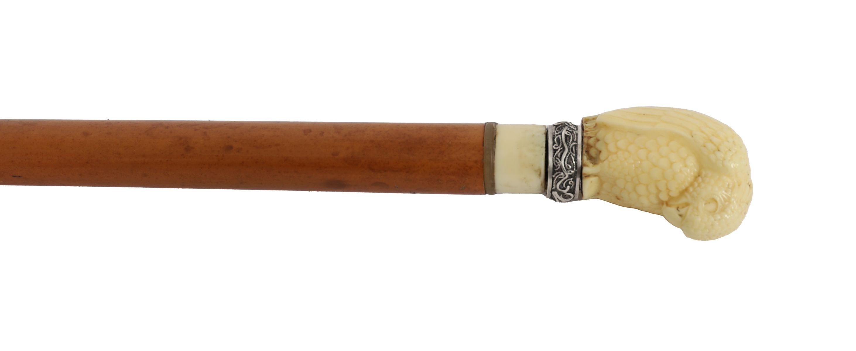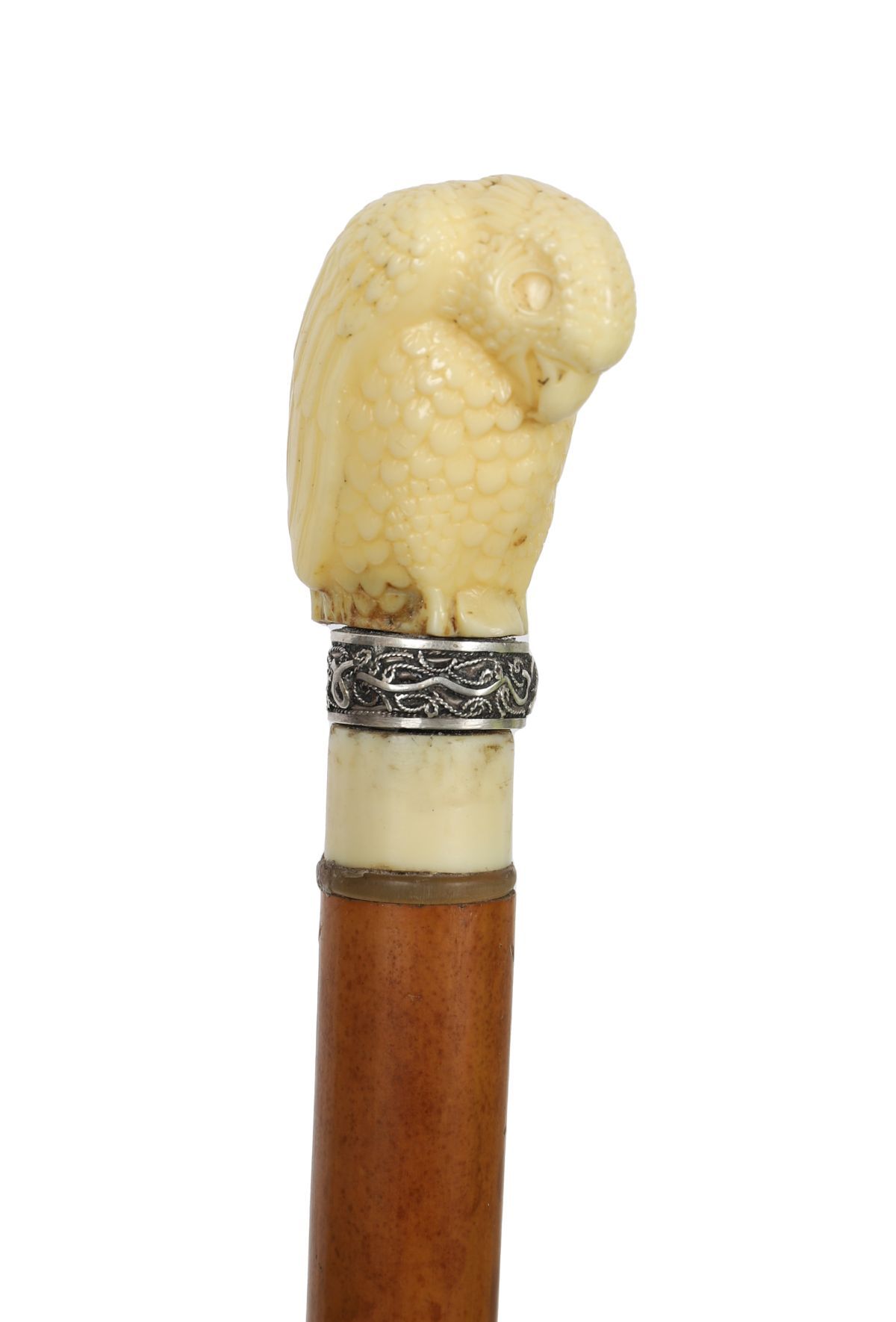 Lot 1338 ANTIQUE SILVER-MOUNTED WALKING STICK WITH CARVED BONE OWL HANDLE