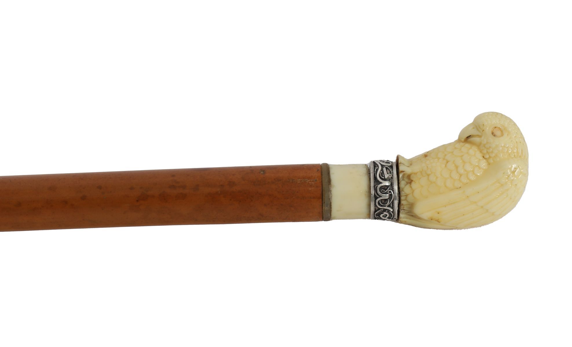 An antique walking stick with carved bone owl handle and silver collar, mounted on a tapering wooden shaft.