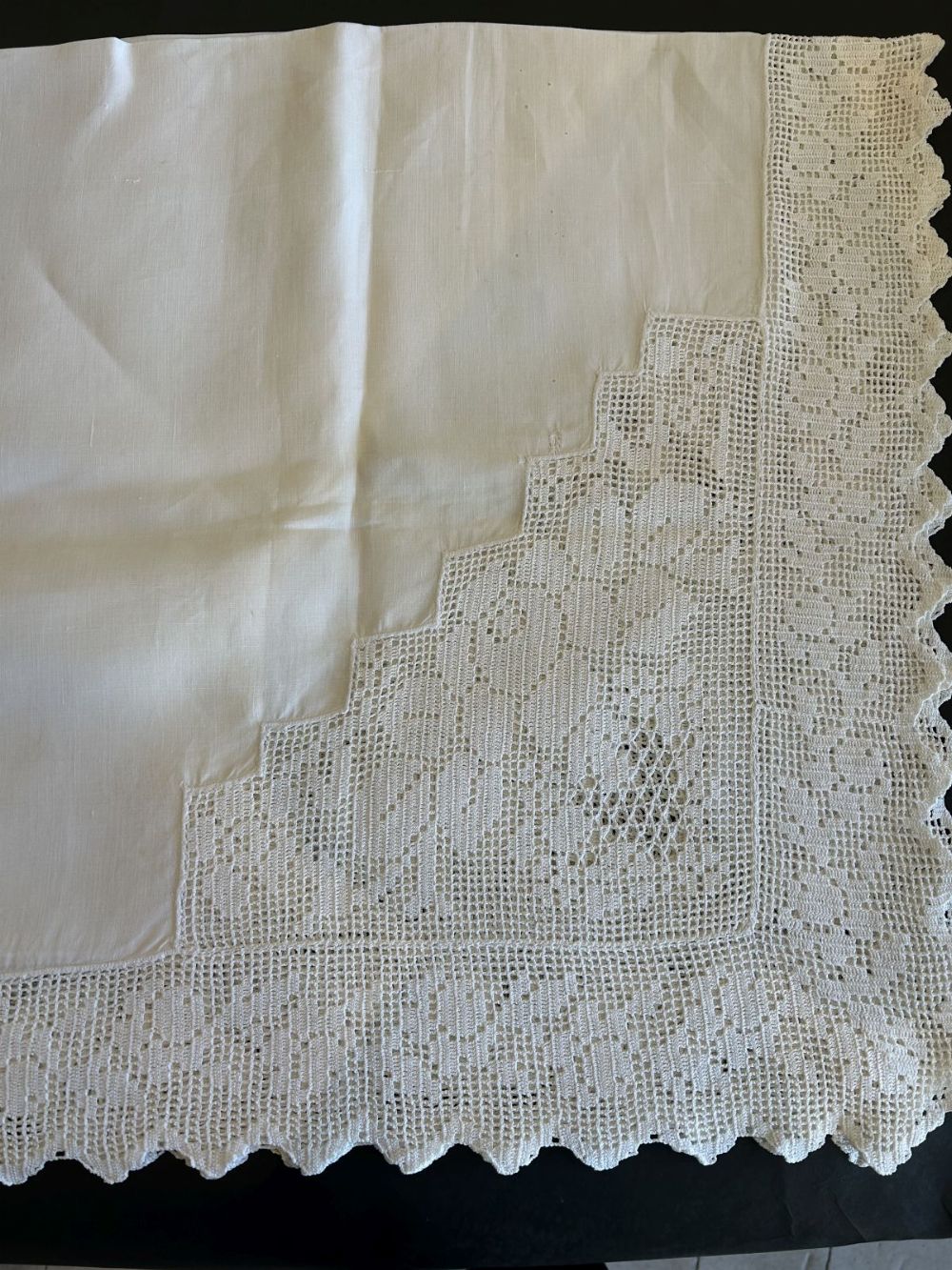 Made of linen fabric with a 'hand crochet style' often in a 'filet crochet' which is a grid pattern.
