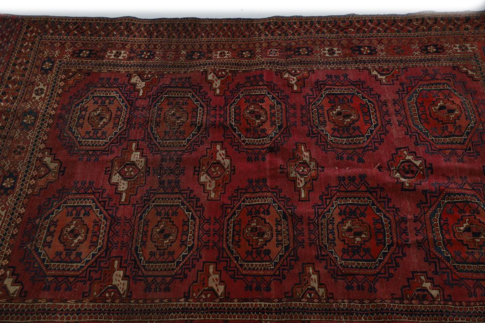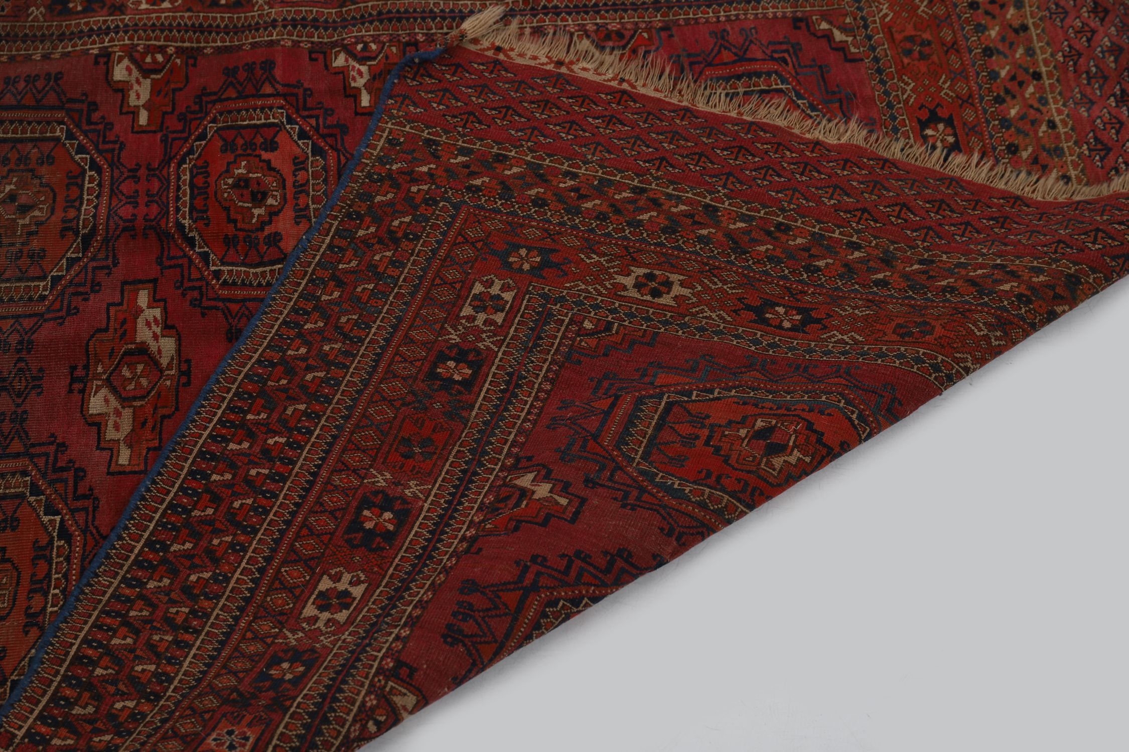A finely handwoven Turkmen rug, likely Tekke or Yomut tribe, with a field of repeating gul motifs in deep crimson, indigo, ivory, and ochre, framed by multiple geometric borders. The central field displays three vertical rows of octagonal primary guls, interspersed with smaller secondary guls and stylised floral devices. Borders comprise a broad main band with star motifs flanked by narrow guard stripes, all executed in rich vegetable-dyed wool. The rug retains its original flatwoven kilim ends and fringe.
