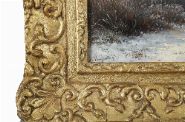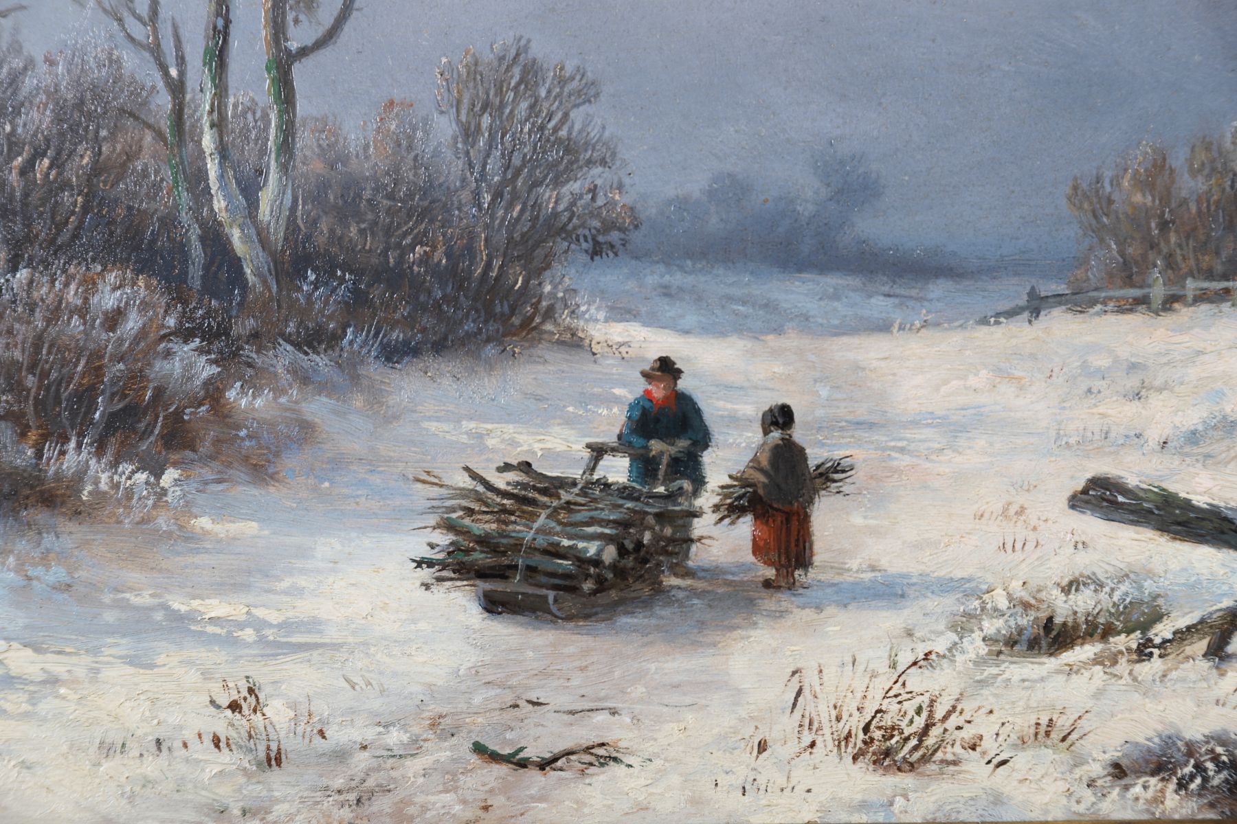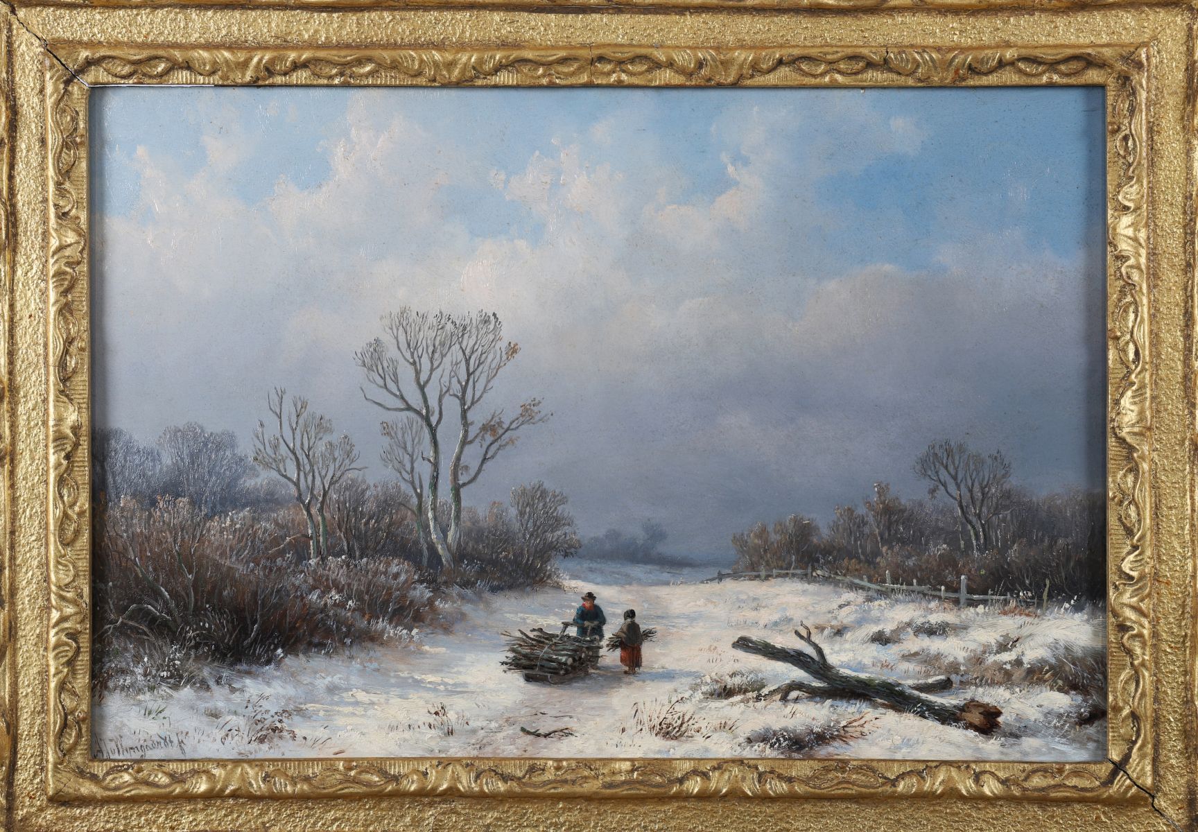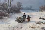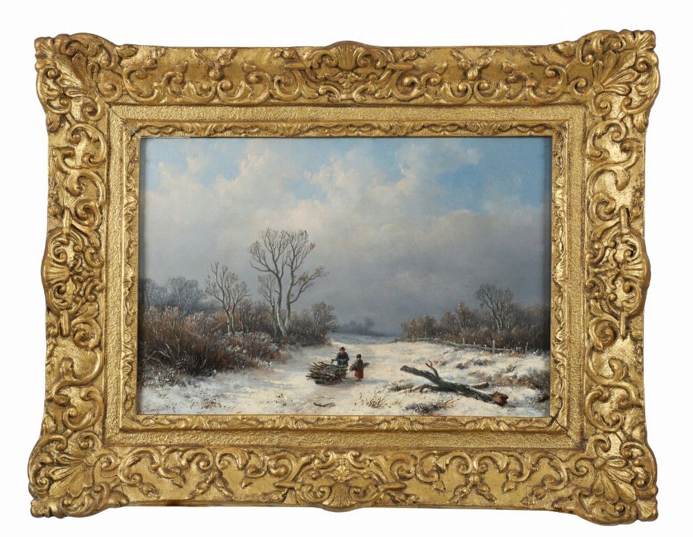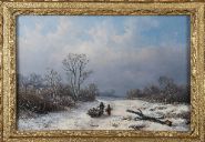 A serene winter landscape depicting two figures pulling a sled laden with wood along a snow-covered road beneath a grey sky. Oil on panel, signed lower right. Presented in an ornate gilt frame.