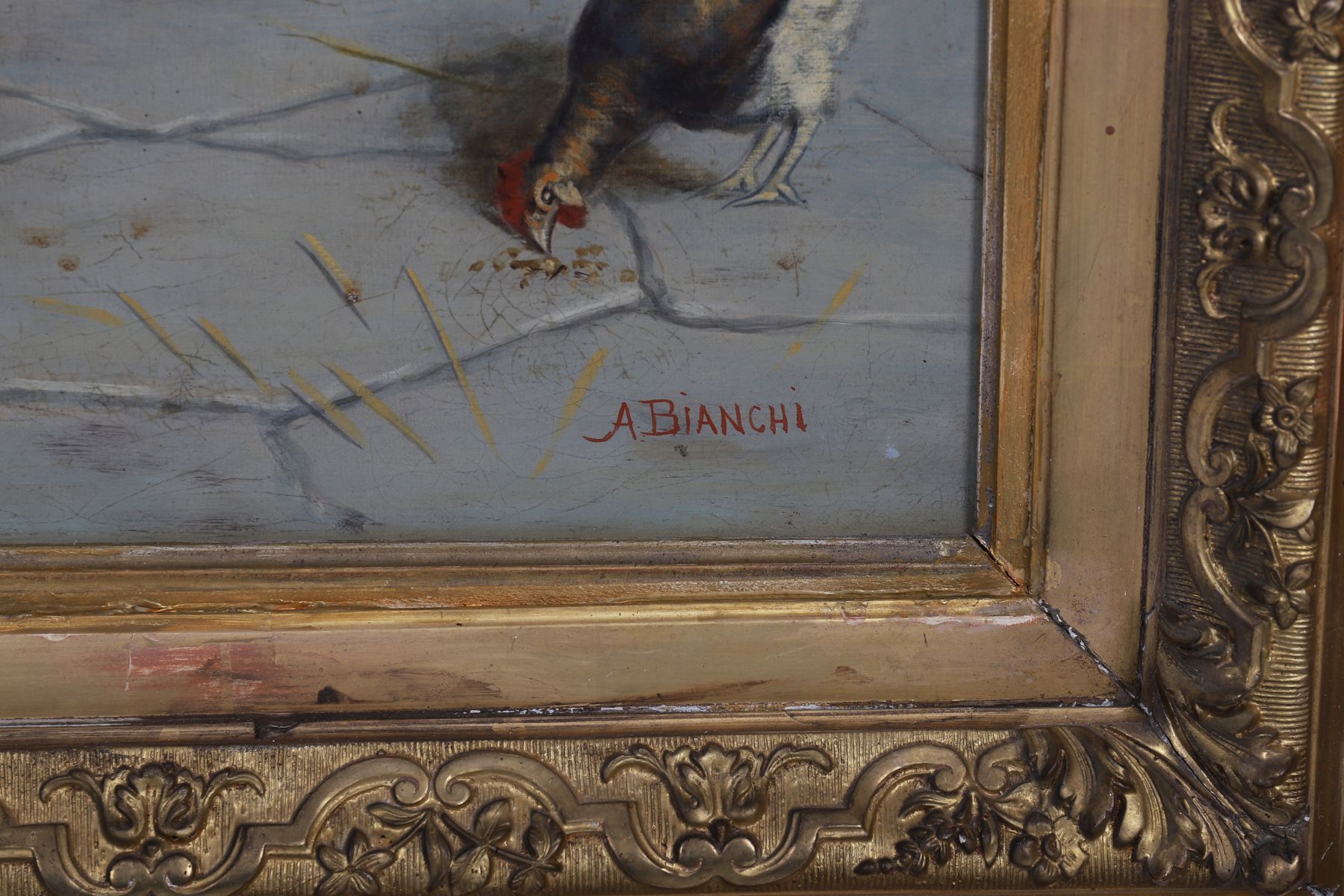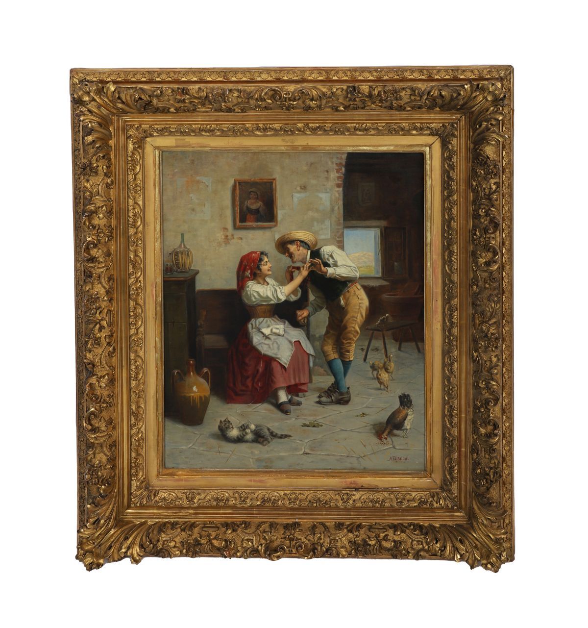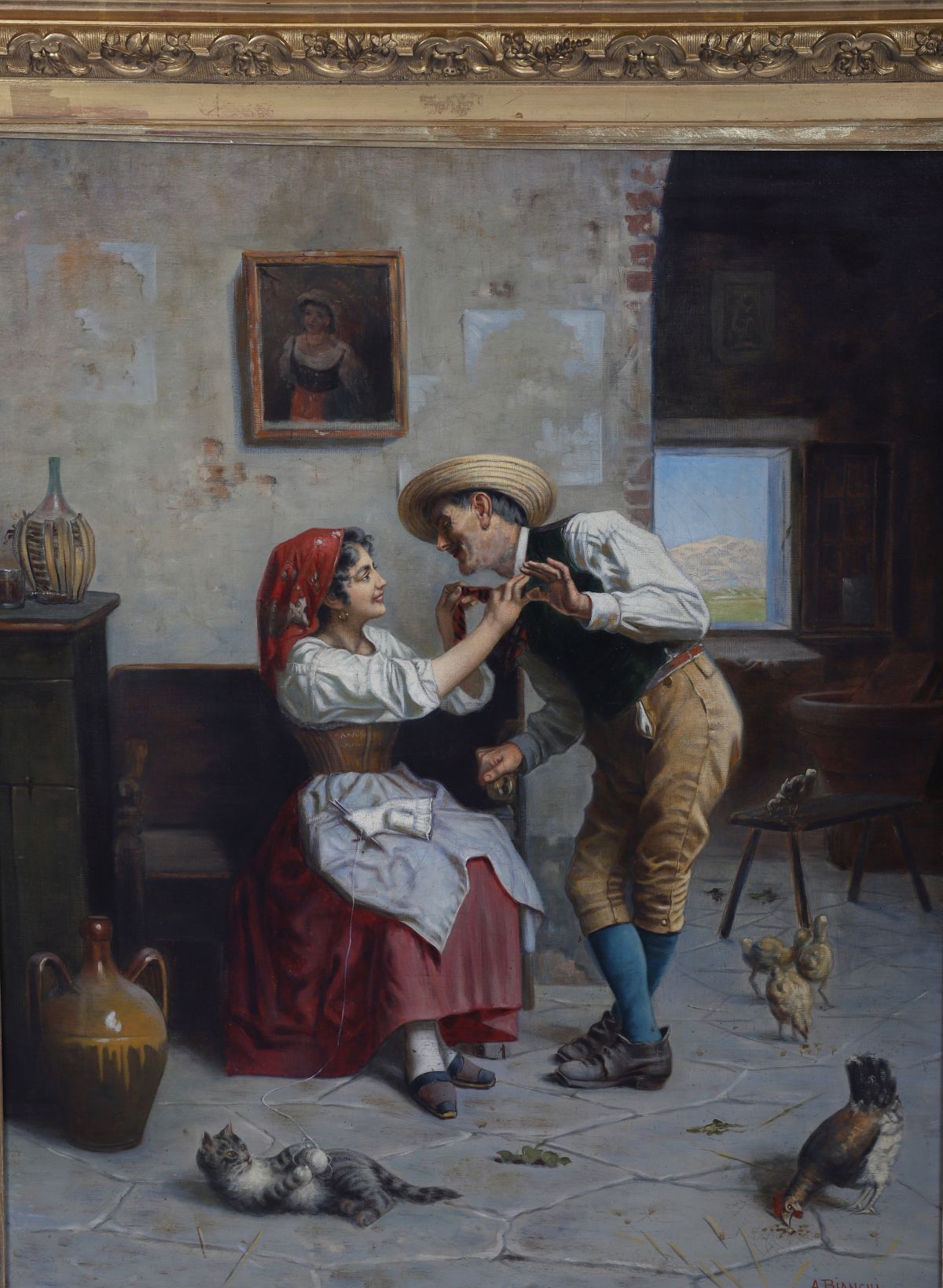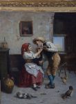 Oil on canvas. A finely detailed interior genre scene depicting a young couple in a rustic setting, surrounded by domestic animals and everyday objects.