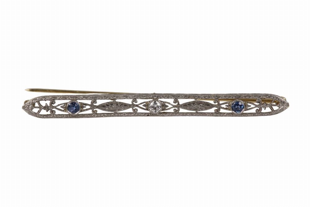 A finely detailed Art Deco white metal brooch with pierced geometric design, set with sapphires and old-cut diamonds.