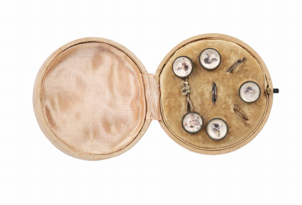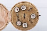 A set of Art Deco period stock pin and matching buttons, each with reverse intaglio horse and hound motifs under glass, presented in the original fitted circular box.