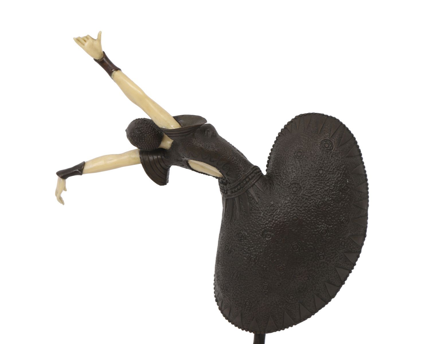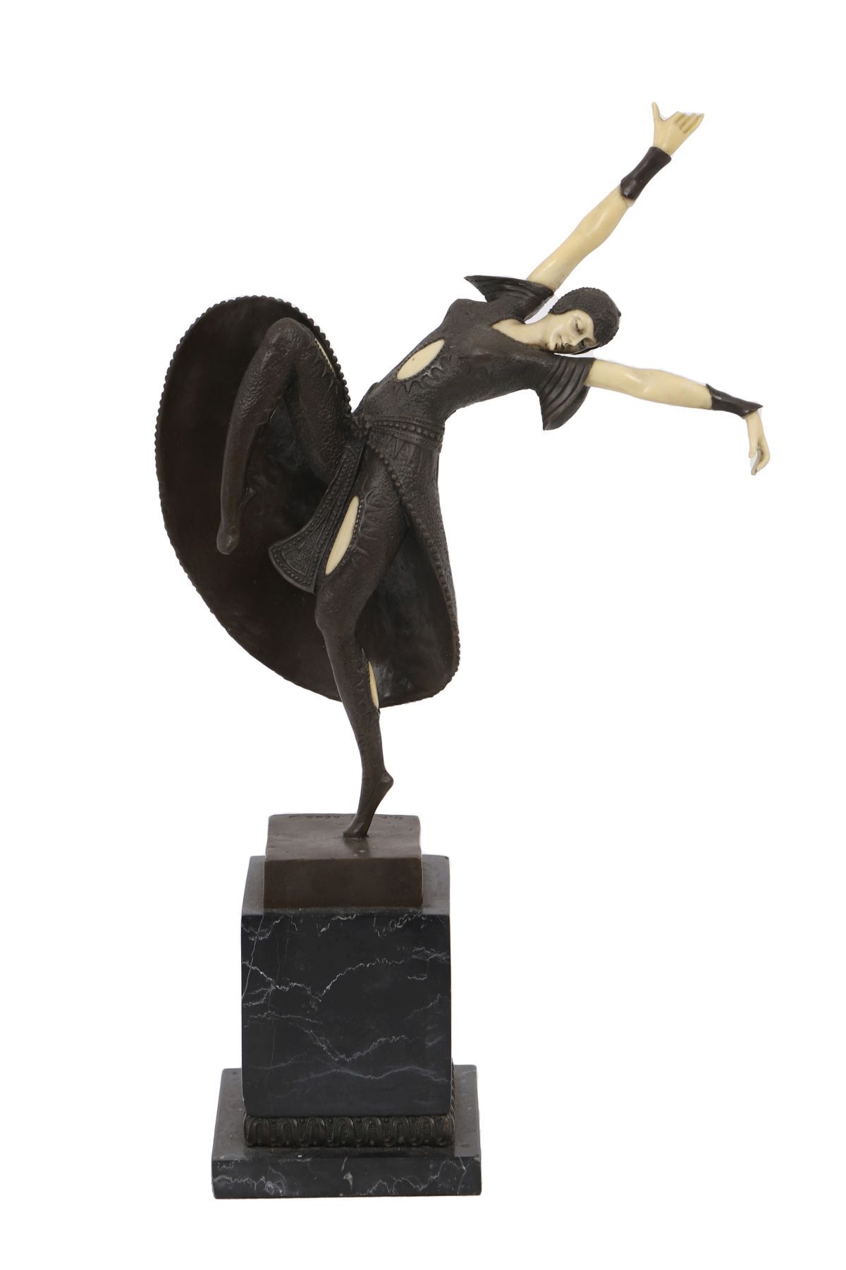 Depicting a dancer in a dynamic pose, mounted on a stepped marble base, characteristic of early 20th century Art Deco design.