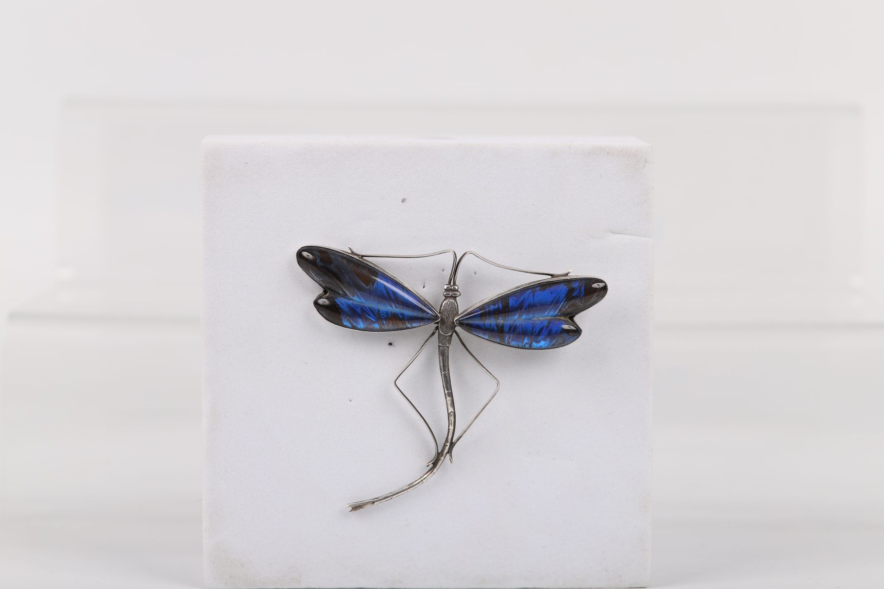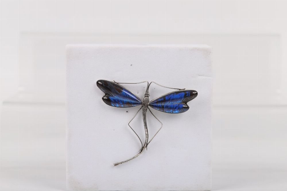 A large Art Nouveau-style sterling silver brooch modelled as a dragonfly, with iridescent blue enamel wings and detailed body and legs.