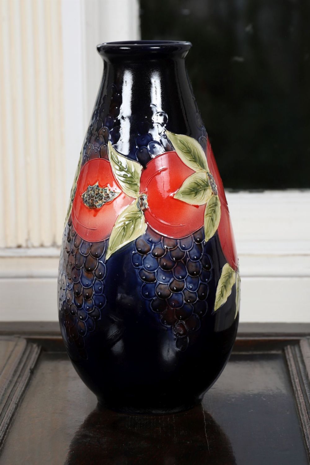 An art pottery vase of tapering form, decorated in high relief with stylised fruit and foliage in polychrome glazes against a dark ground. The surface richly modelled and glazed throughout.