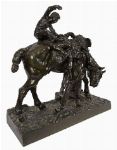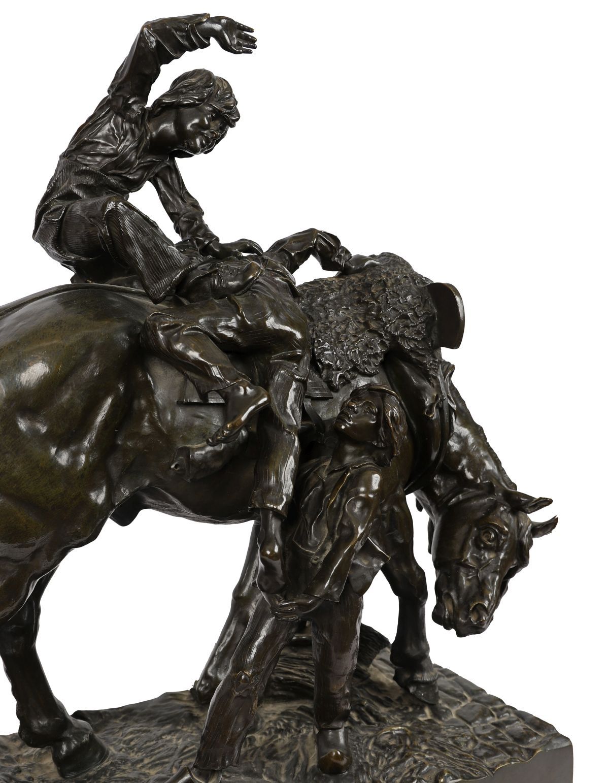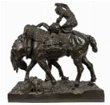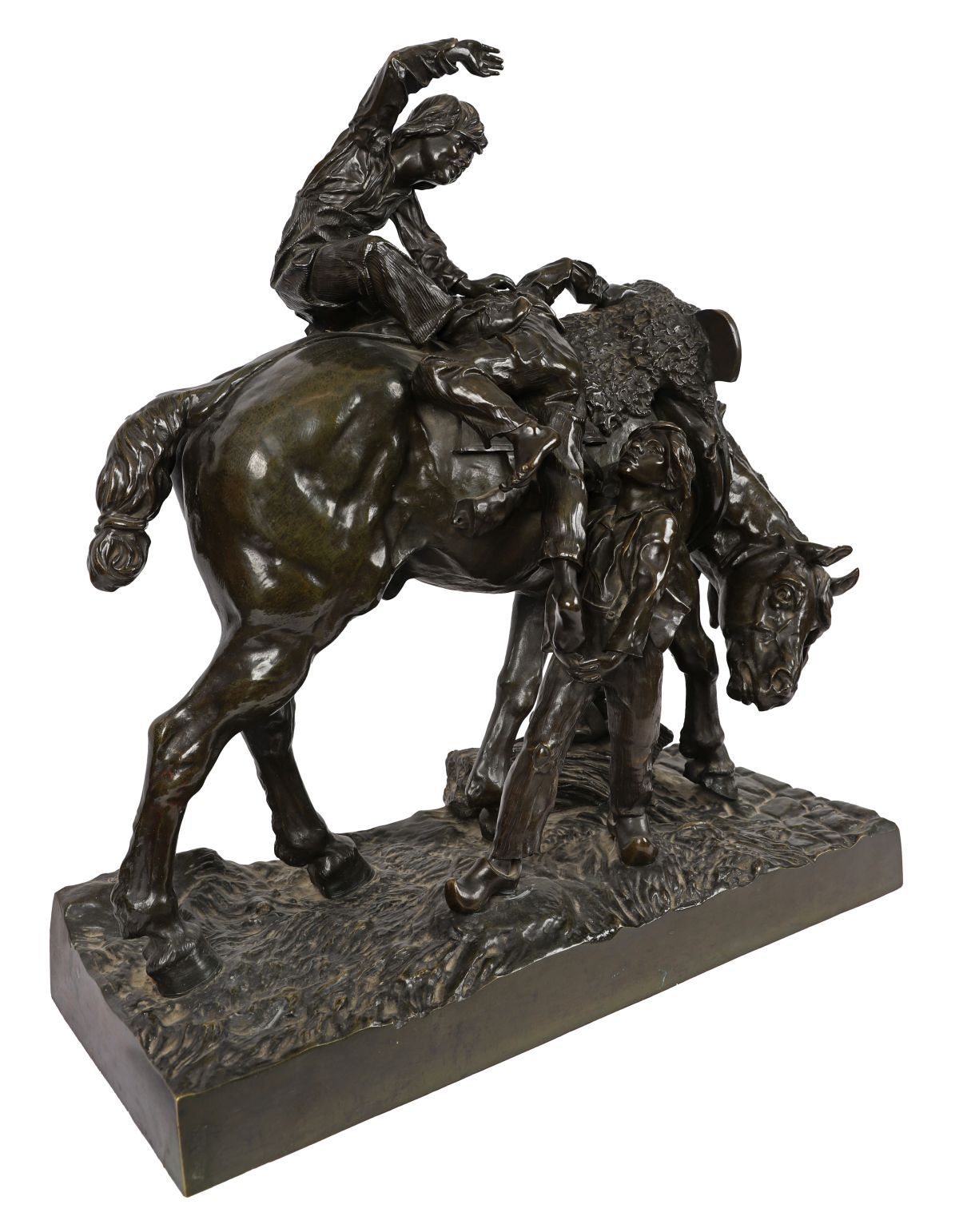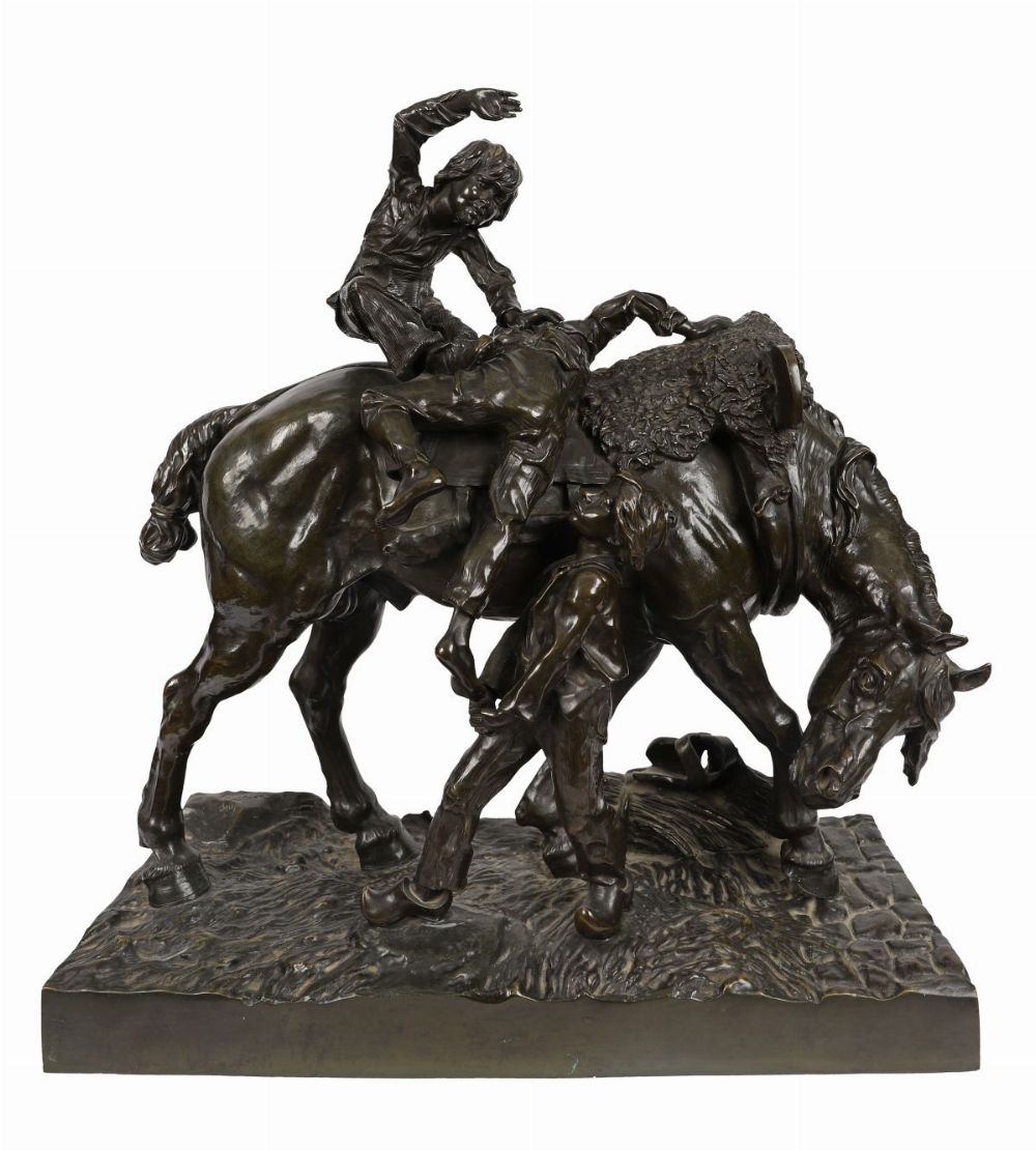 Large 19th-century bronze group of a horse and three children. A substantial and finely cast bronze group by Arthur Jacques Leduc, depicting a standing horse attended by three children in a lively and naturalistic composition. One child sits astride the horse, while two others stand at either side — one guiding the bridle and the other positioned beneath the horse’s neck, raised on an integral naturalistic base with cobbled ground detail.