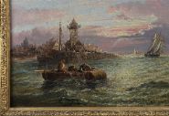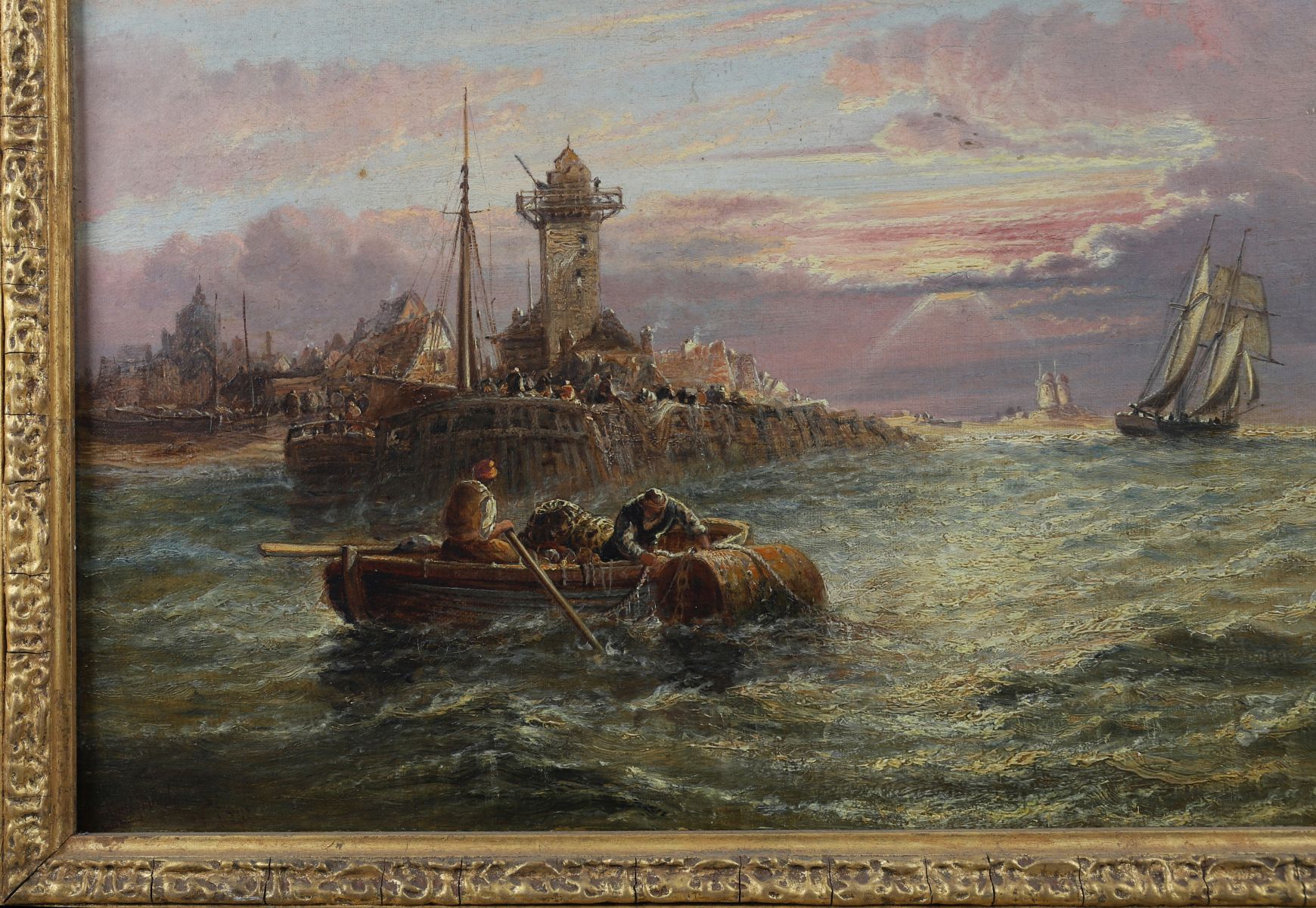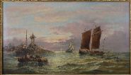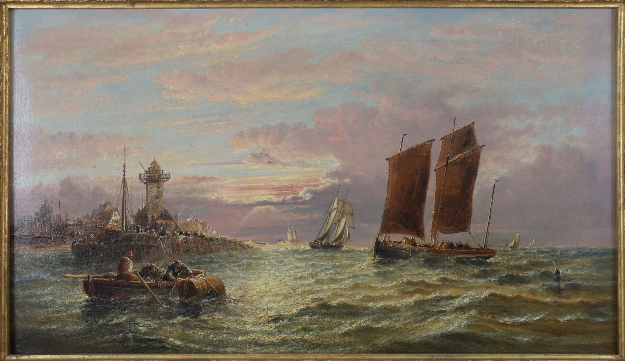 Coastal view at sunset depicting sailing boats and fishermen near Blankenburg, with dramatic evening light over calm waters. Oil on canvas, signed lower left. Presented in a gilt frame.