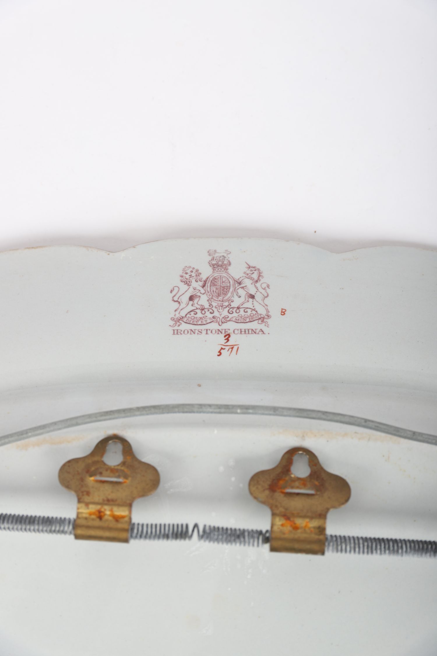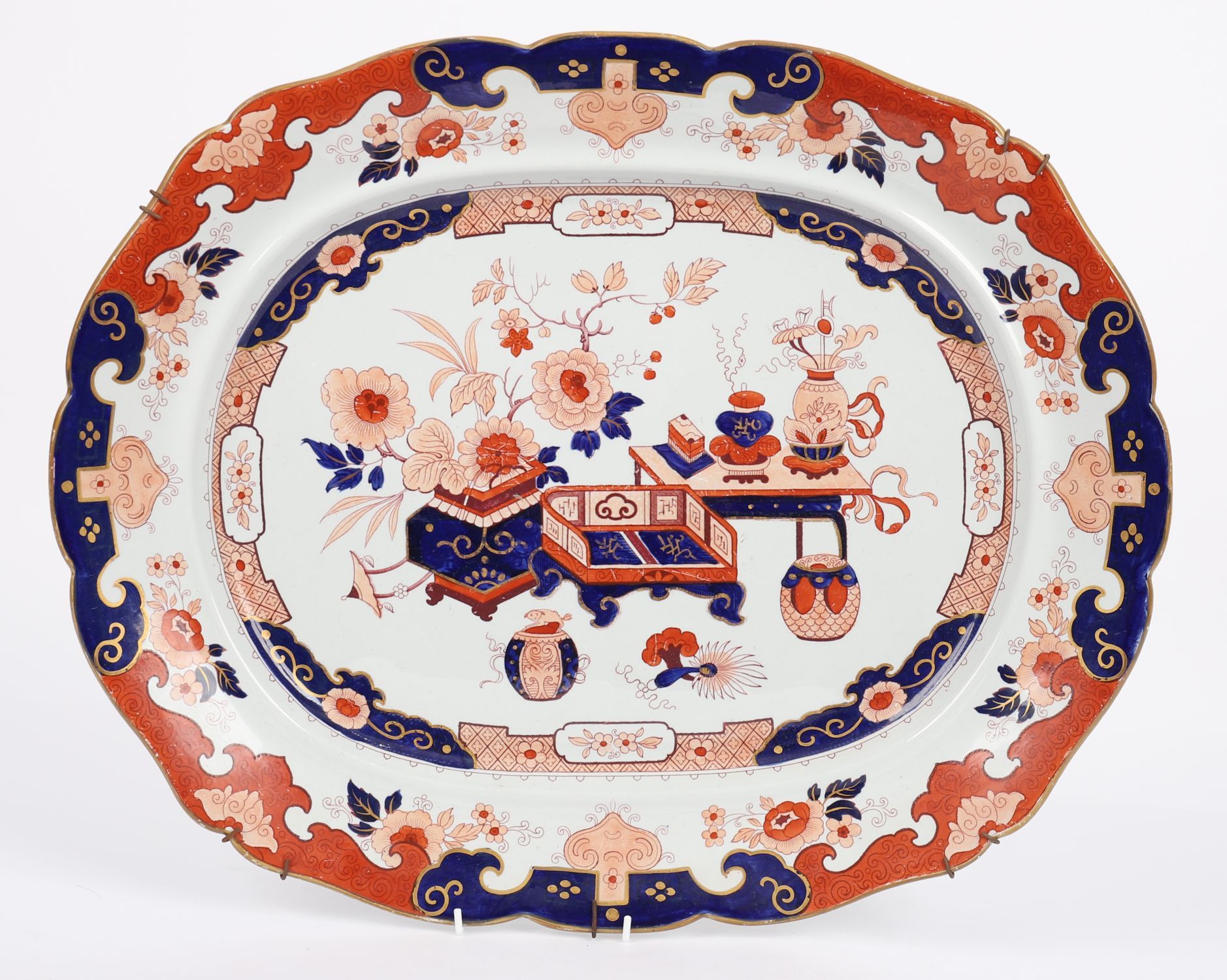 A large Ashworth ironstone platter, decorated in an Imari palette of cobalt blue, iron red, and gilt, with stylised floral and vase motifs.