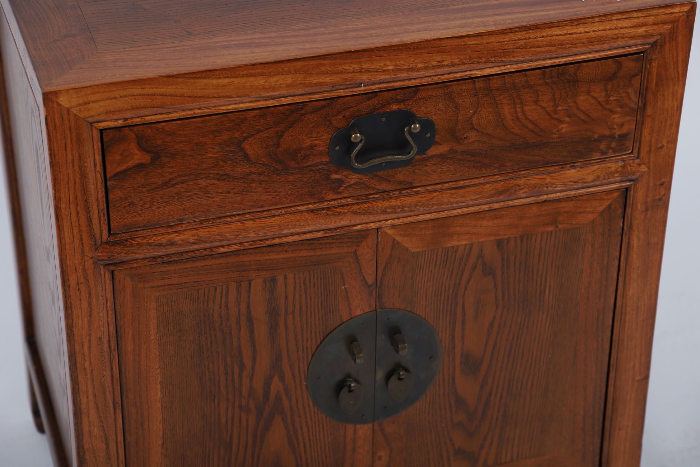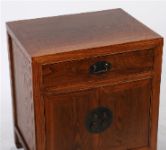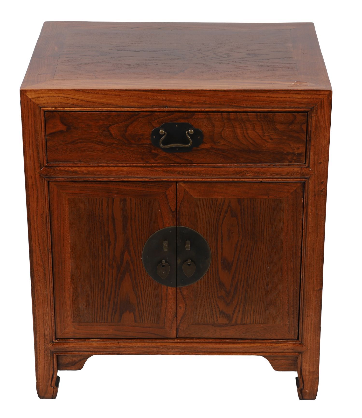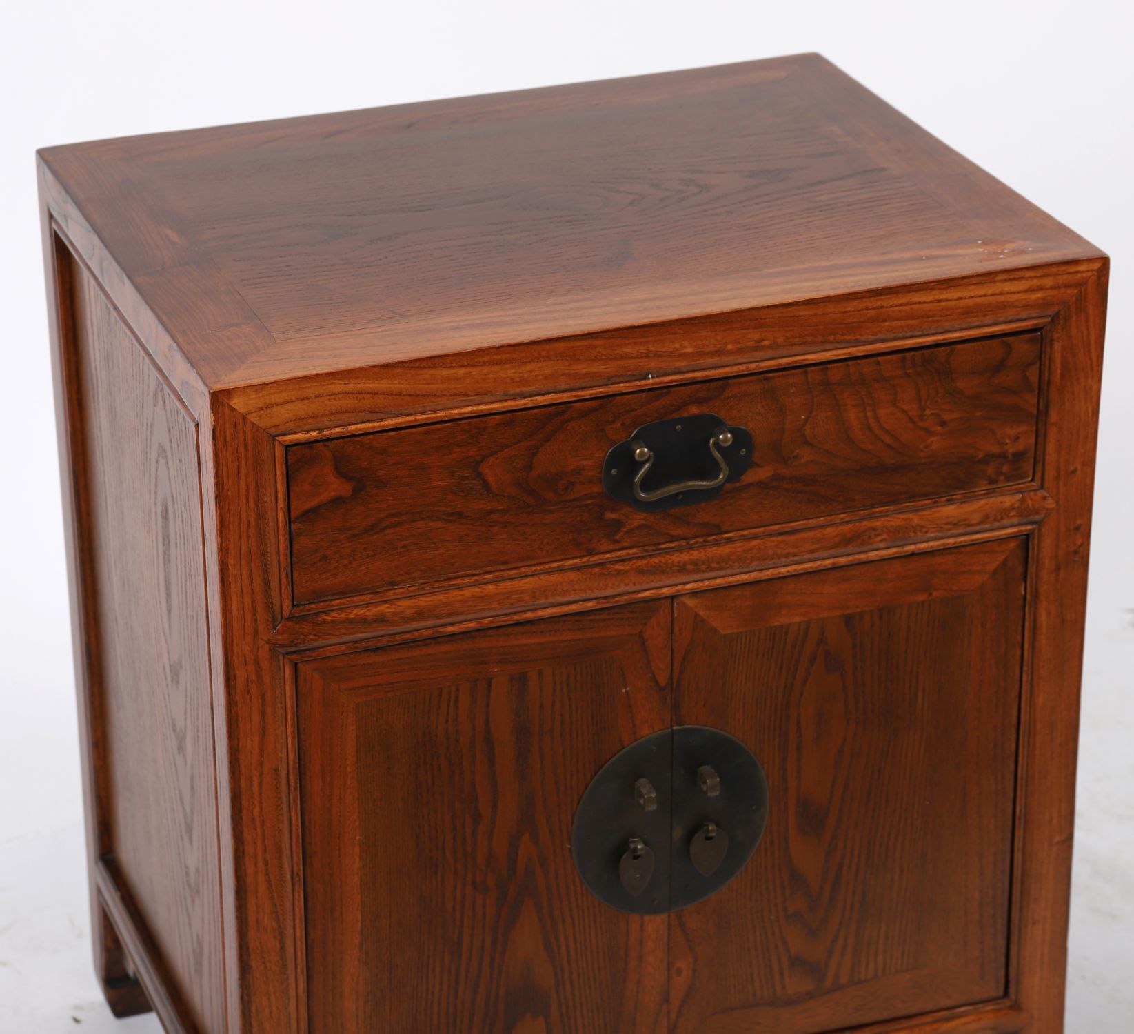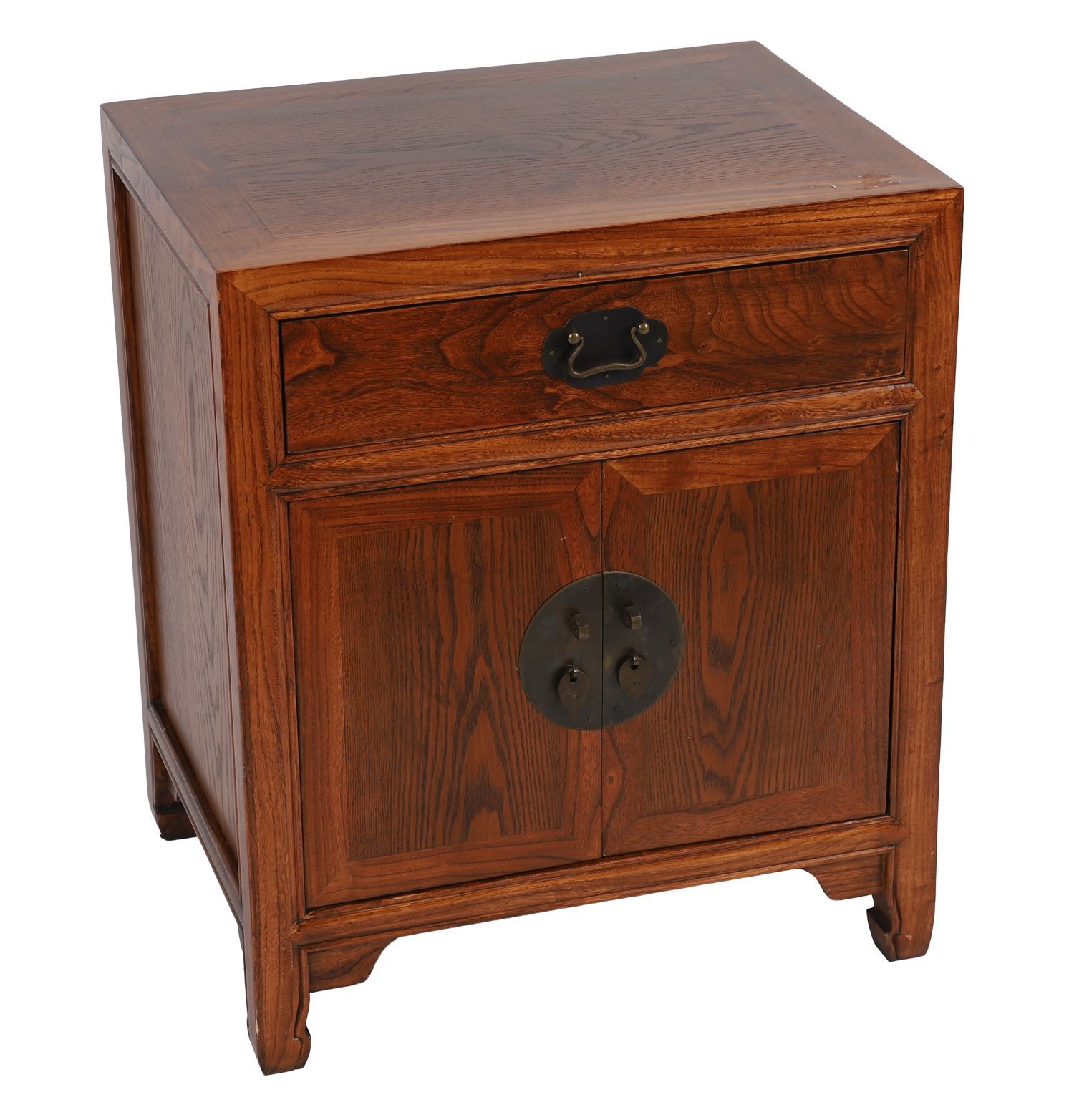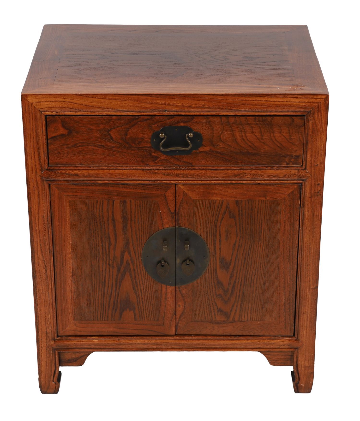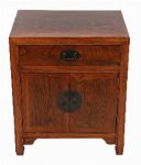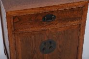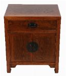 Compact hardwood side cabinet with single drawer and double-door cupboard below, fitted with traditional oriental-style black metal fittings. A practical and decorative piece.
