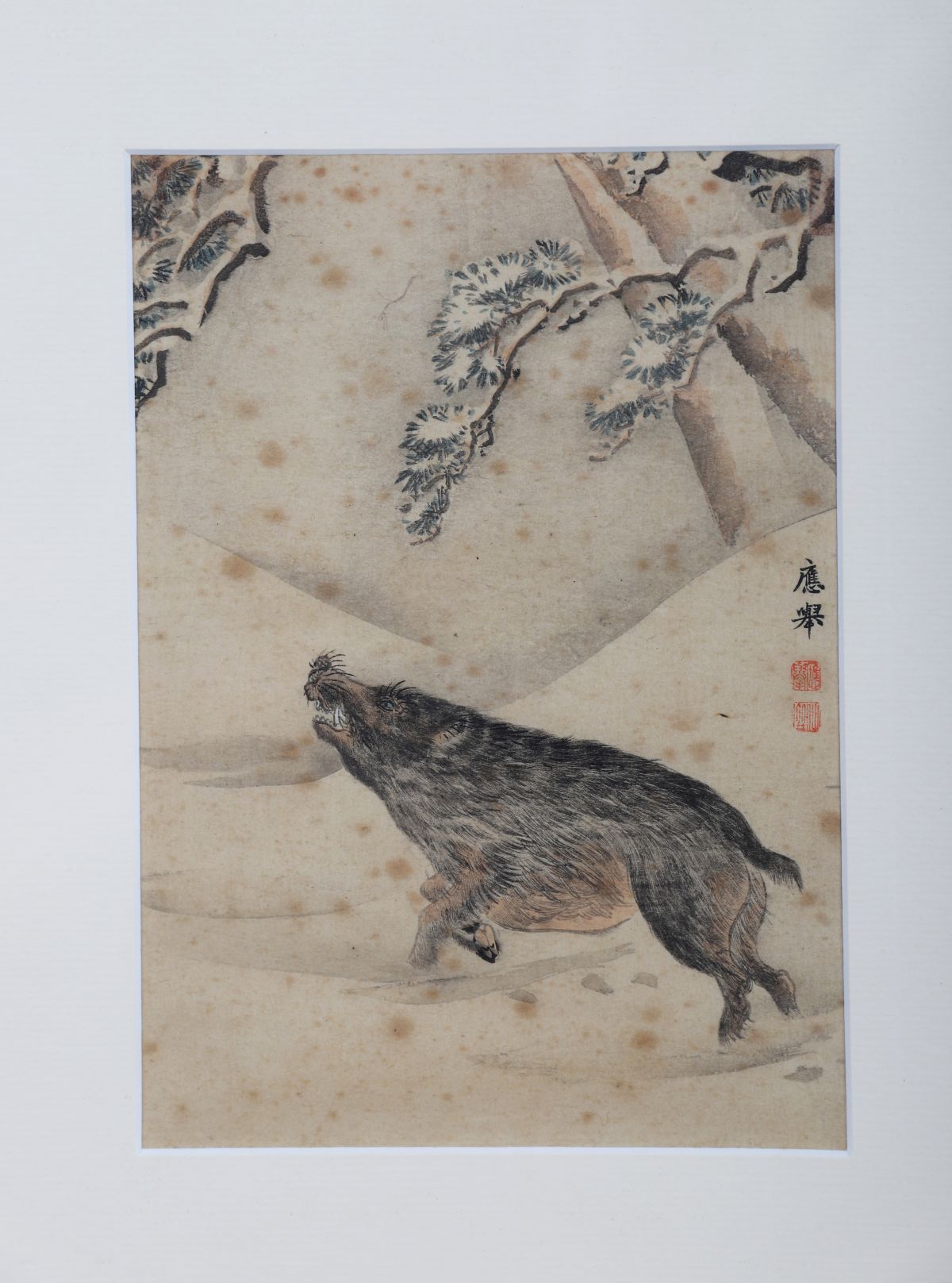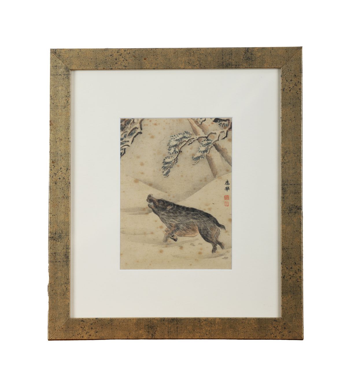 A Japanese painting on paper depicting a wild boar in profile beneath overhanging pine branches, executed with fine brushwork and subtle ink shading. Signed “Ōsaka” (應擇) with two red seals lower right. Presented in a cream mount and gilt frame.