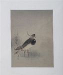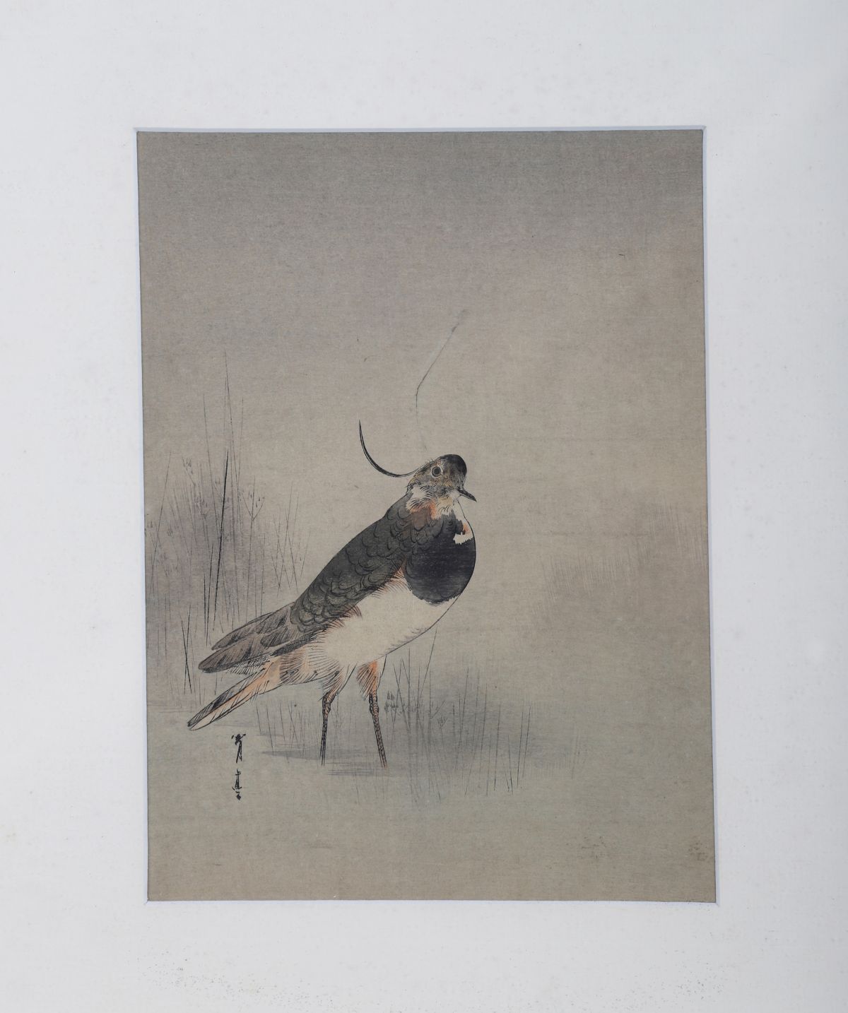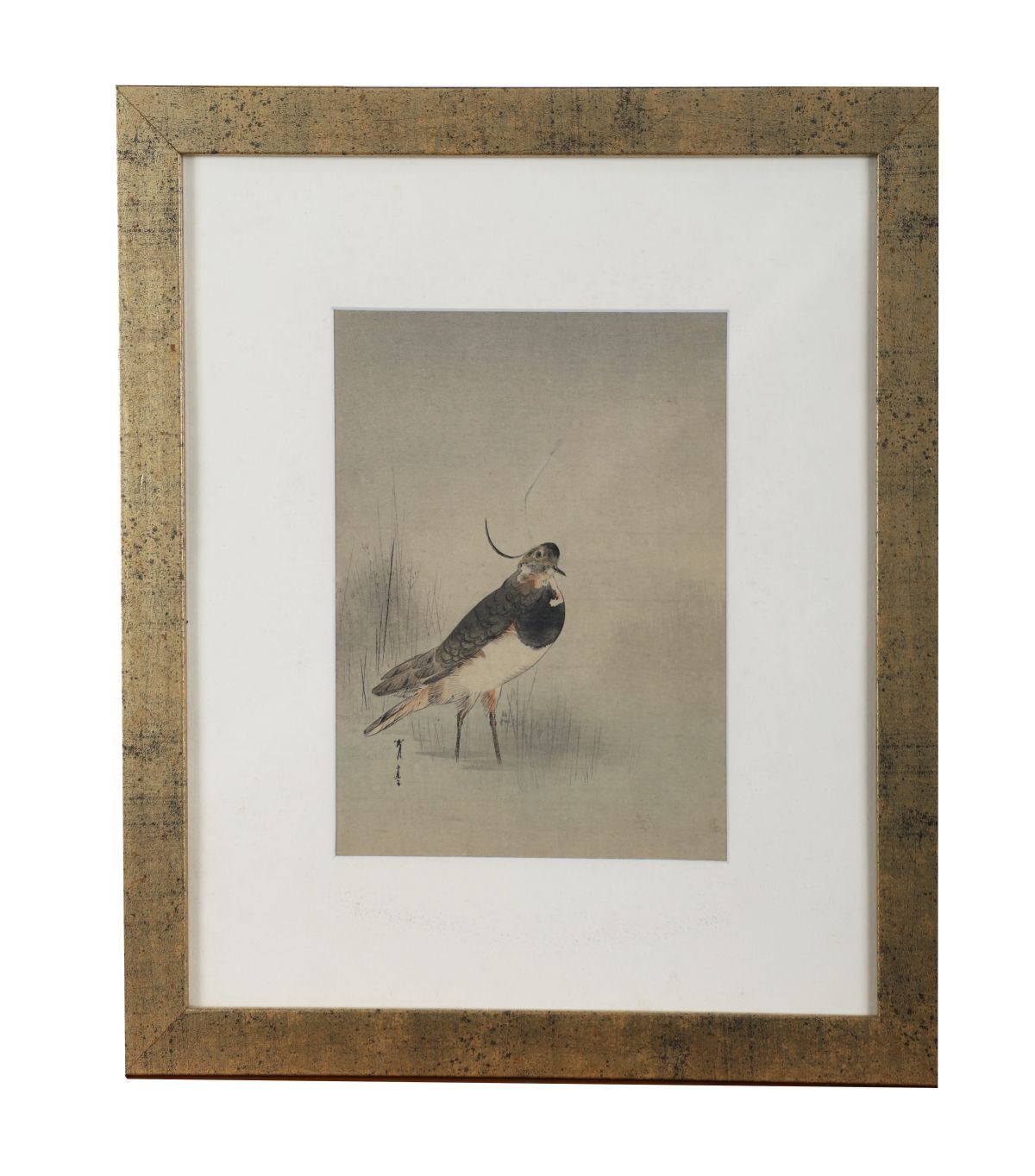 A Japanese Nihonga painting on paper depicting a lapwing standing among reeds against a soft grey background. Signed “Seison” (青邨) lower left. Presented in a cream mount and gilt frame.