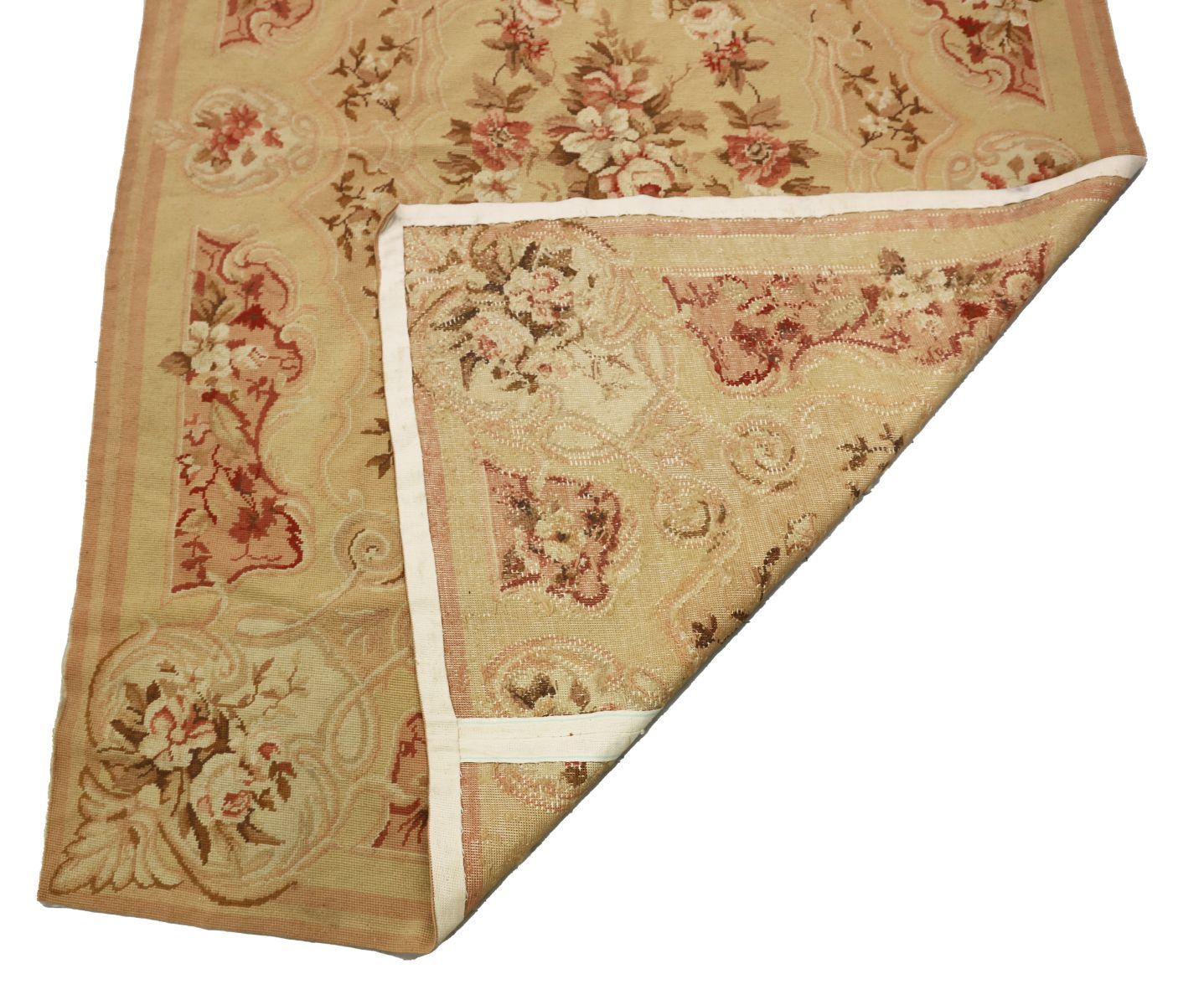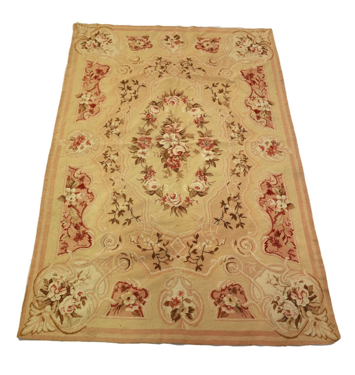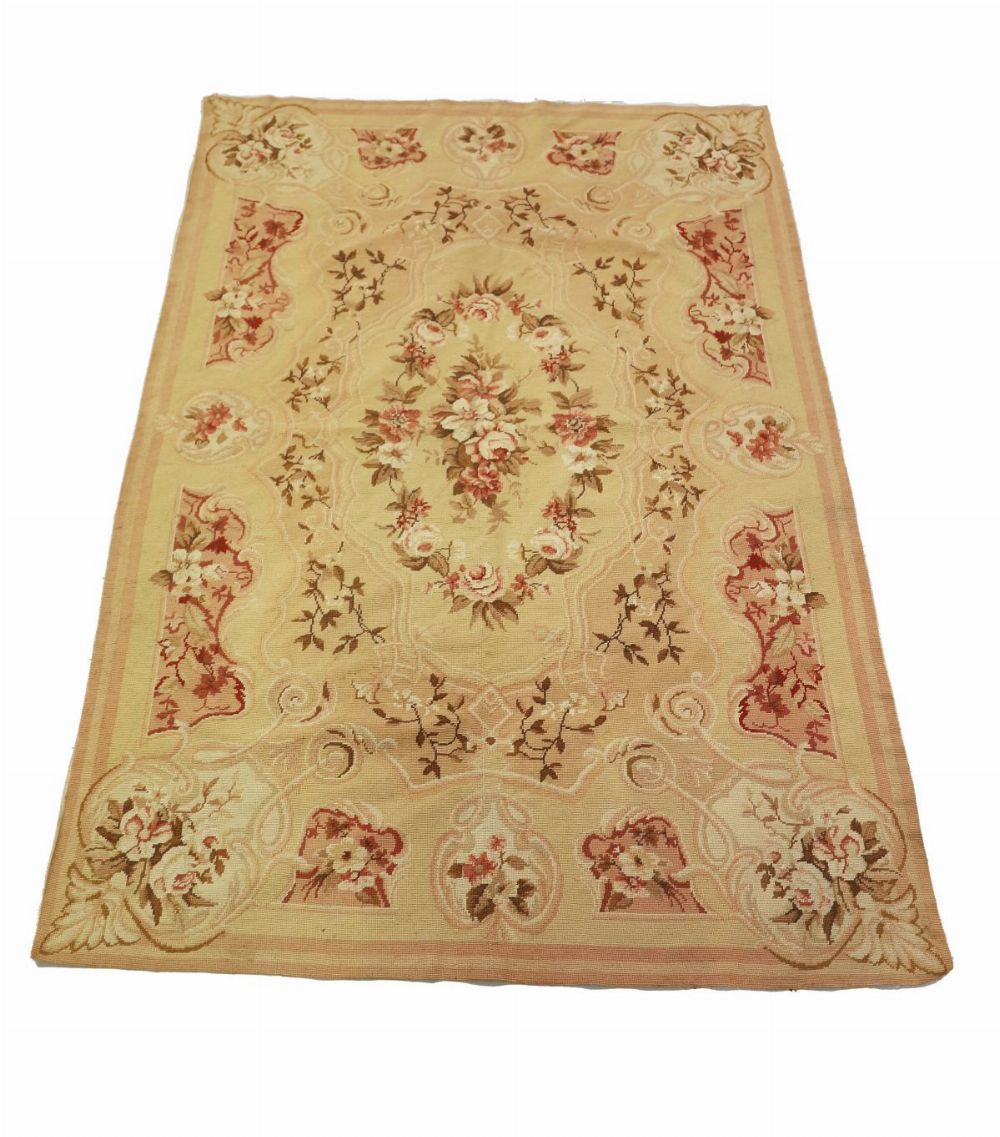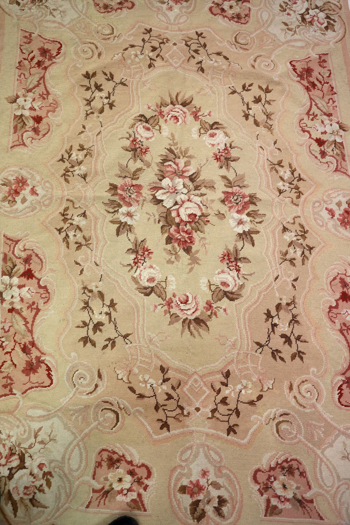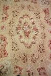 Cream ground with a central floral cartouched enclosed by spandrels and floral corner cartouches.