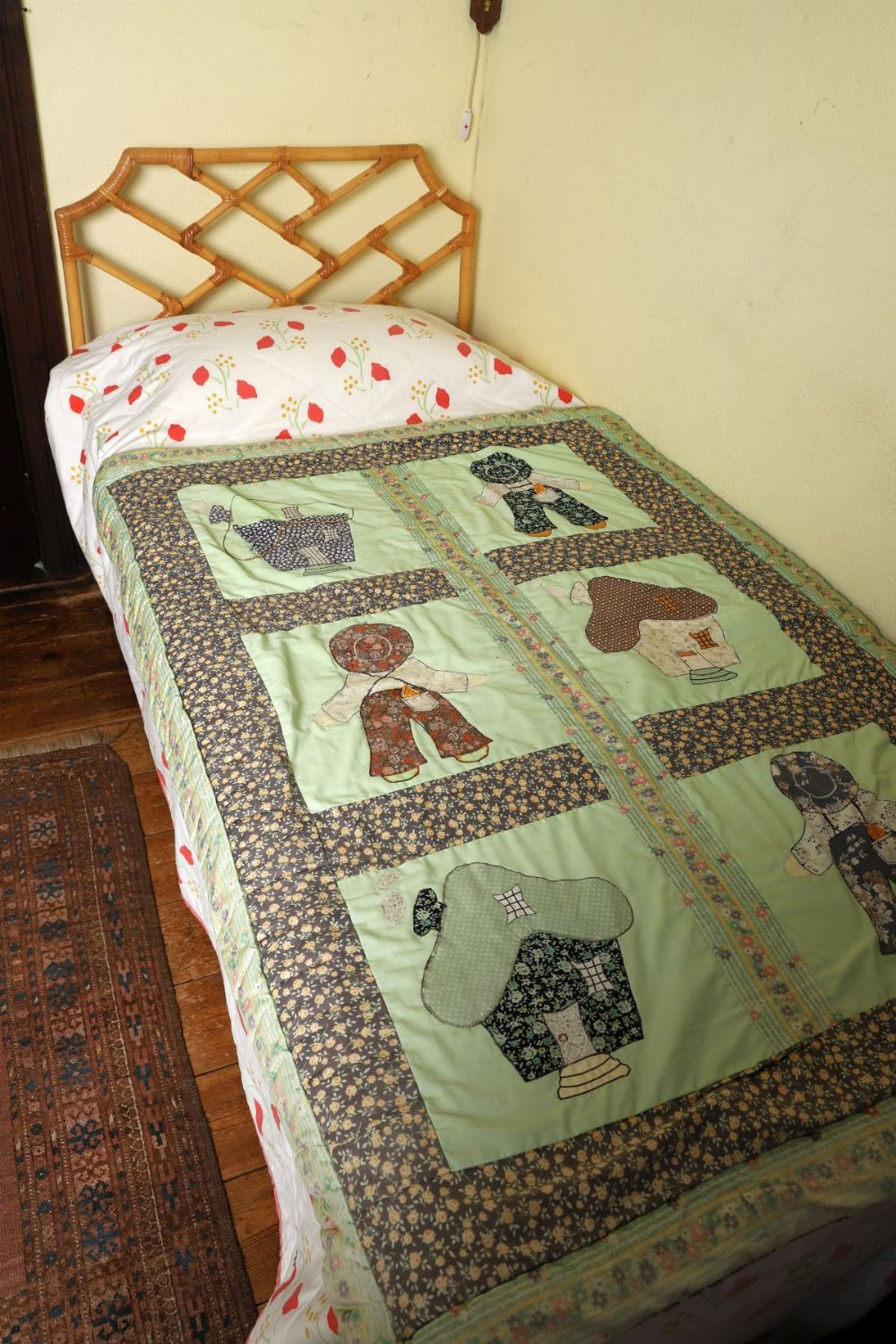 A bamboo-framed single headboard of lattice design.
