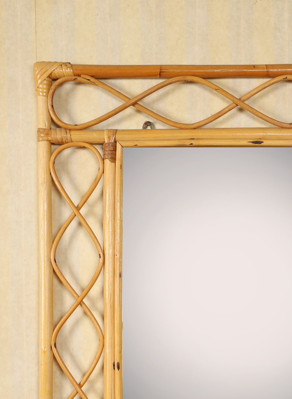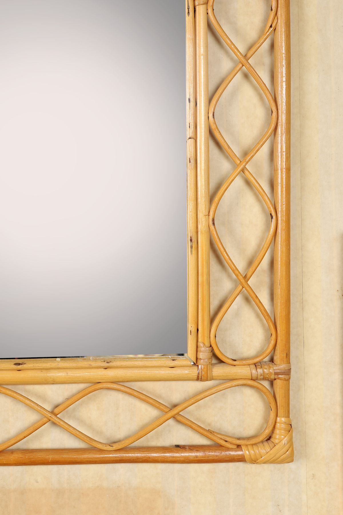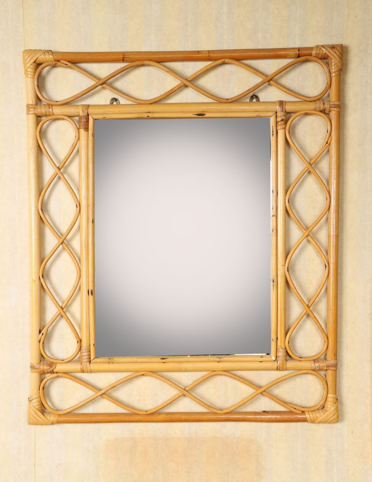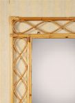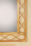 A bamboo-framed vanity mirror of rectangular form with woven detailing.