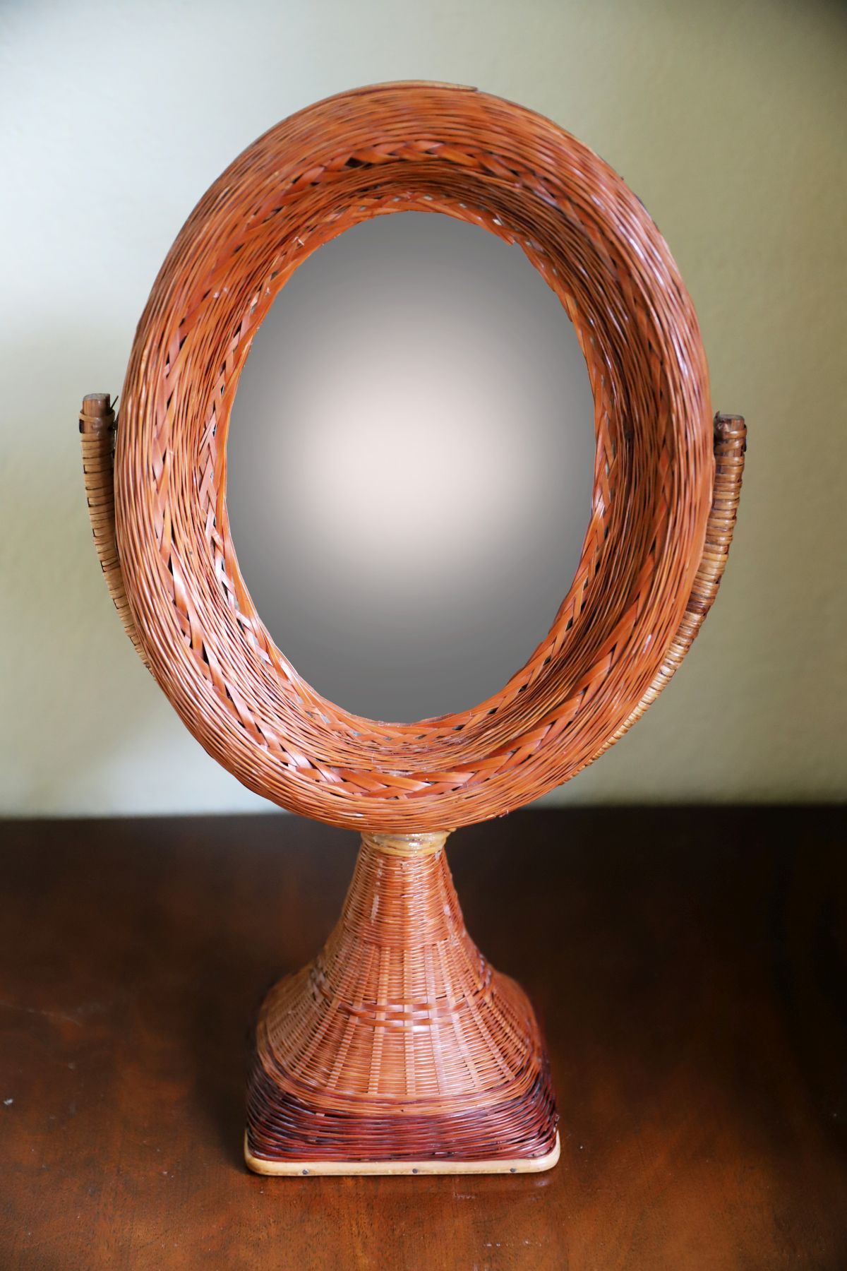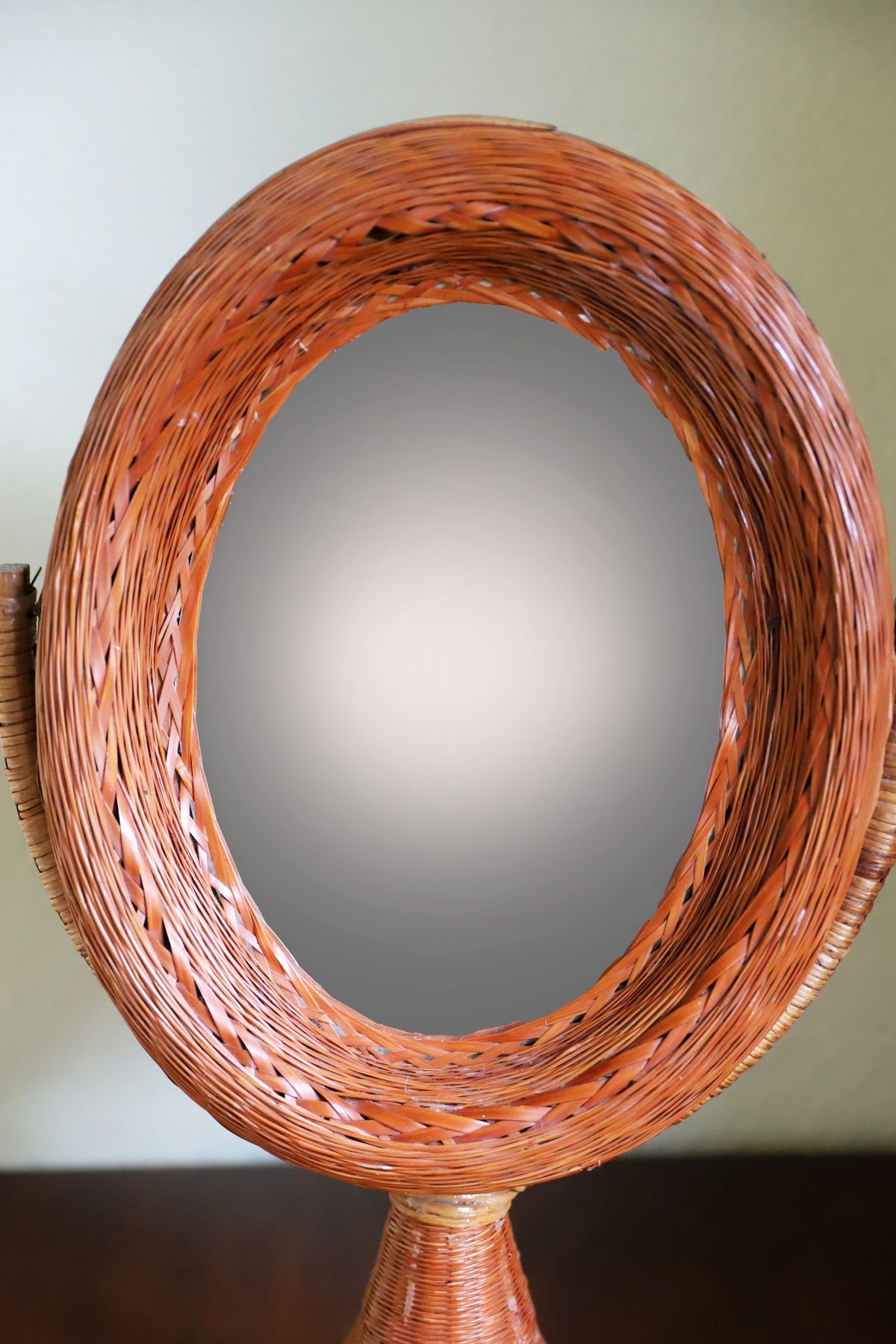 A basket-weave framed crutch mirror, the oval plate set within a woven wicker surround, raised on a tapering basket-weave support and plinth base.