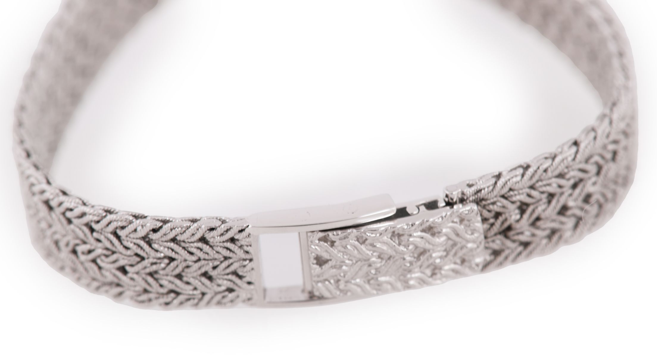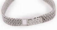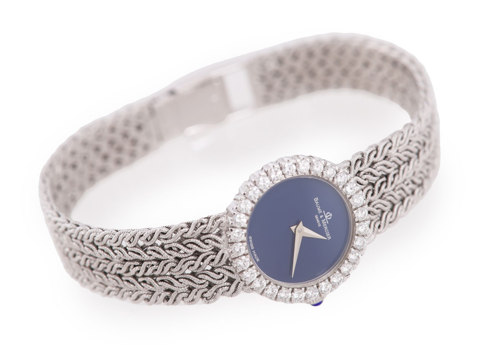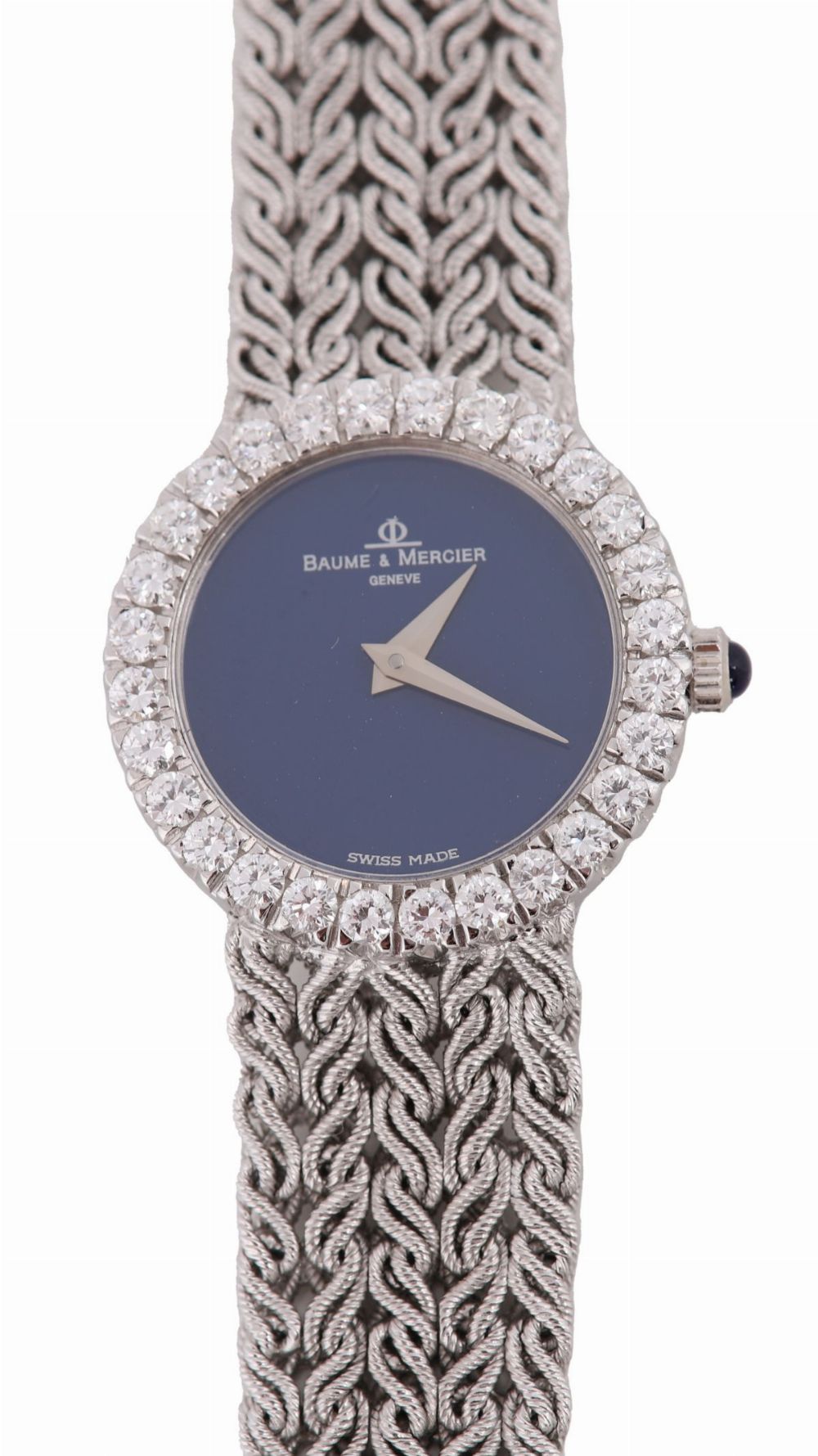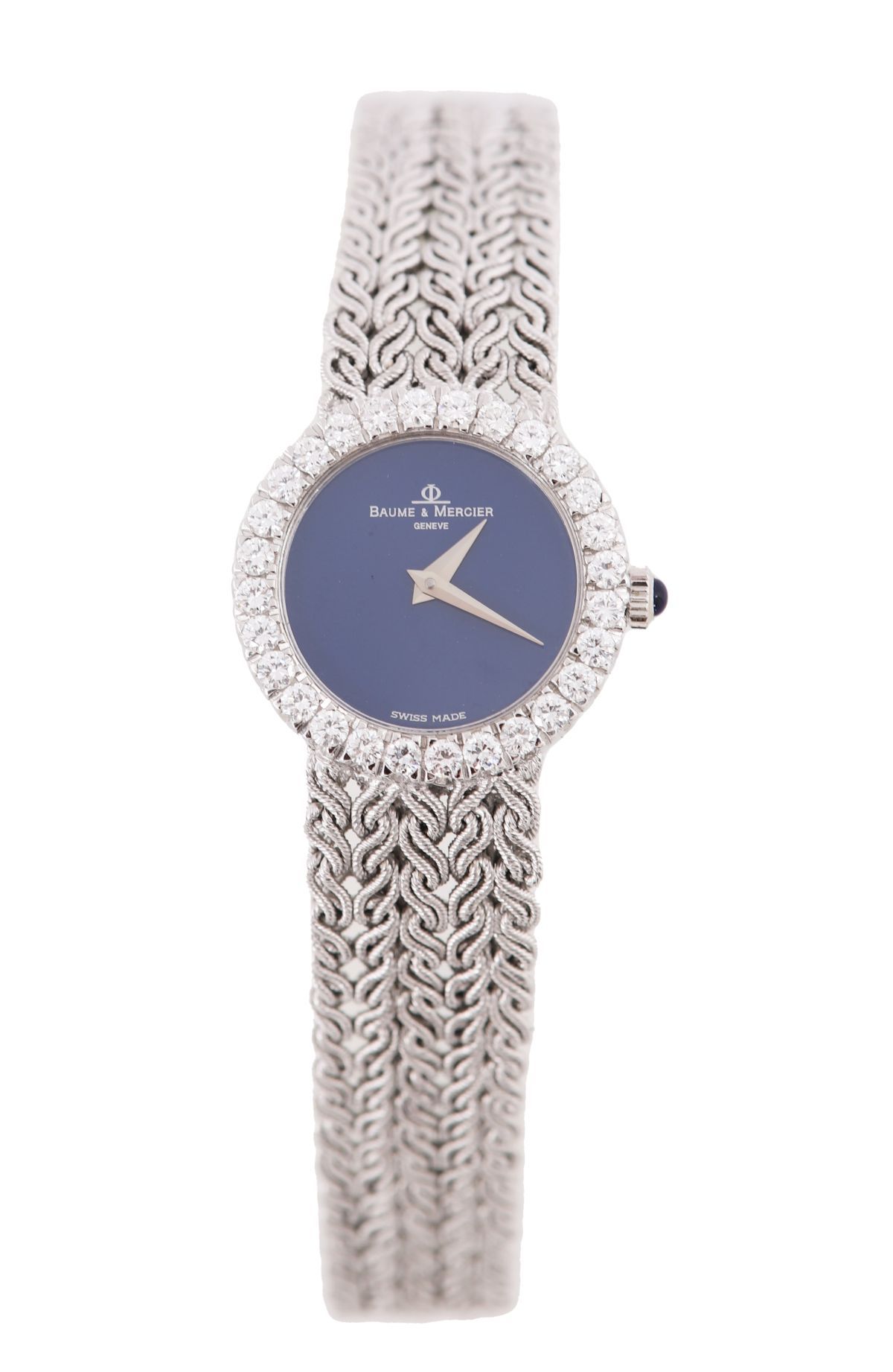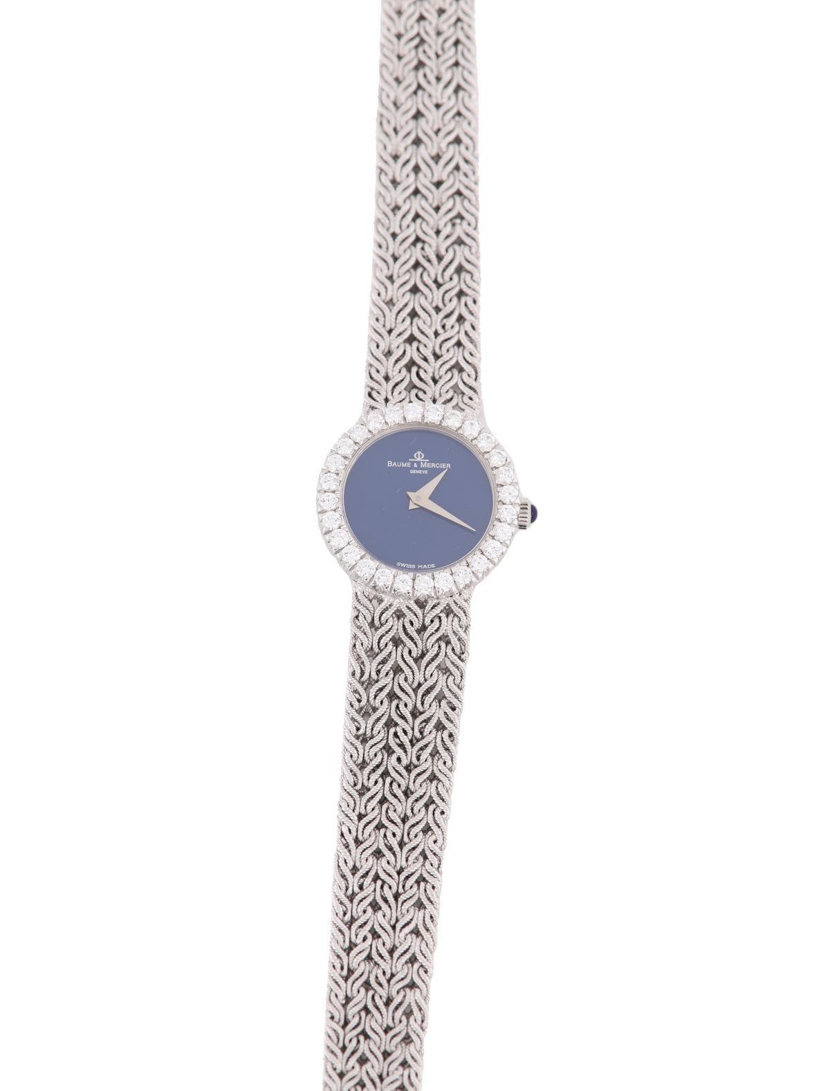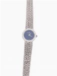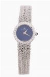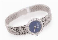 Circular case with claw set bezel containing twenty eight circular cut diamonds. The watch having sky blue enamel dial without any hour markers and white gold hour and minute hands. Fitted with 18 ct. white gold integral bracelet consisting of five strands of entwined rope style cabeling joined together and tapered to a ladder box clasp.