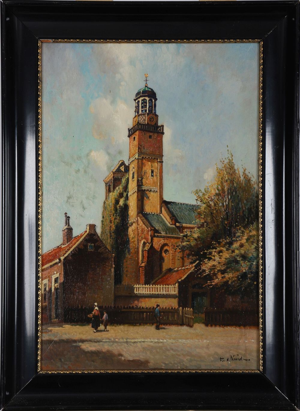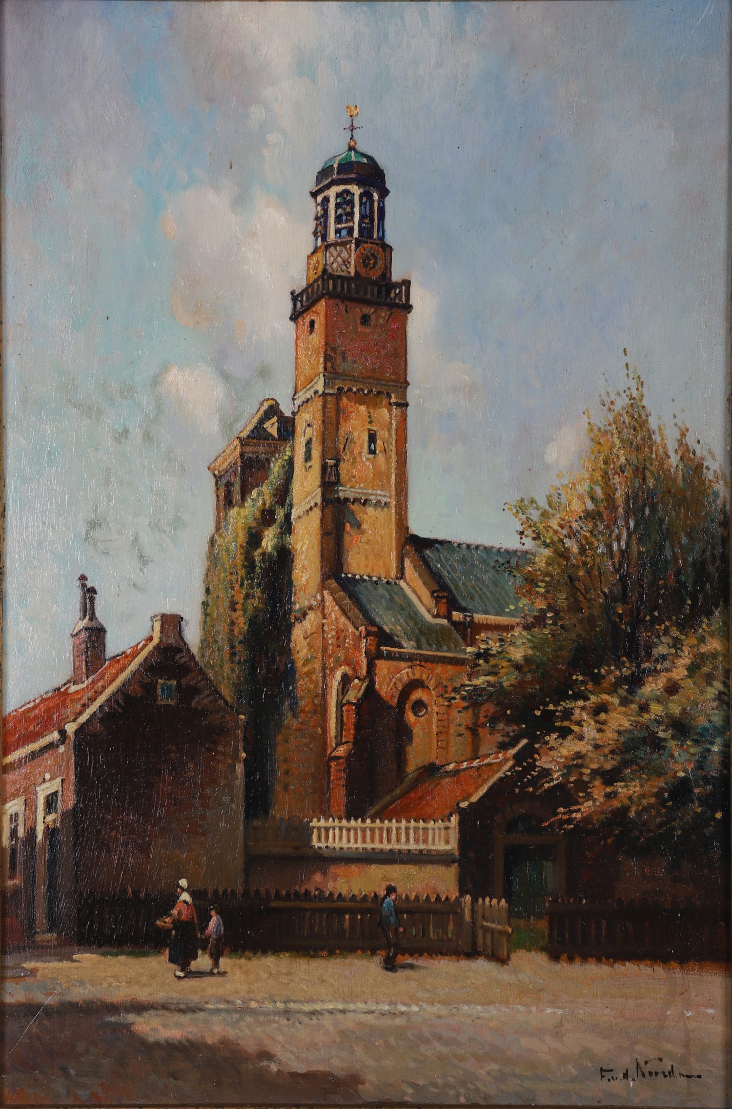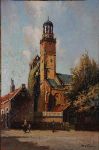 Oil on panel, depicting a continental church with a tall clocktower and surrounding figures. Executed in a realist style. Framed. Signed oil on panel.