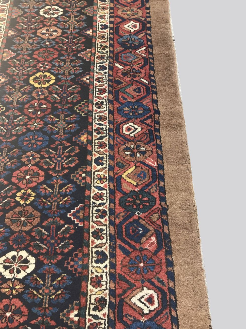 The navy field densely decorated with a repeat pattern of stylised rosettes, floral sprays, and star-shaped blossoms in terracotta, saffron, ivory, and deep blue. This richly patterned field is framed by a narrow ivory flowerhead stripe and a bold main border of lozenges and stepped medallions on a brick-red ground, incorporating traditional tribal symbols. (Vegetable dyed)